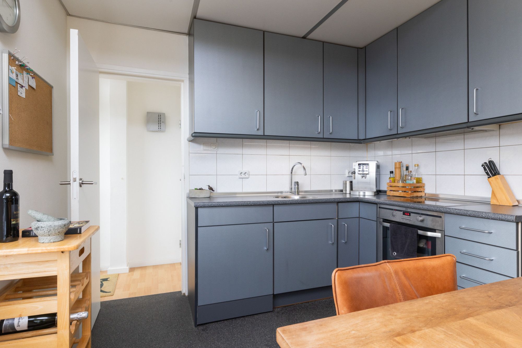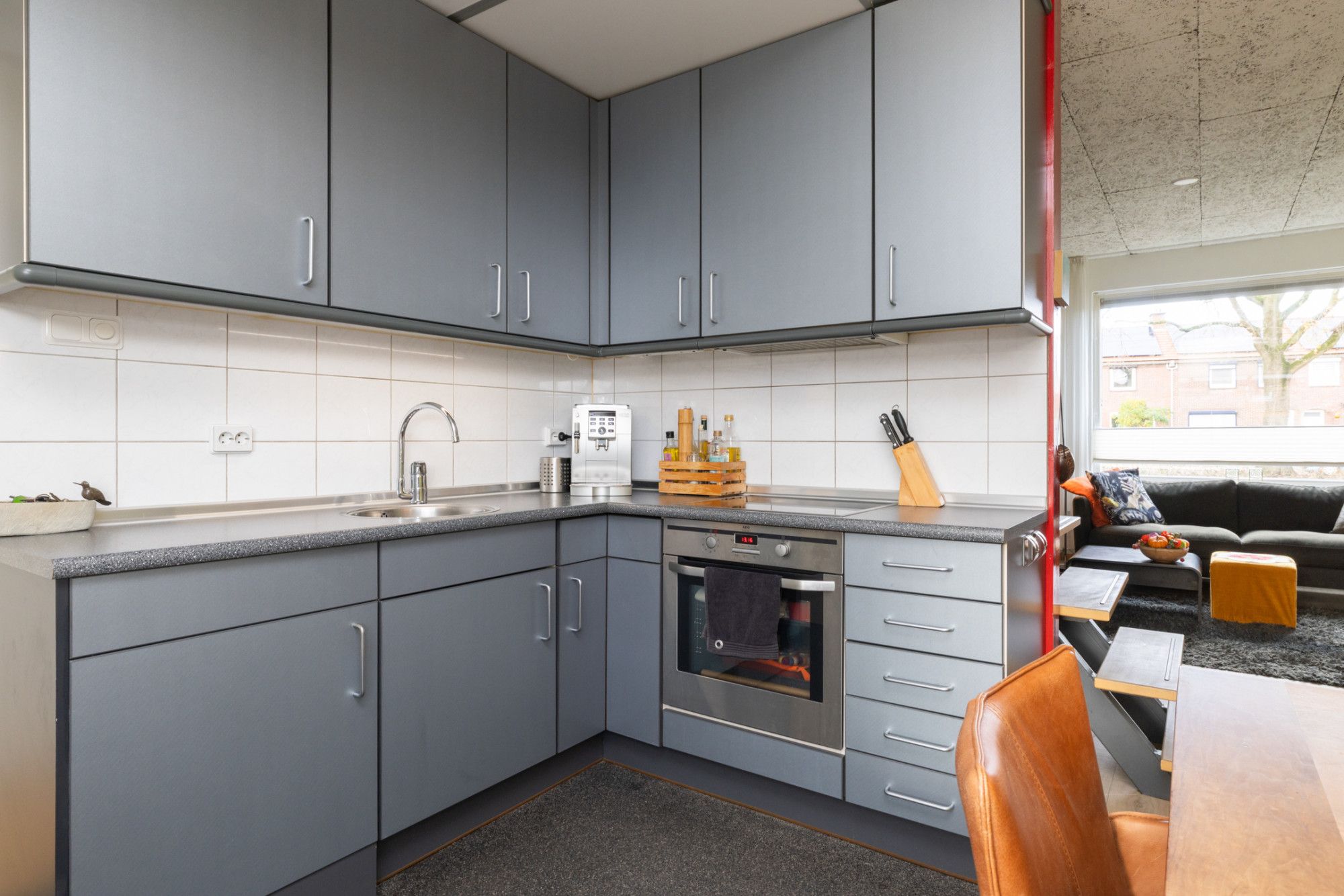 De halfopen keuken is uitgevoerd in een moderne grijze kleurstelling met rvs-grepen en beschikt over de nodige inbouwapparatuur. Via het tussenportaal zijn zowel het moderne gastentoilet met fonteintje als het overdekte terras bereikbaar – ideaal voor extra comfort en gemak.