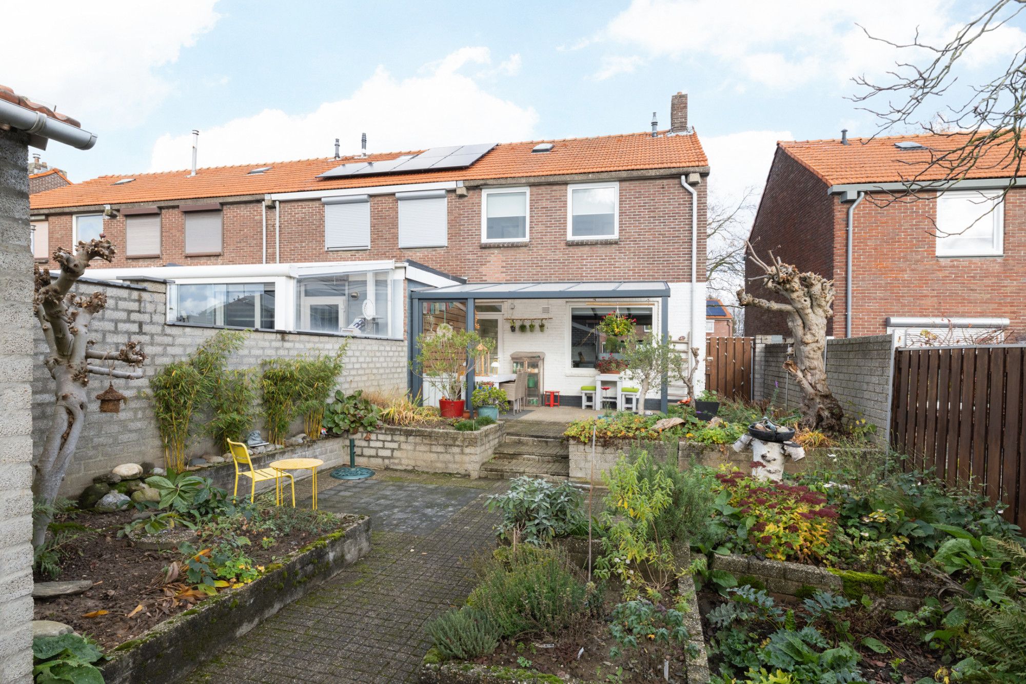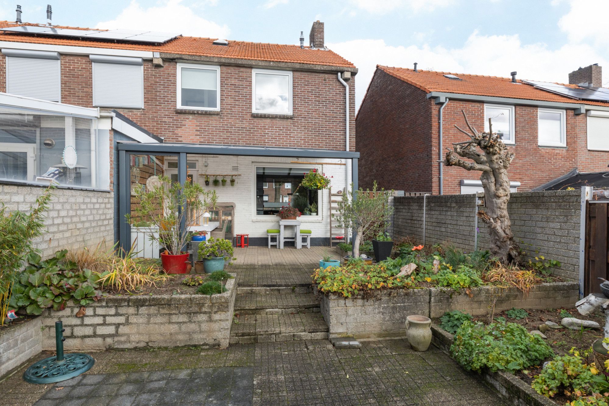 De diepe achtertuin met gunstige zuidligging is een heerlijke plek om te genieten: een terras met overkapping, aangelegde borders met aanplanting, een tweede terras met zithoek en een vrijstaande stenen berging zorgen voor veel gebruikscomfort. De tuin is bereikbaar via een gemeenschappelijk zijpad aan de voorzijde.