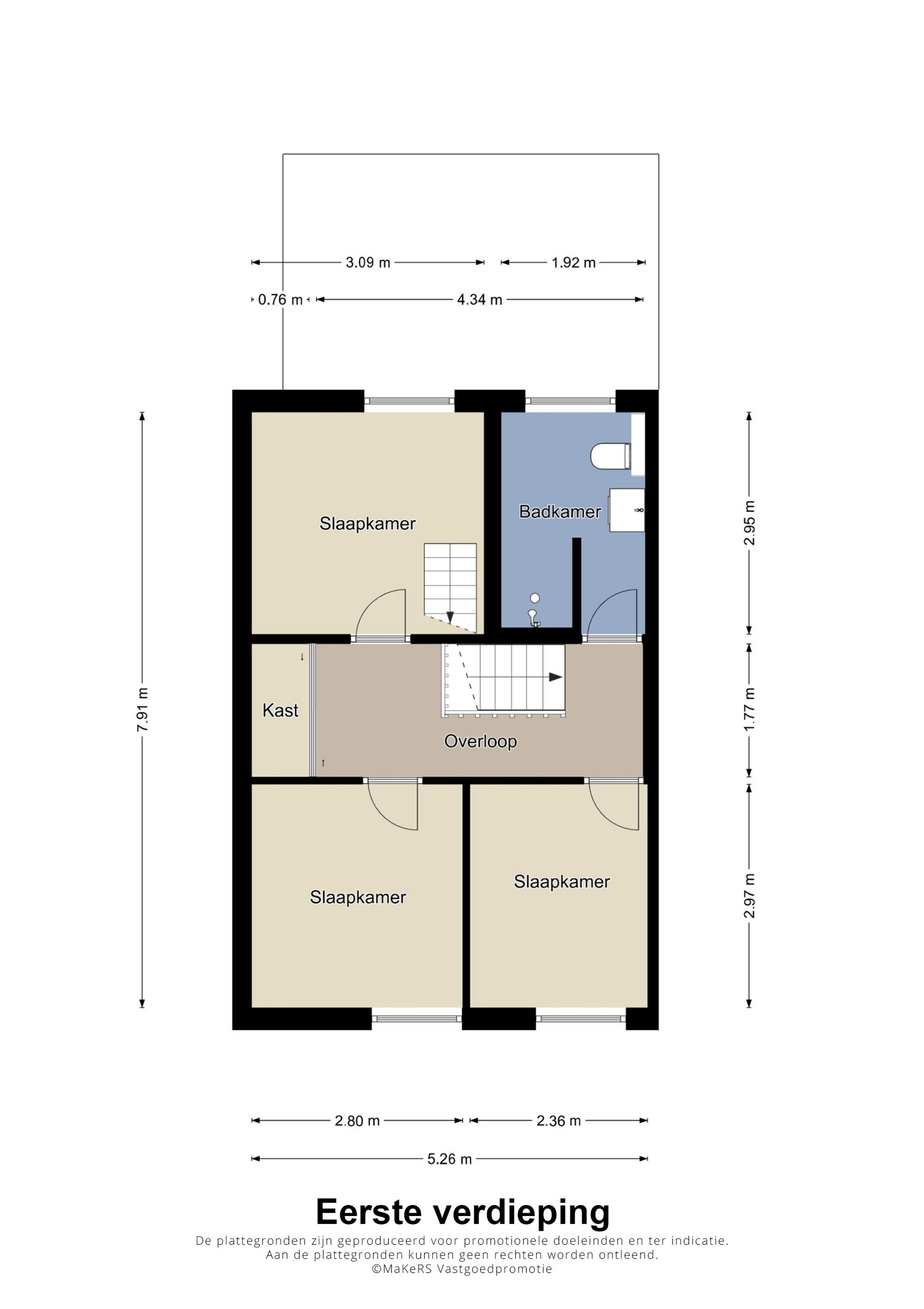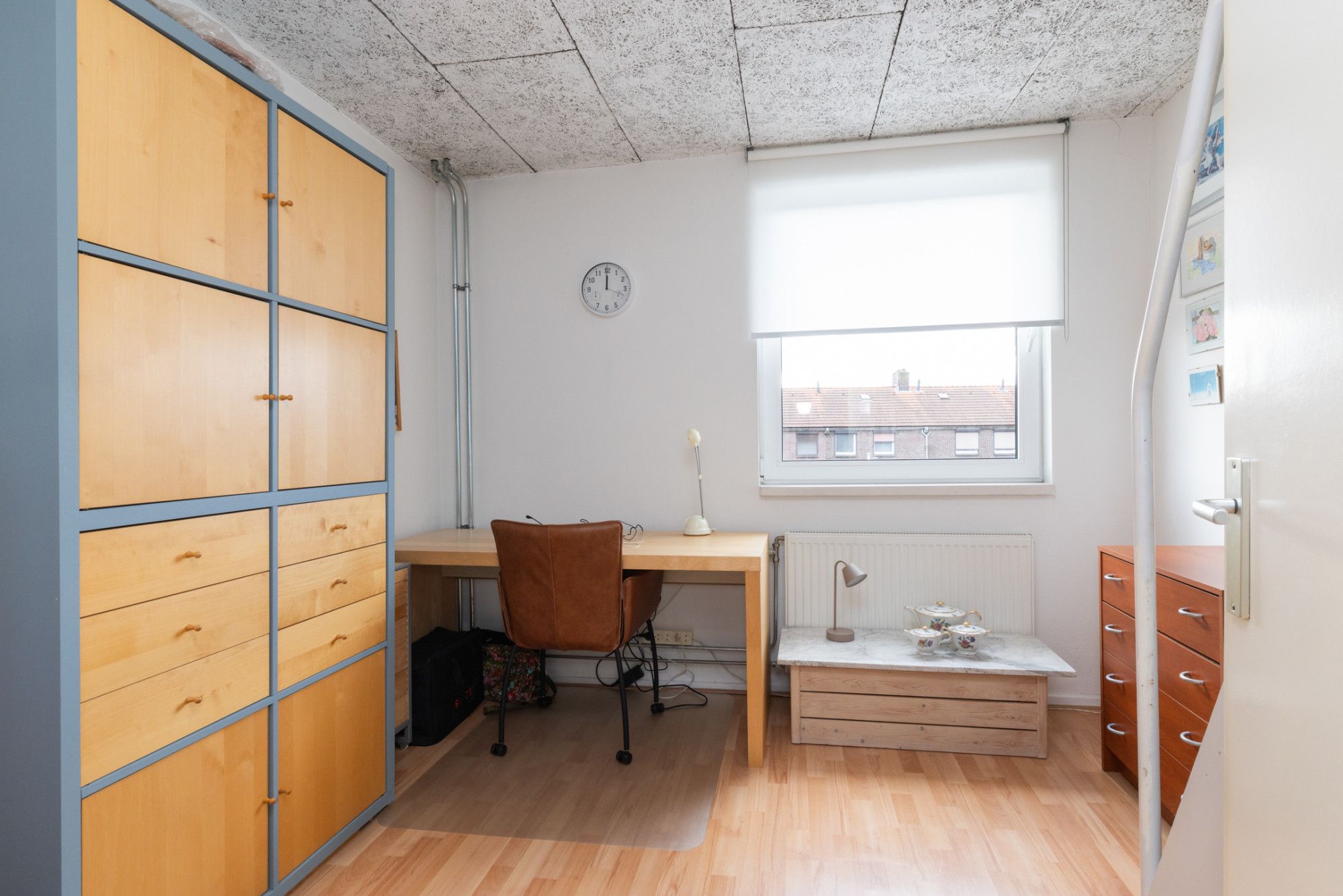 De derde slaapkamer, aan de linker achterzijde, doet dienst als hobby-/studeerkamer en heeft een vaste trap naar de zolder.