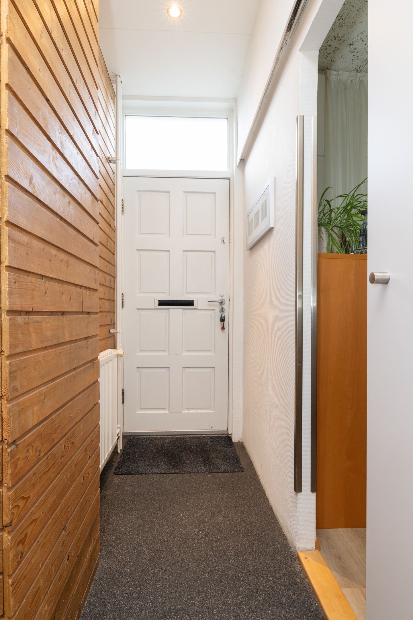 Hal / Entree en kapstok. Meterkast voorzien van 7 groepsinstallatie / 2x aardlekschakelaar / digitale meters met dag- en nachtstroomaansluiting. Toegang tot de kelder en de woonkamer.