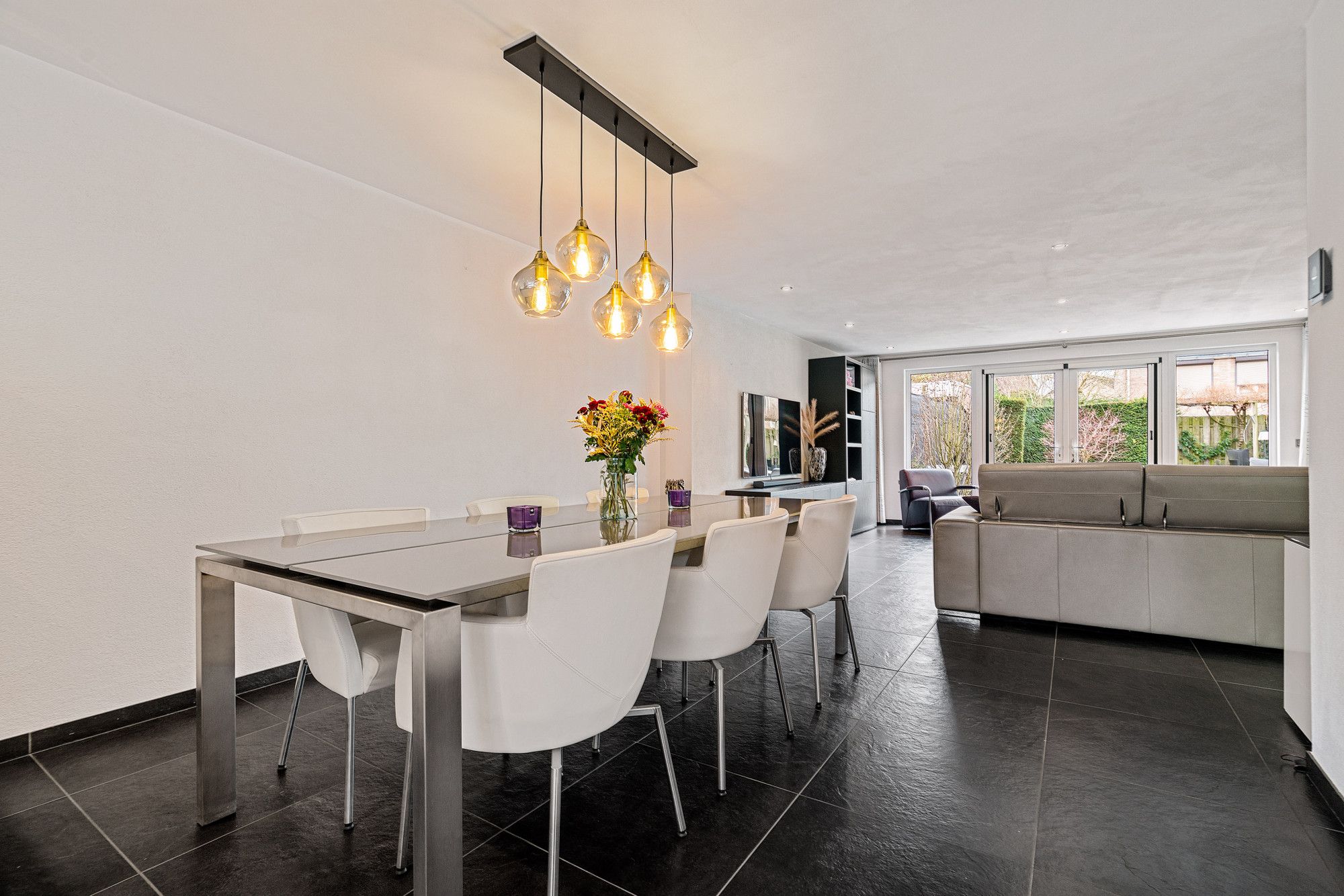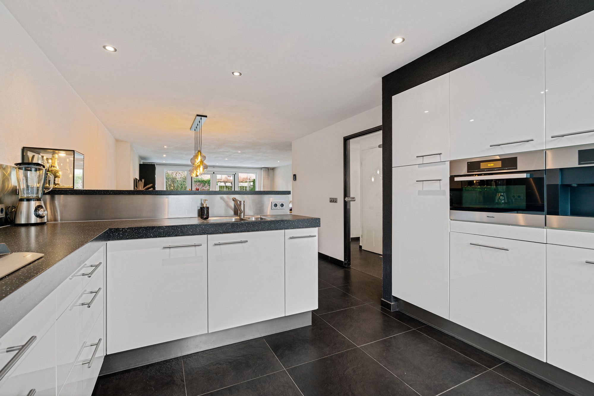 De eetkamer staat in open verbinding met de moderne keuken, die van alle gemakken is voorzien: 6-pits gasfornuis, afzuigkap, vaatwasser, combi-ovens, koelkast, diepvries en ingebouwd koffiezetapparaat. De woonkamer, eveneens verbonden met de eetkamer, is licht en ruim en biedt via openslaande deuren toegang tot de tuin. Tevens is hier een hor aanwezig.