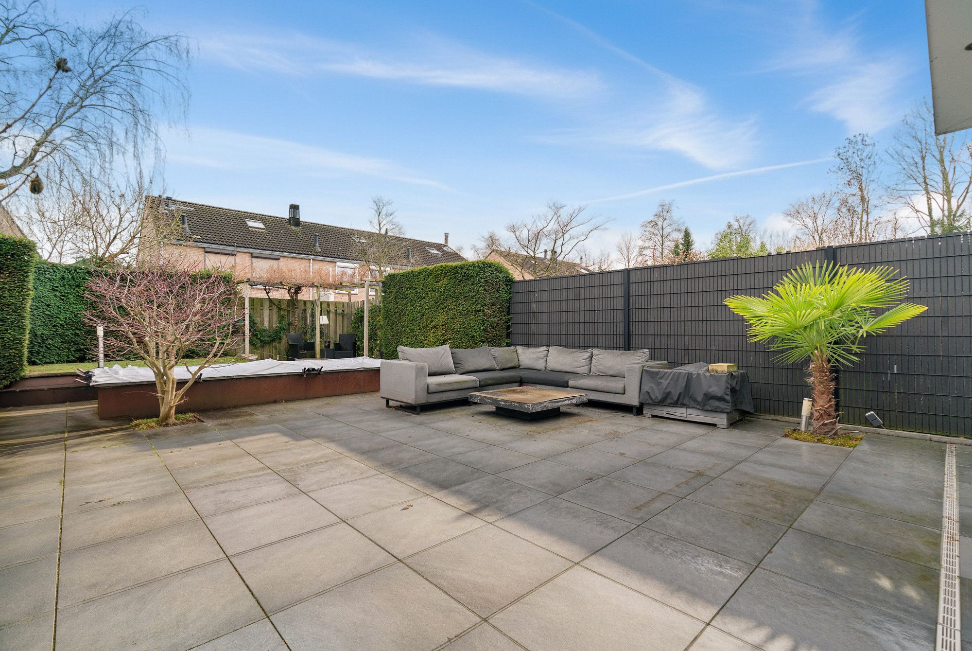 De voortuin is volledig betegeld en beschikt over een oprit en garage. De achtertuin combineert een groot betegeld (keramische tegel) zitgedeelte met een kleiner groen gedeelte. Via de garage is er eveneens directe toegang tot de tuin.