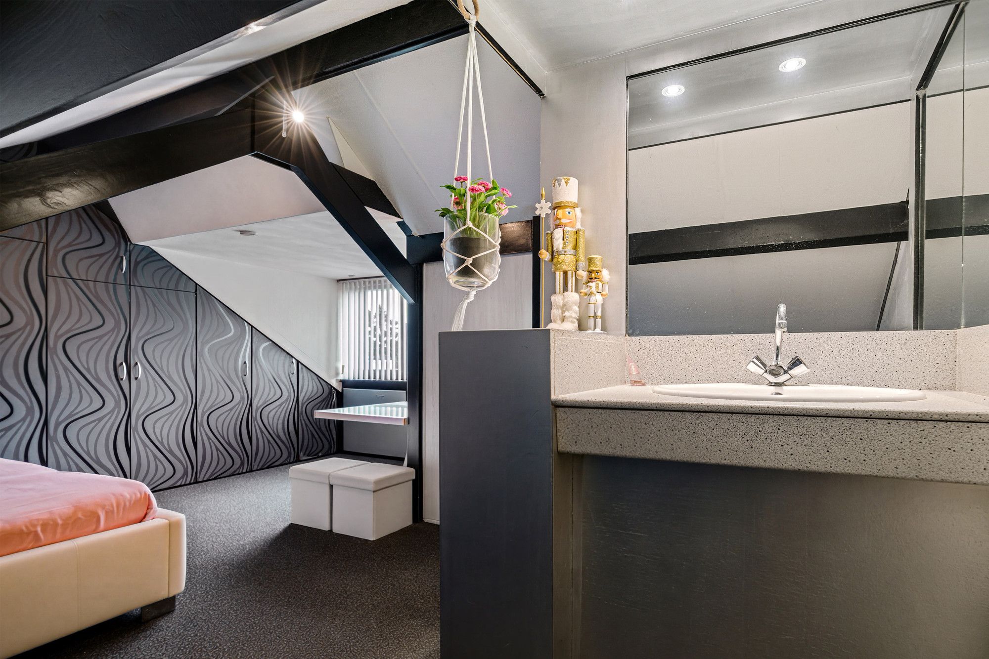 De tweede verdieping biedt een extra slaapkamer met wastafel en kastenwand. Vanuit deze slaapkamer is de cv-ruimte bereikbaar, waar de cv-ketel zich bevindt. Ook deze verdieping is voorzien van een grindvloer en kan dienen als extra woonruimte of slaapkamer naar wens.