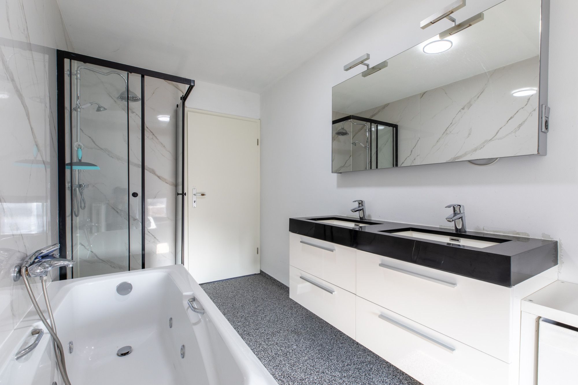 Badkamer (3.94 x 1.93 m) geheel betegeld met dubbele vaste wastafel met badmeubel, ligbad en douche.