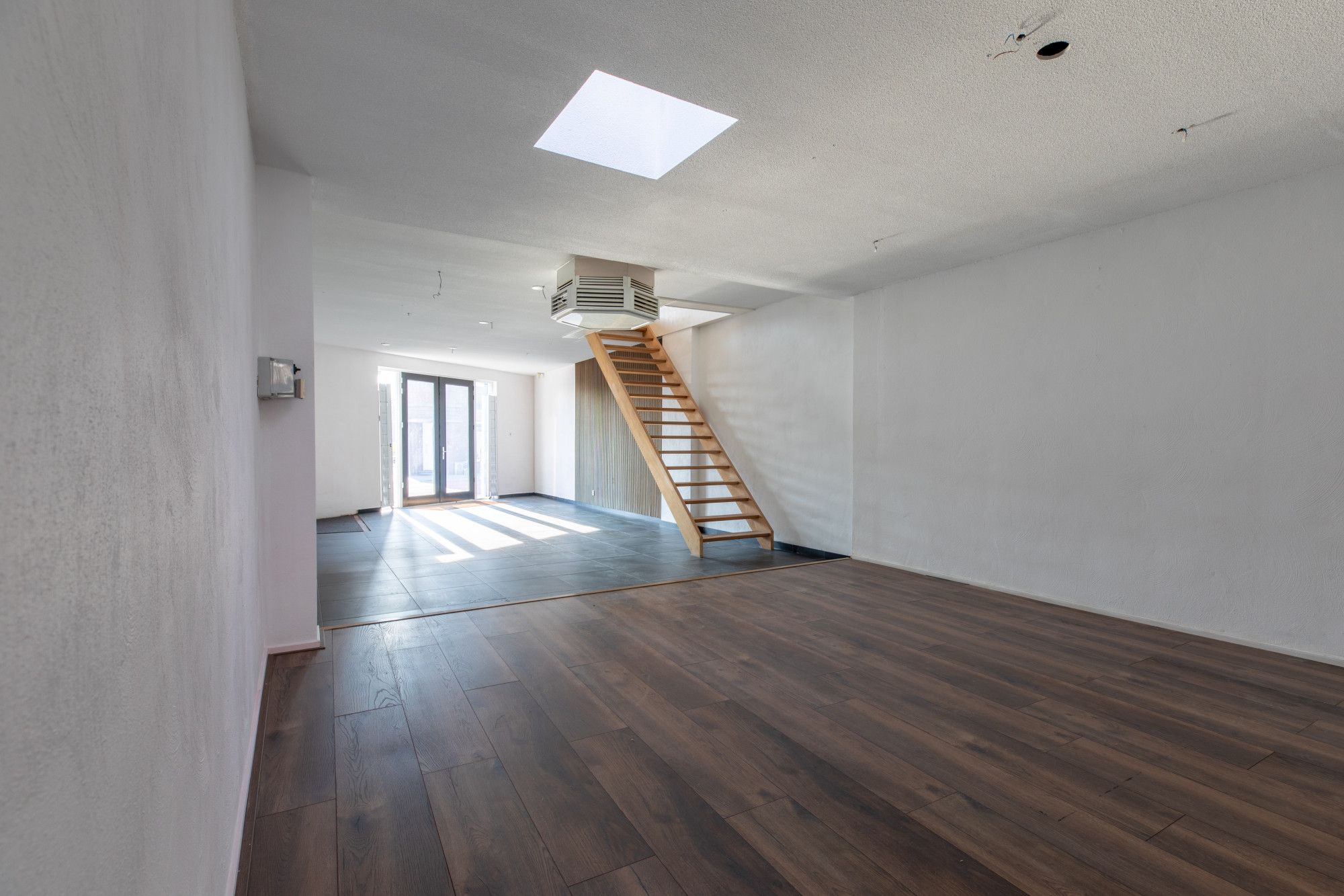 Woonkamer (8.91 x 5.73 m) voorzien van laminaatvloer met toegang naar dakterras (6.62 x 5.14 m). Via het dakterras is er nog een berging (4.84 x 2.09 m) te bereiken. Via metalen trap kan men de Hommerterweg bereiken.