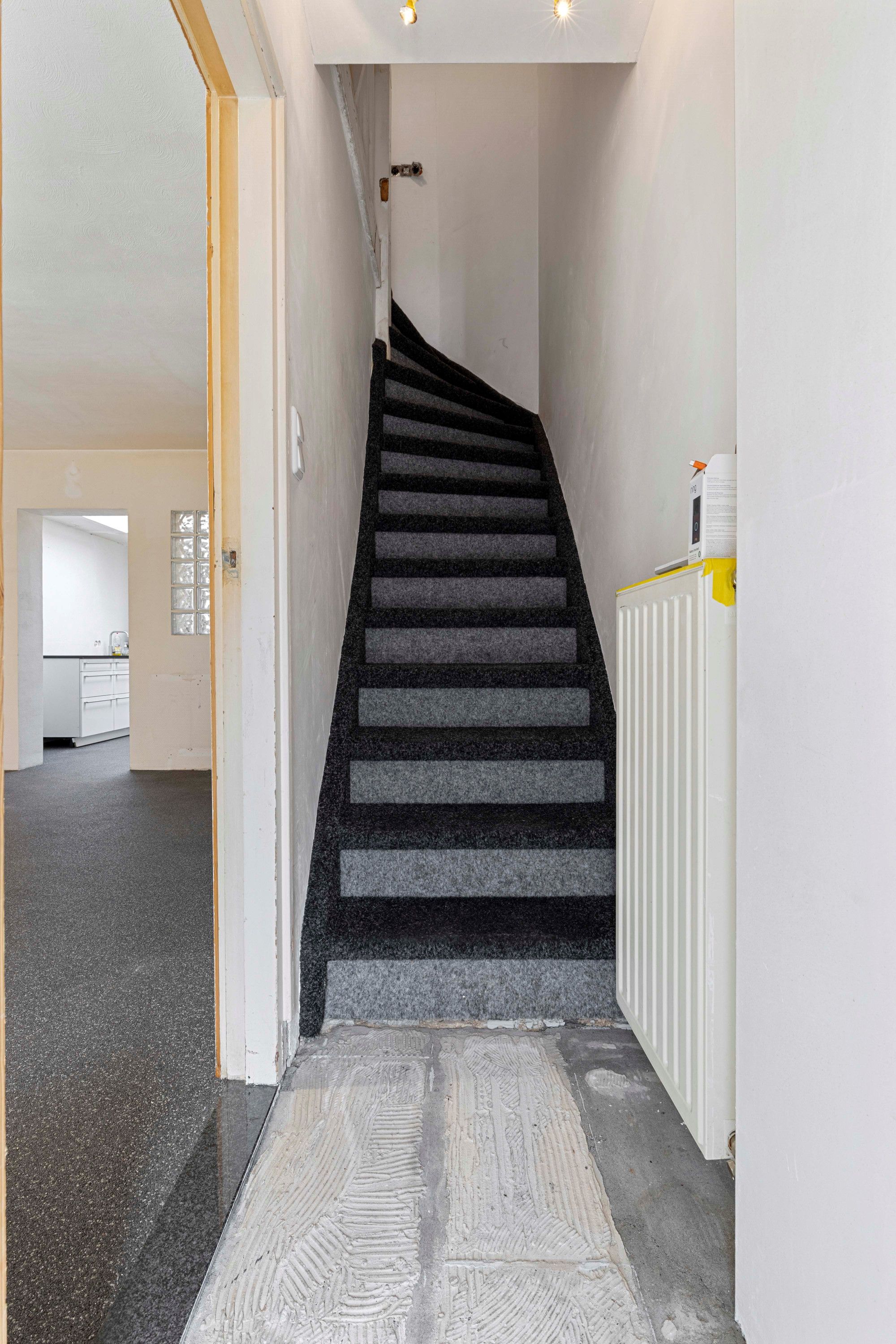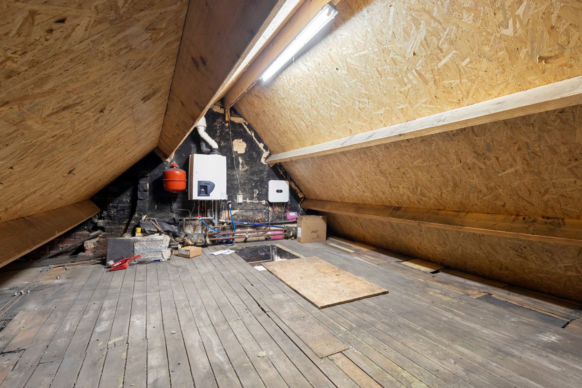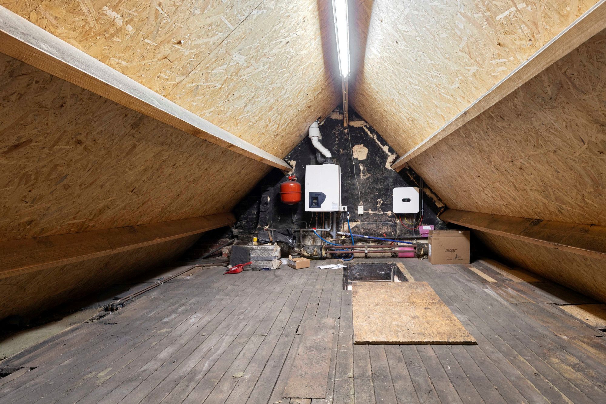 Steile trap naar zolderverdieping. Ruimte voor verdere uitbreiding van de woonoppervlakte. Moderne CV installatie.
