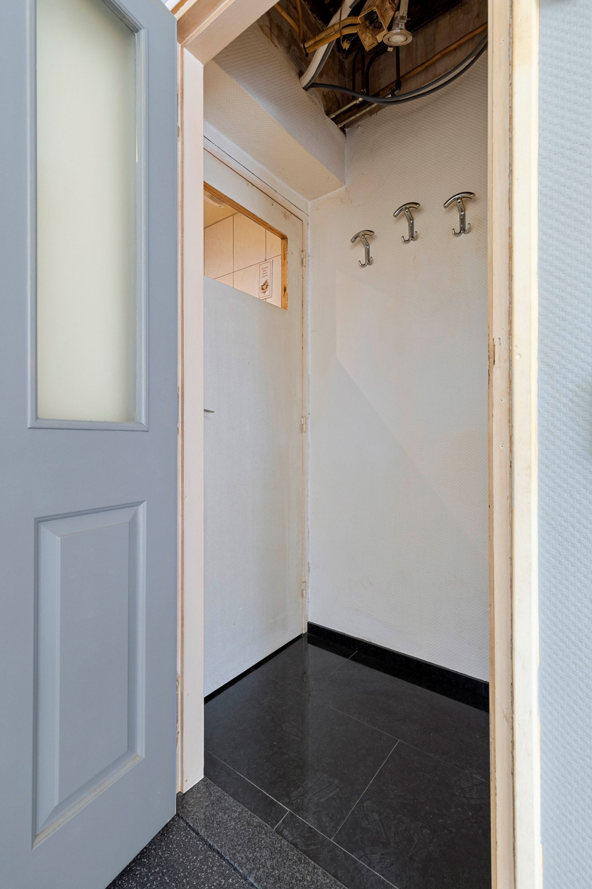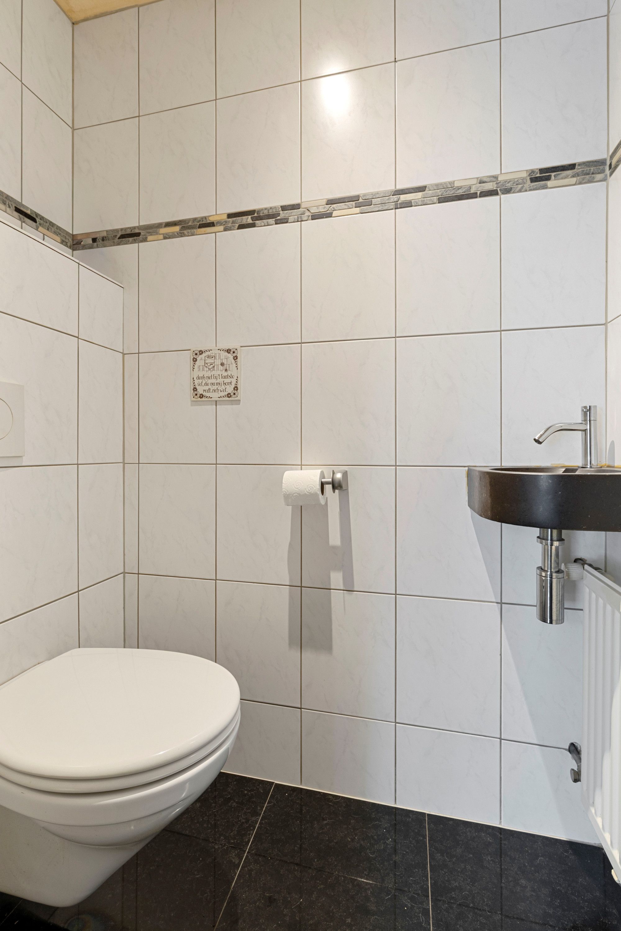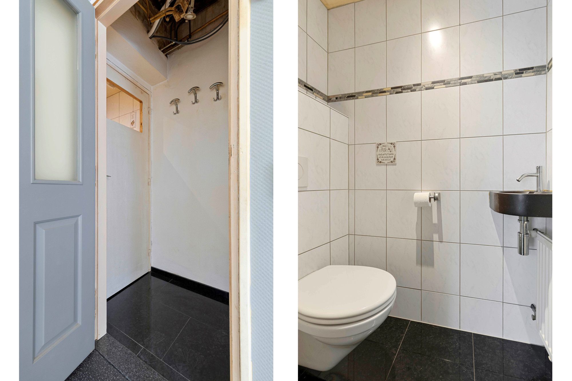 Hal met vernieuwde meterkast. Voordeur is vernieuwd. Tussenhal. Moderne geheel betegelde toiletruimte met wandcloset en fonteintje. De woonkamer is voorzien van een airconditioning en plafondafwerking met inbouwspots. De keuken in de aanbouw is voorzien van een lichtkoepel en een moderne witte keukeninstallatie met veel lades en inbouwapparatuur waaronder grote Smeg inductie kookplaat, grote Bosch combi-oven en AEG vaatwasser. Ruime berging met aansluitpunten voor was-apparatuur. Toegang naar de pationtuin. De tuin is voorzien van een overdekt terras en ook via een brandgang achterom bereikbaar.