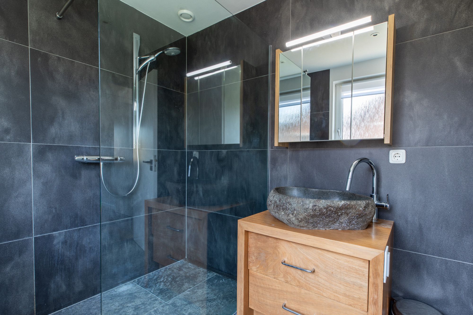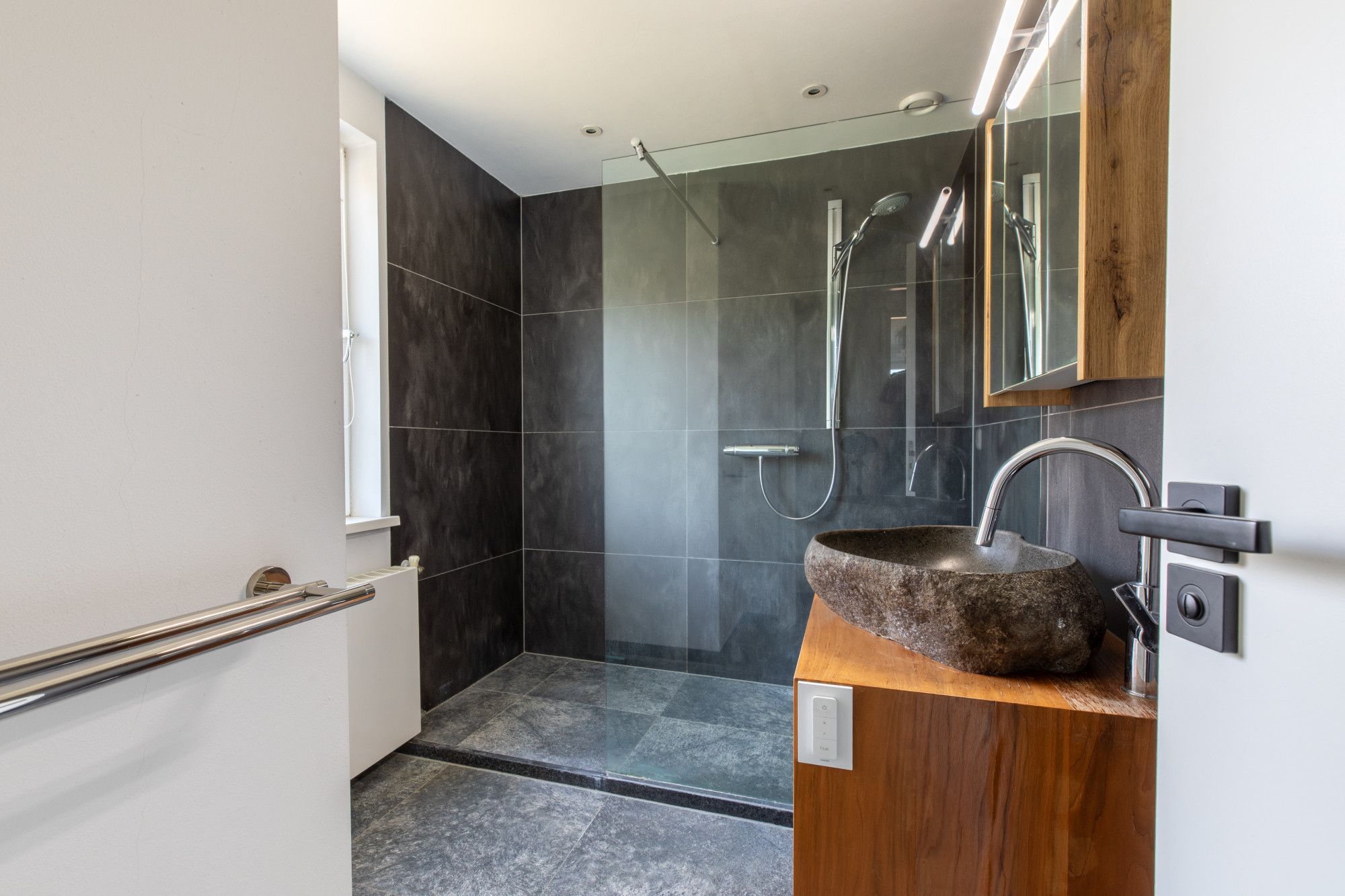 Riant moderne badkamer (3.03 x 2.07 m) geheel betegeld met vaste wastafel met badmeubel, ruime inloopdouche en inbouwverlichting.
