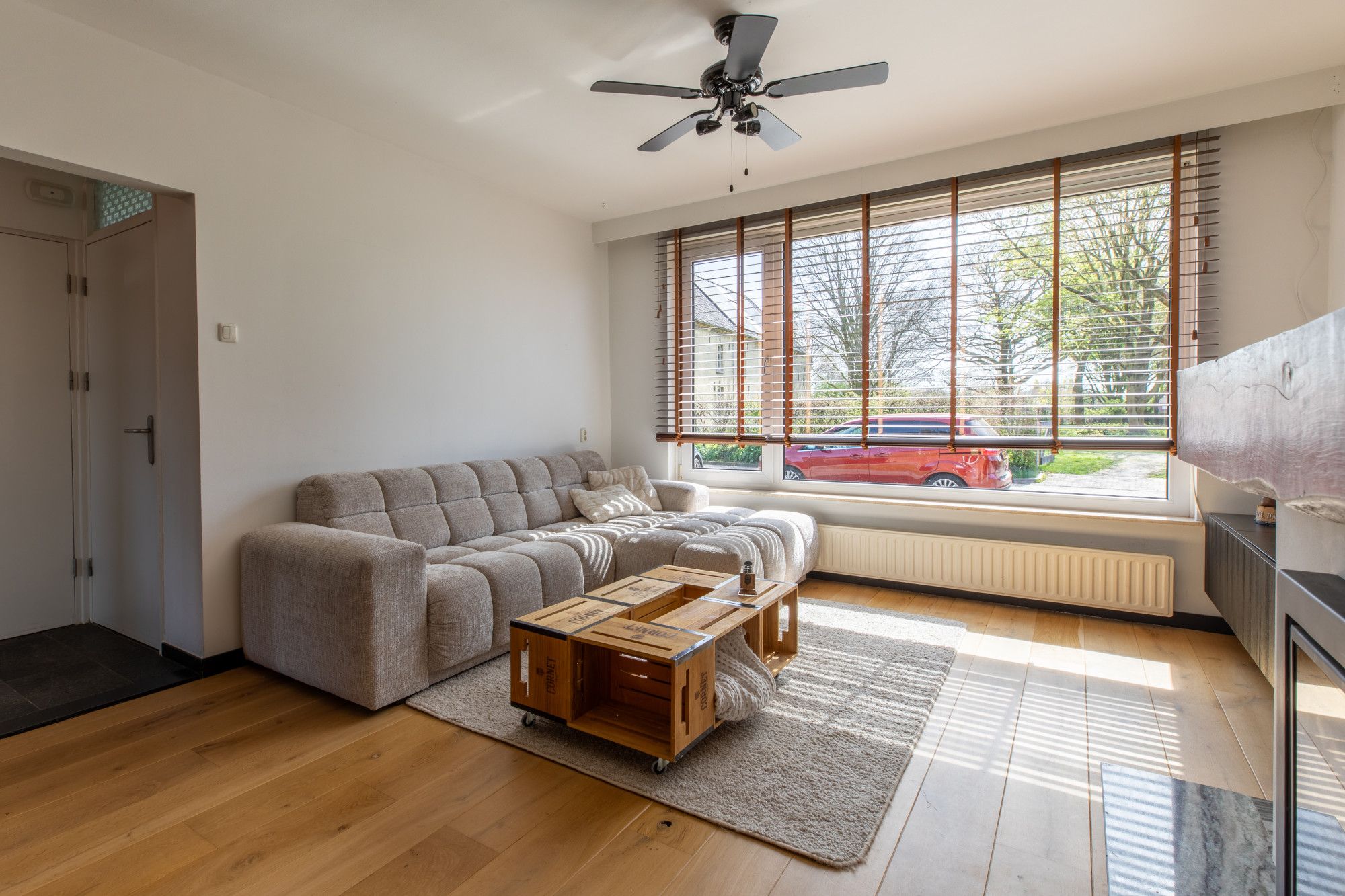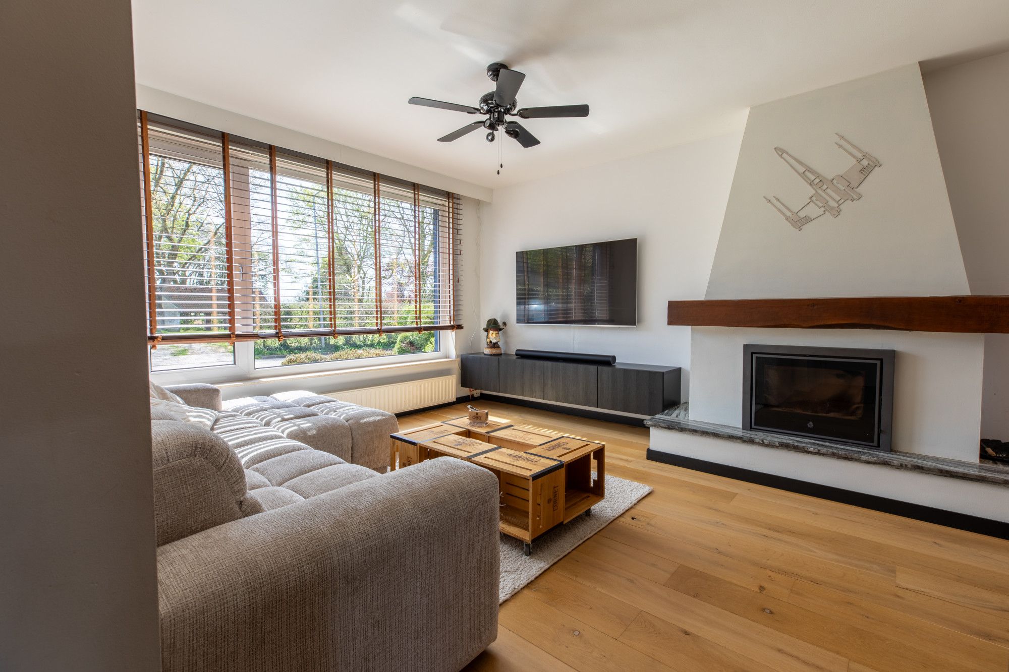 De woonkamer (8.10 x 3.91 m) voorzien van parketvloer en met hout kachel.