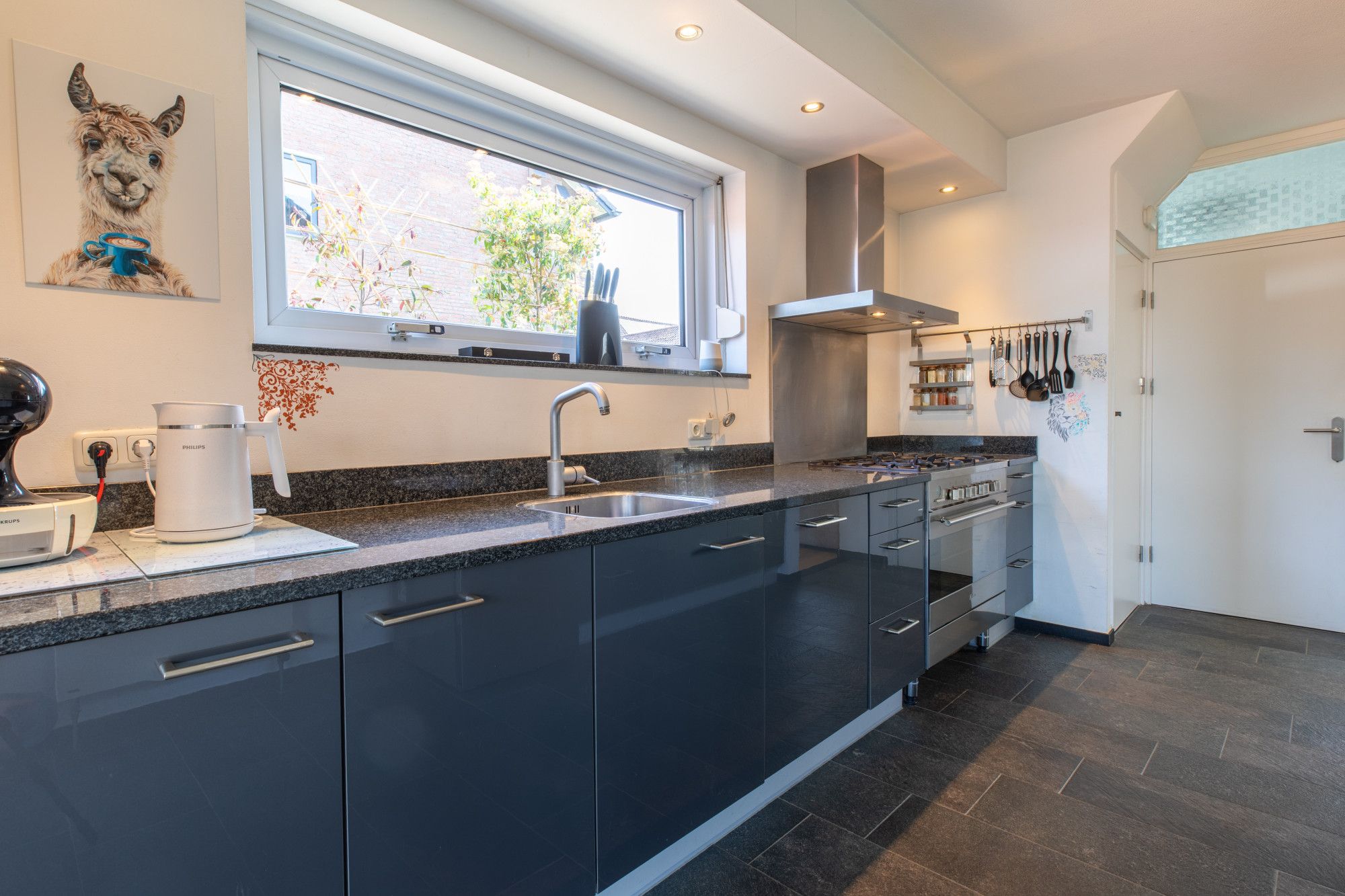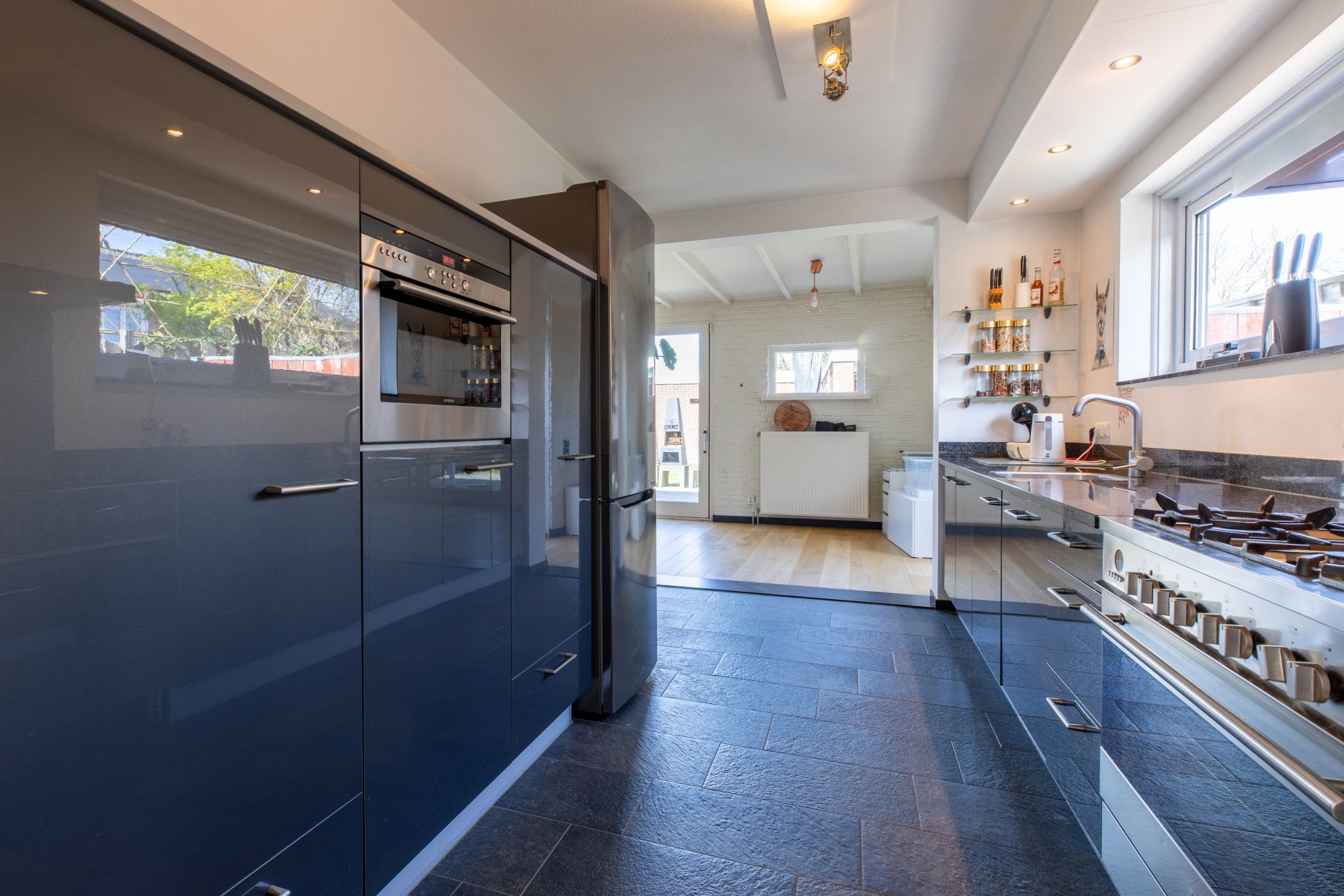 Keuken (5.07 x 2.703 m) met degelijke keukeninrichting, granieten werkblad en voorzien van diverse apparatuur waaronder een 6 pits gaskookplaat, vaatwasser, oven, combi oven, koelkast, vriezer en RVS afzuigkap. tevens bevindt zich hier nog een bergkast onder de trap.