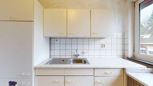 Closed kitchen (4.00 x 3.00 m) with tiles and equipped with a corner unit with the following built-in appliances: hob, extractor hood, oven and dishwasher.