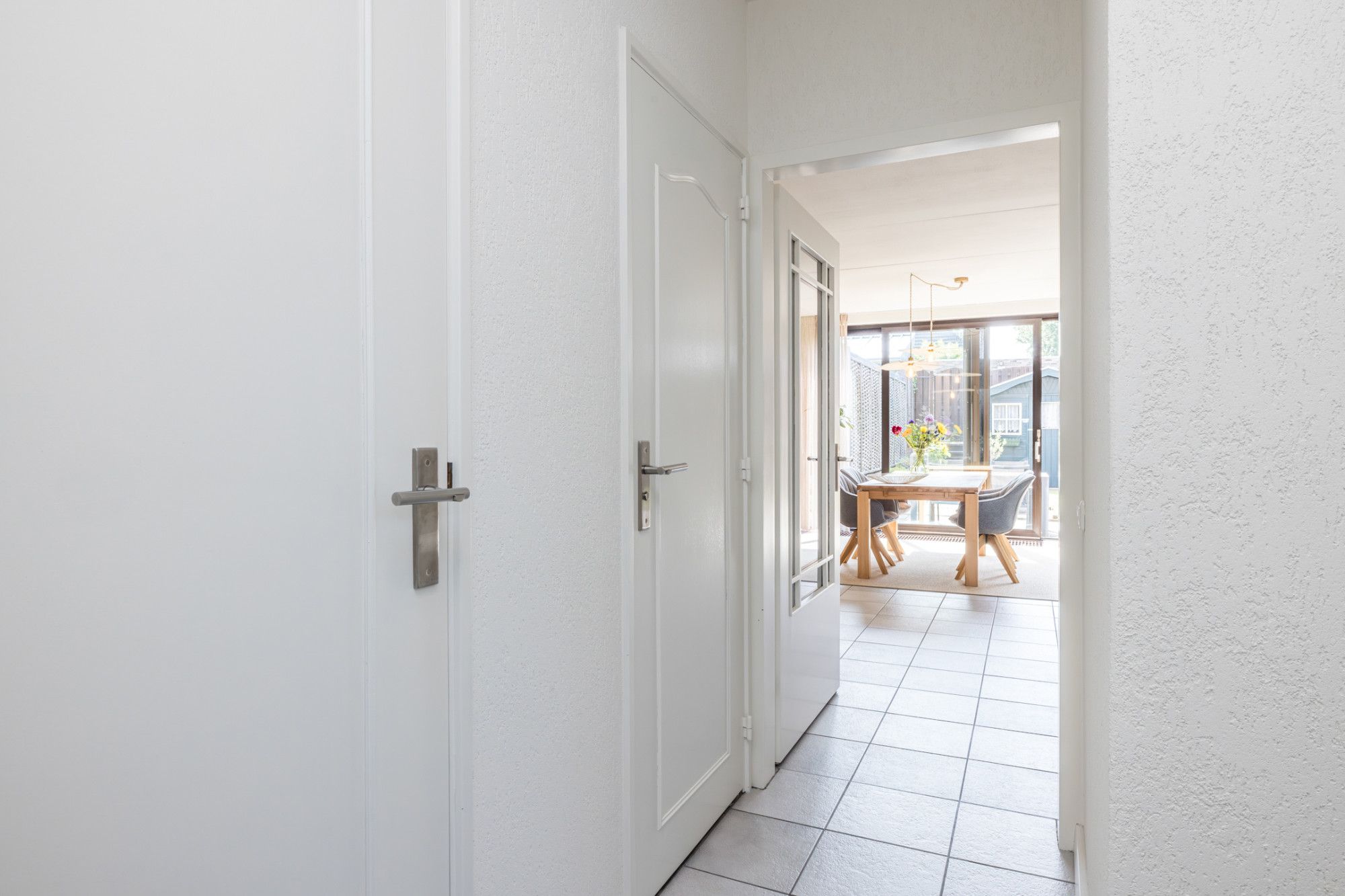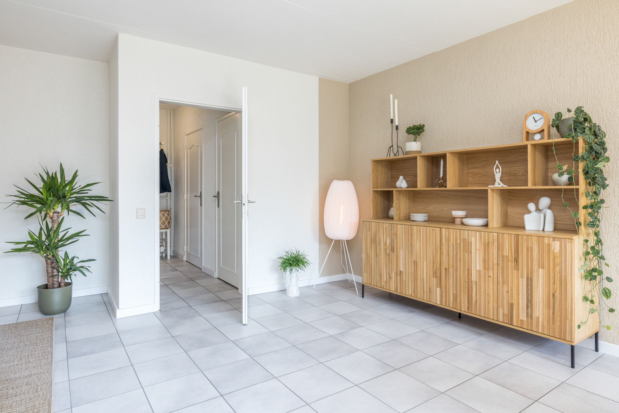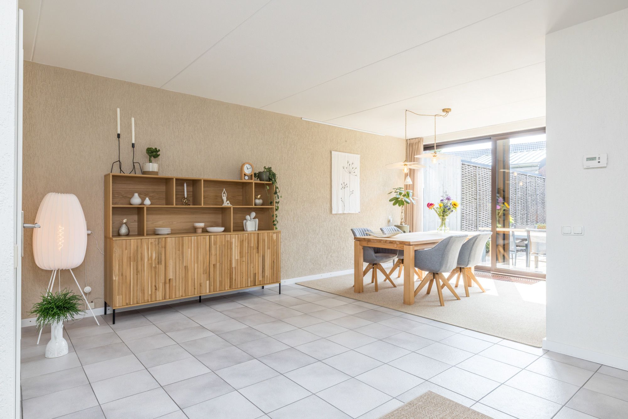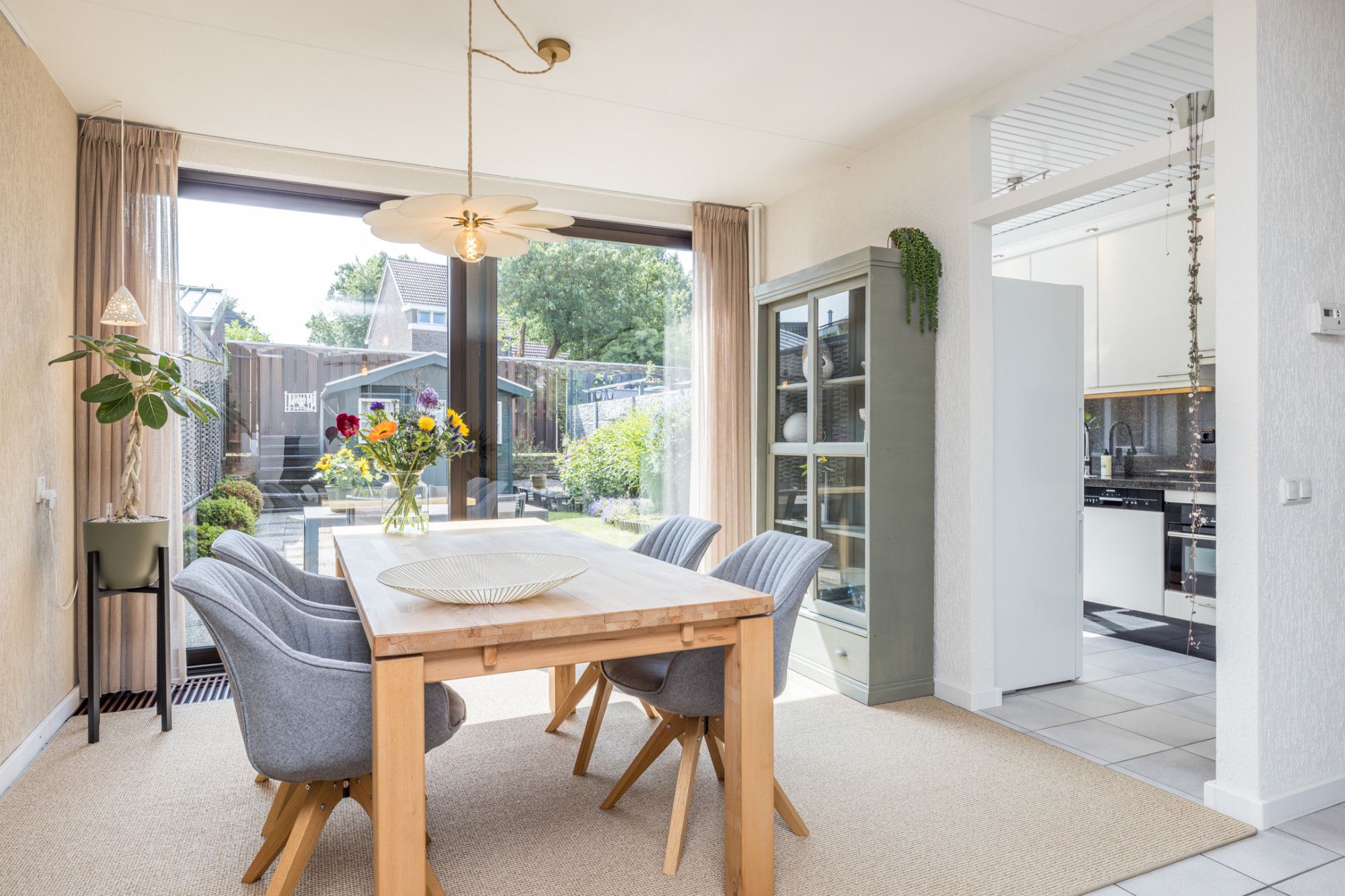 Entree- hal met moderne toiletruimte, v.v. zwevend closet en fonteintje, en inpandige berging (1,90 m x 1,26 m), v.v. een wateraansluiting. De hal biedt toegang tot riante living (ca. 33 m2), verdeeld in een woon- en eetkamer v.v. tegels. Vanuit de eetkamer heeft men een open verbinding naar de keuken. De half open keuken (2,86 m x 2,06 m) is v.v. de navolgende apparatuur; 4-pits keramische kookplaat, combi-oven, vaatwasser en afzuigkap. Middels schuifpui heeft men vanuit de living toegang tot de tuin.