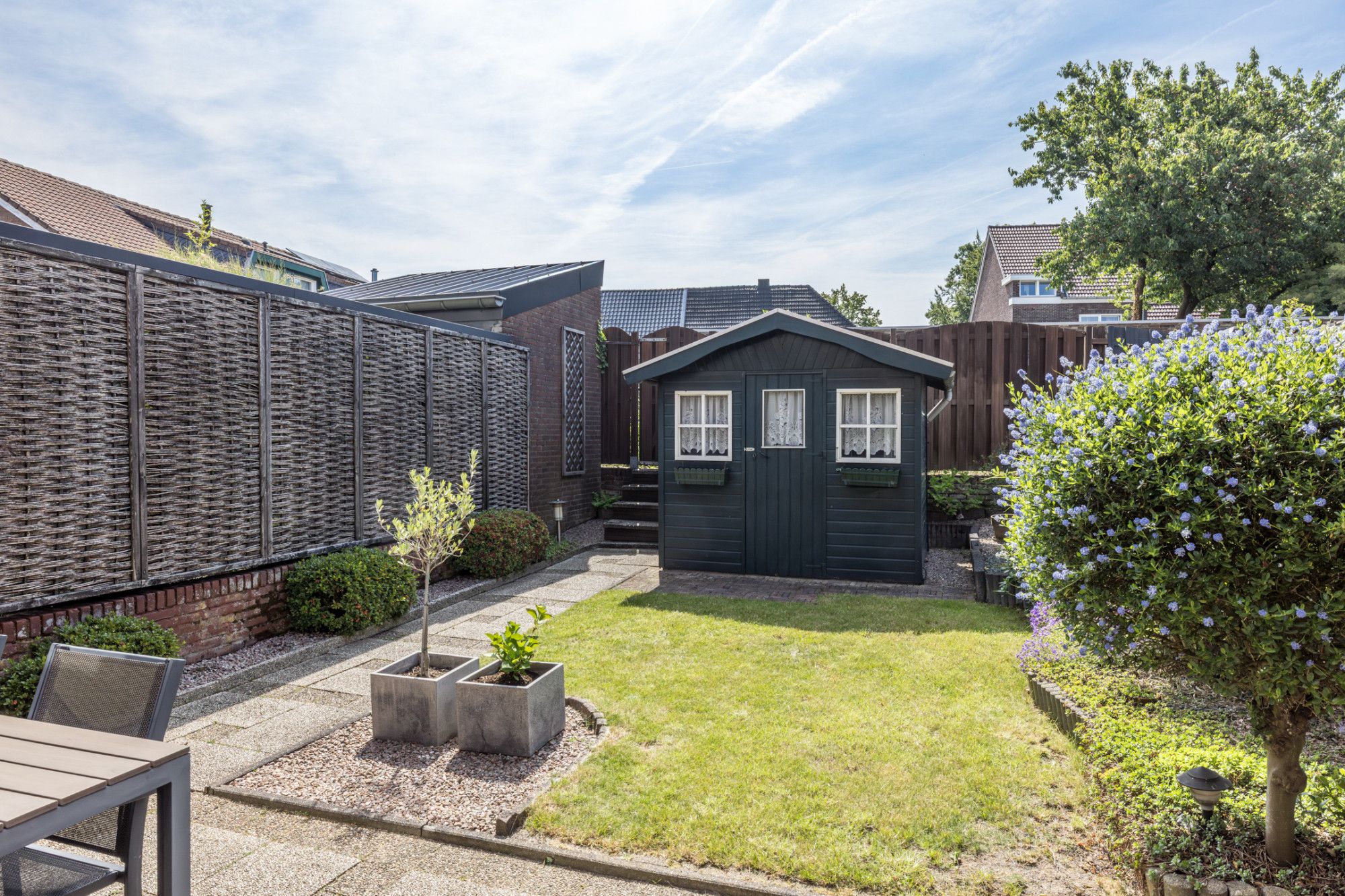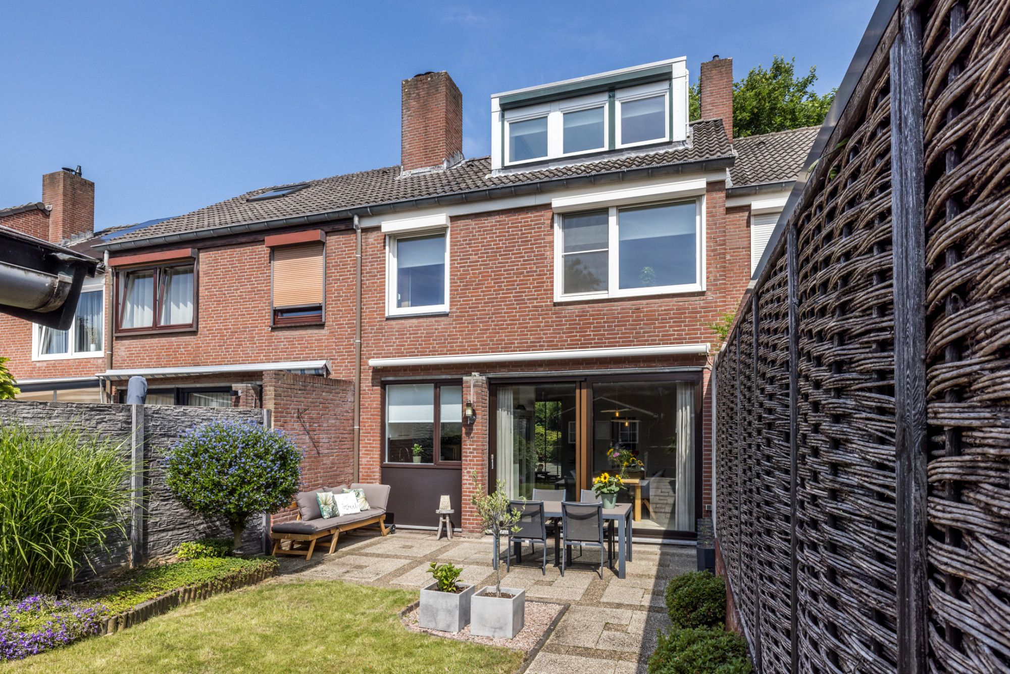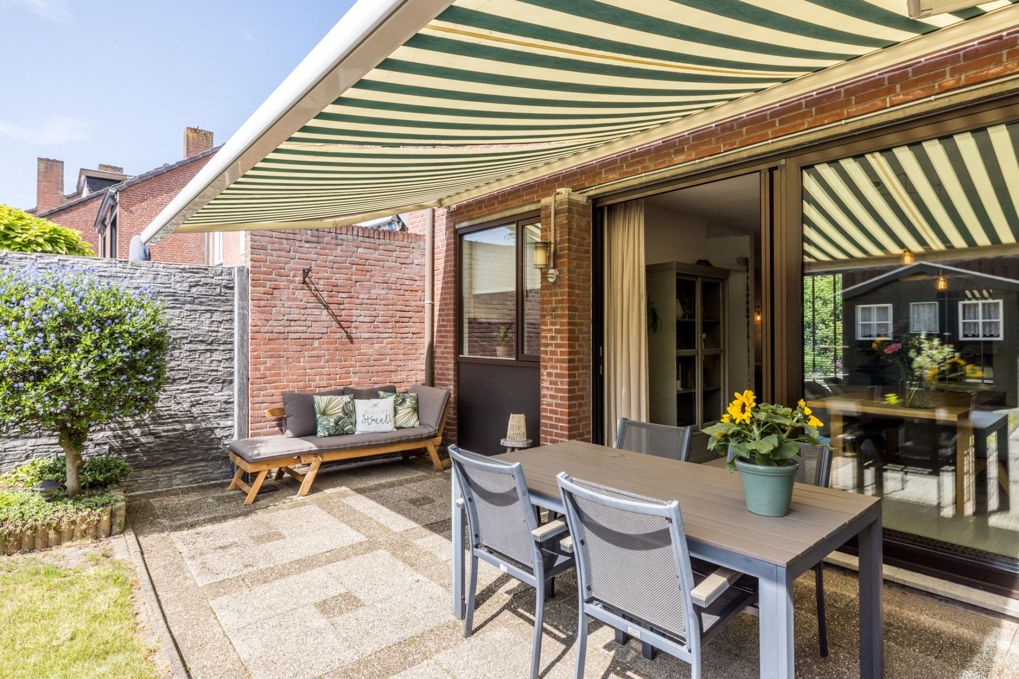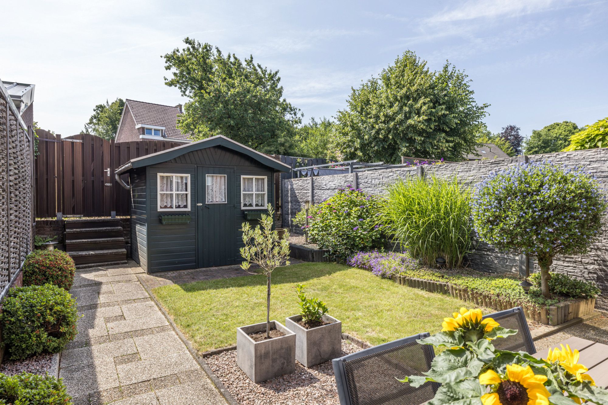 De zonnige, verzorgde, onderhoudsvriendelijke achtertuin v.v. een terras (elektrisch bedienbaar zonnescherm) biedt toegang tot tuinhuis (1,90 m x 2,28 m).