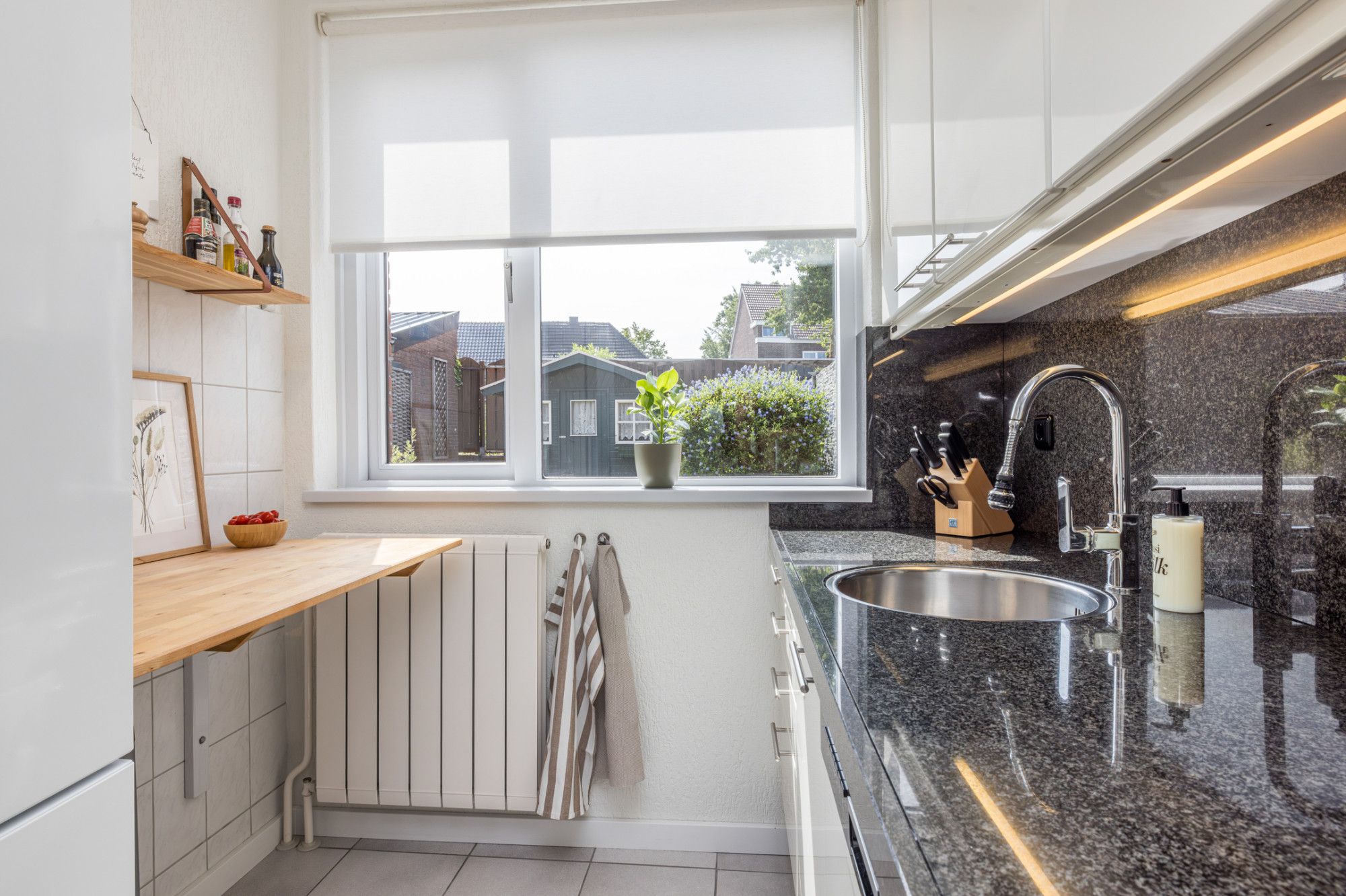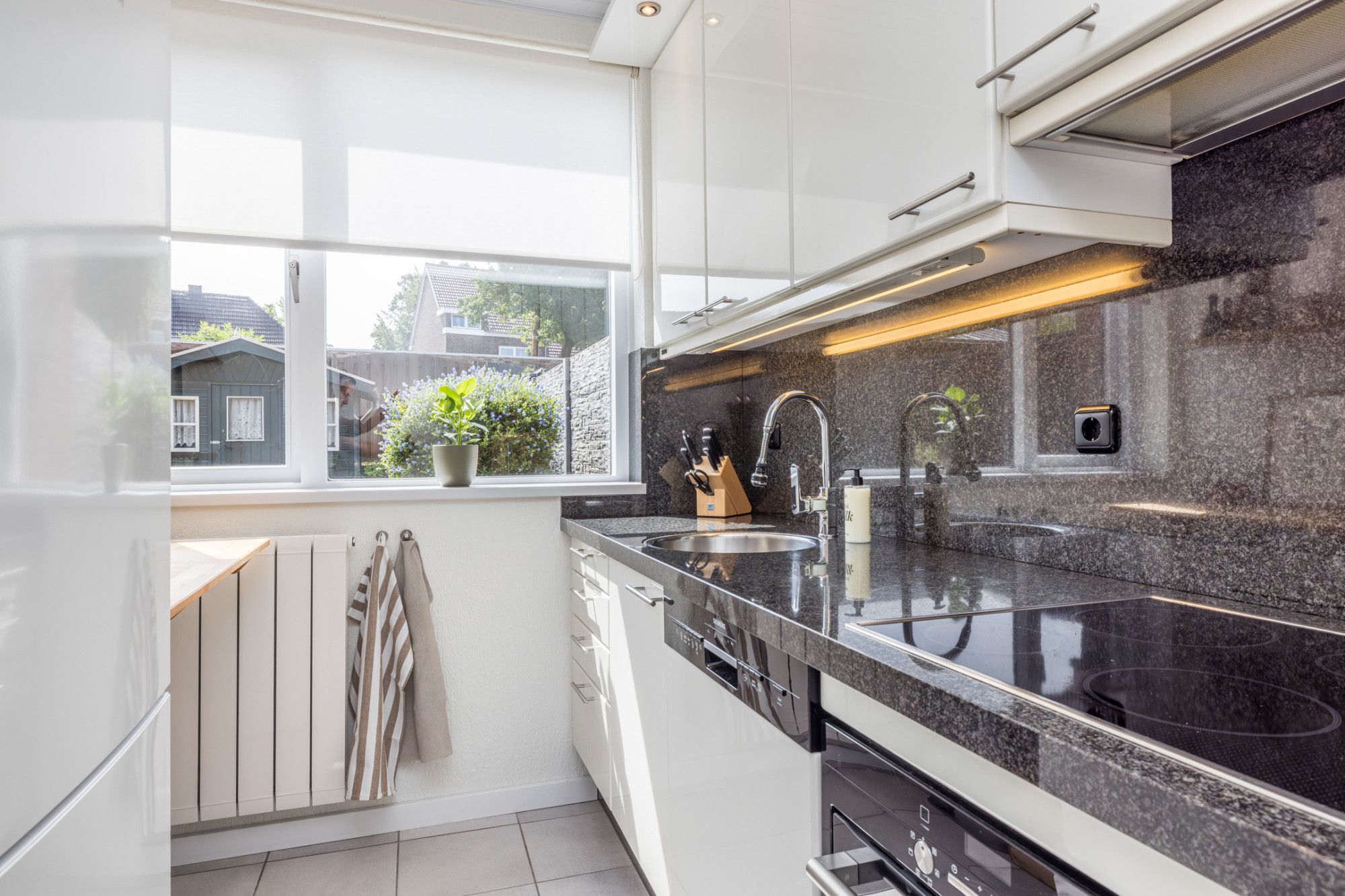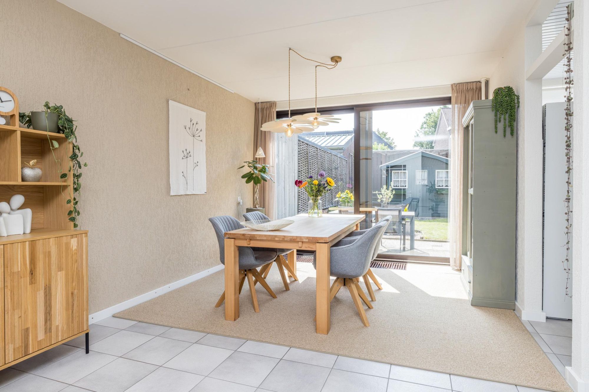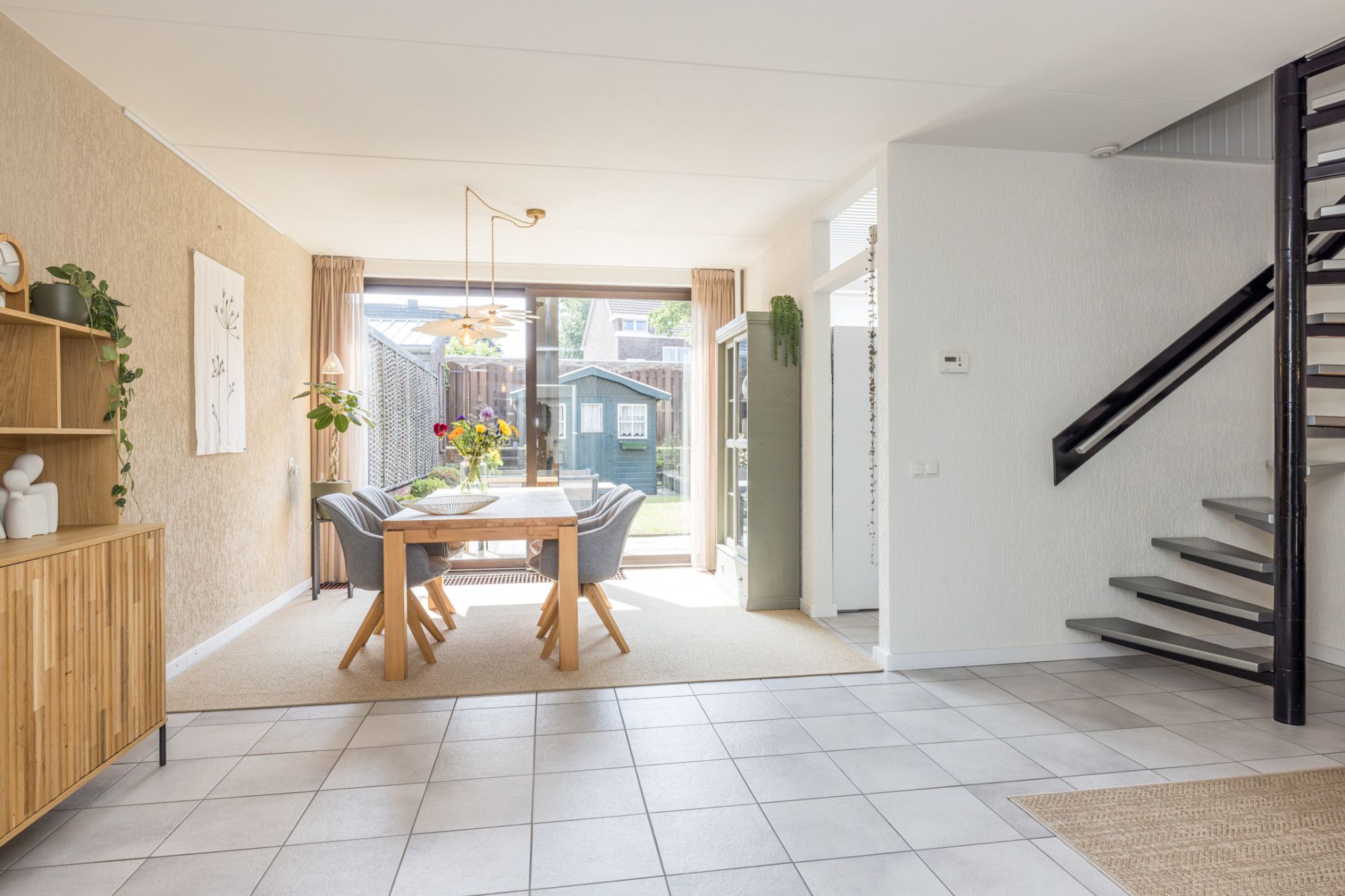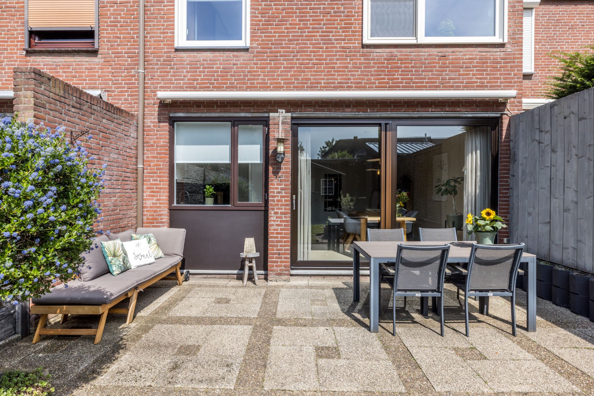 De zonnige, verzorgde, onderhoudsvriendelijke achtertuin v.v. een terras (elektrisch bedienbaar zonnescherm) biedt toegang tot tuinhuis (1,90 m x 2,28 m).
