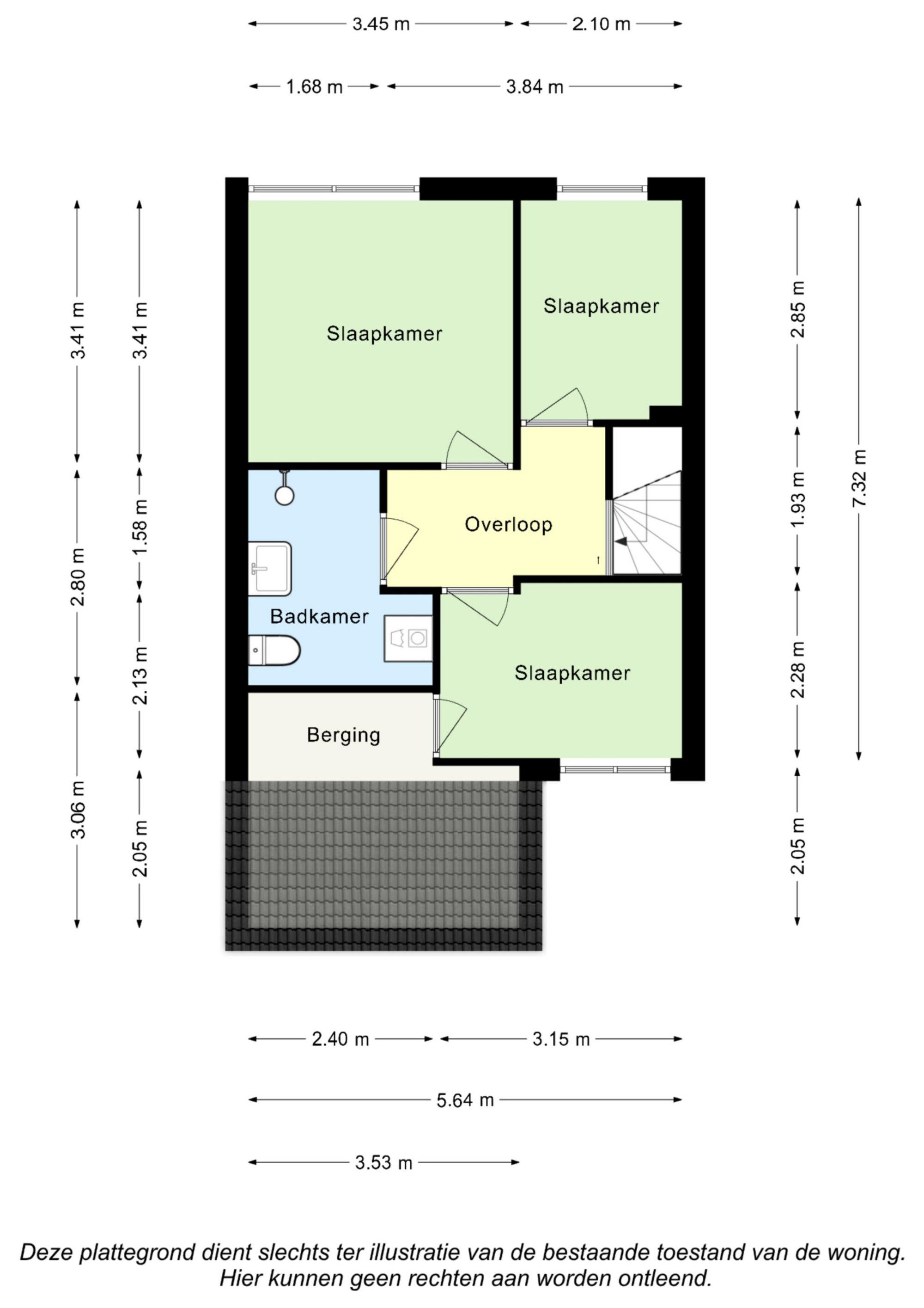 De overloop biedt toegang tot 3 slaapkamers, berging en badkamer. Slaapkamer I (3,15 m x 2,28 m) is aan de voorzijde gelegen, v.v. een laminaatvloer en biedt toegang tot ruime ruime berging. De deels betegelde badkamer (2,40 m x 2,80 m) is v.v. een 2e toilet, inloopdouche, vaste wastafel en aansluitingen voor witgoedapparatuur. Slaapkamer II (3,41 m x 3,45 m) en slaapkamer III (2,85 m x 2,10 m) beide v.v. een laminaatvloer aan de achterzijde gelegen.