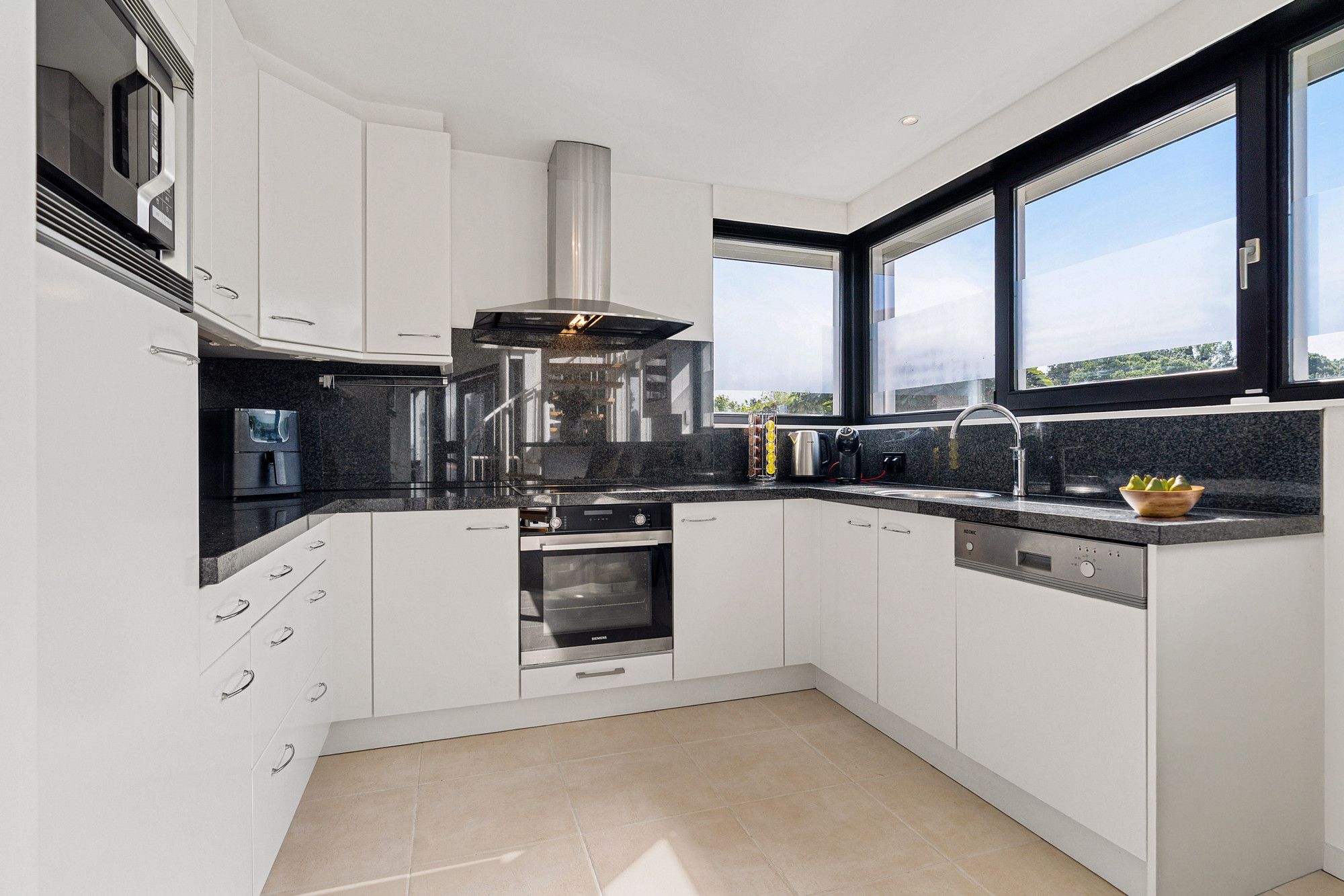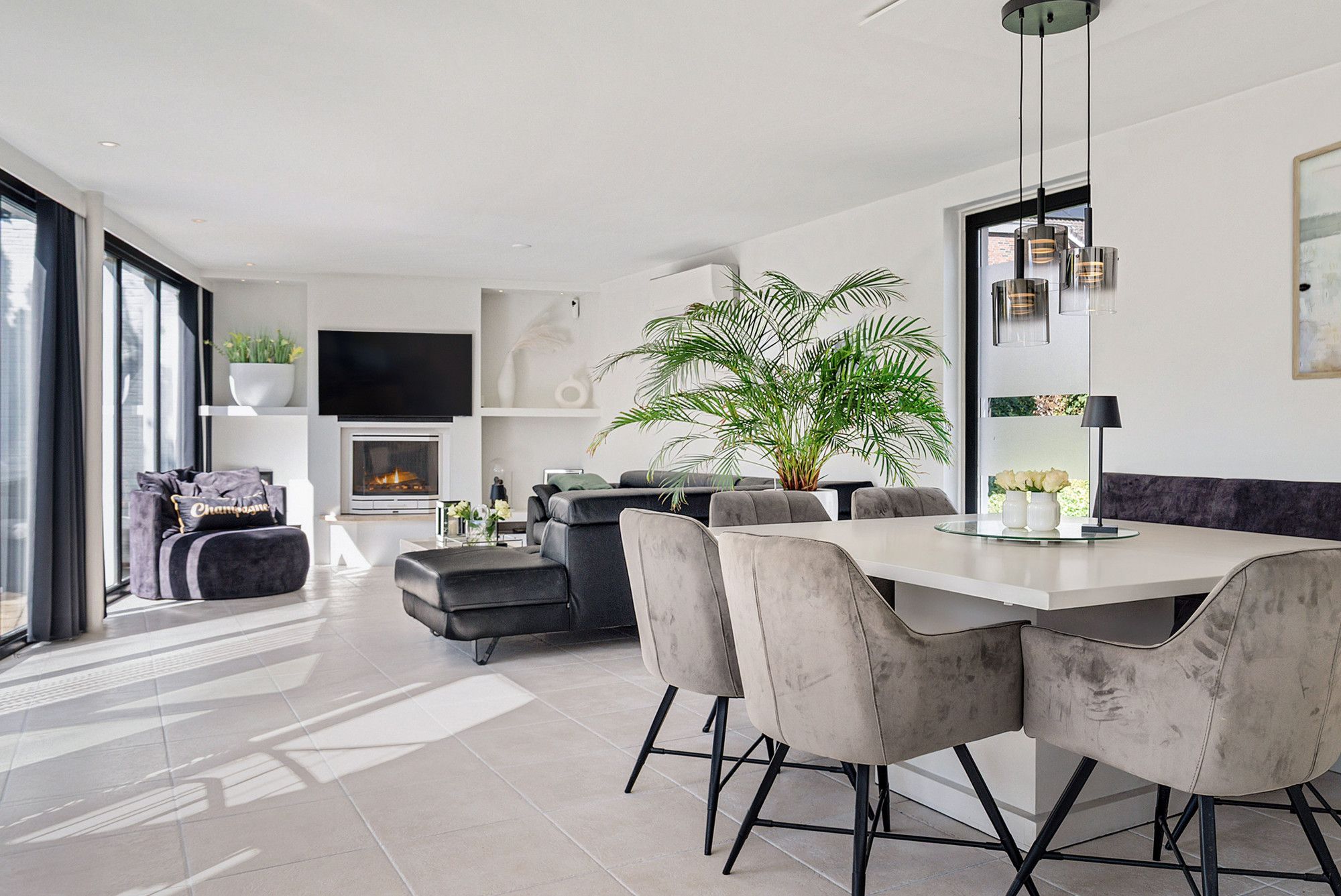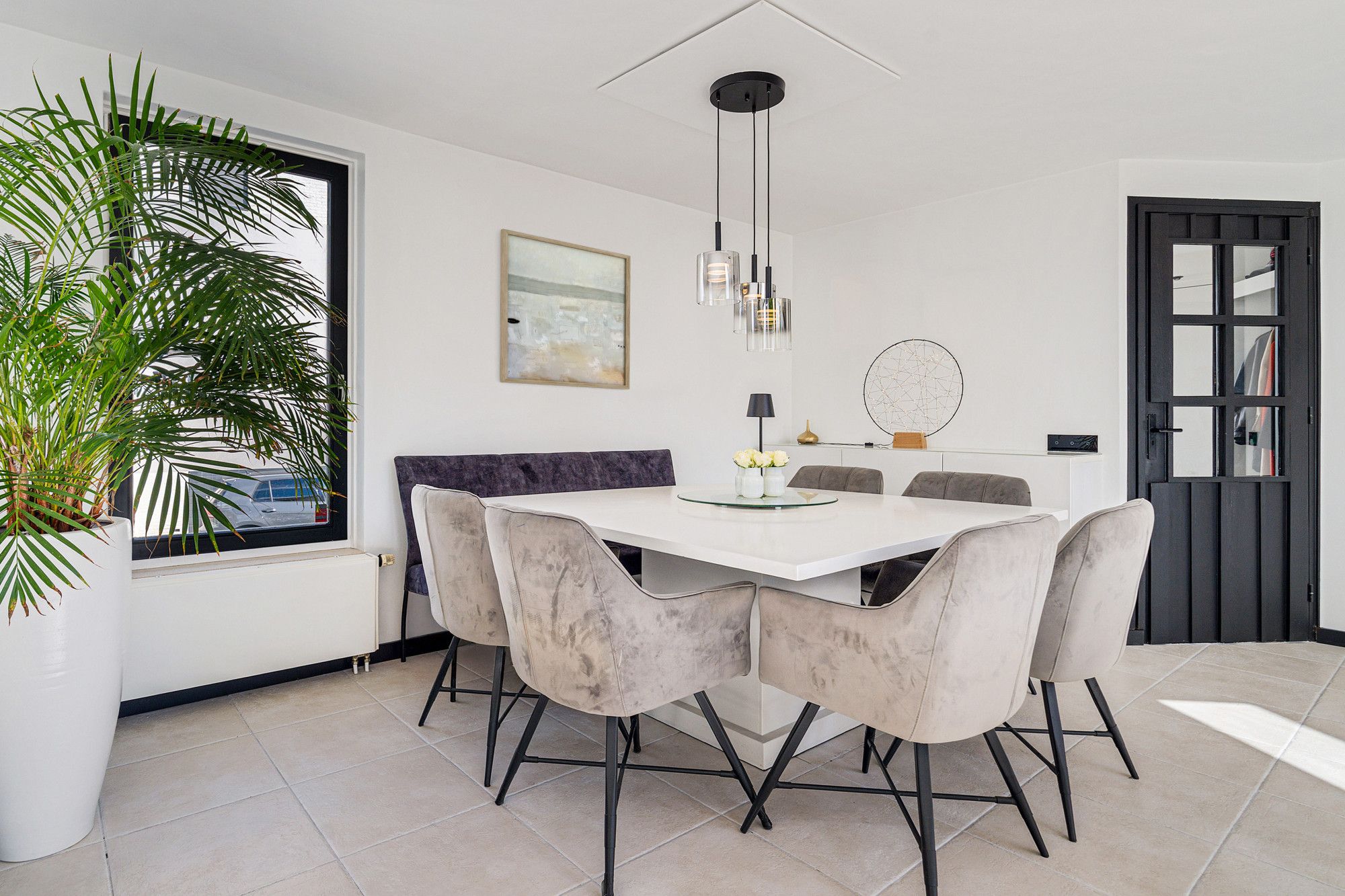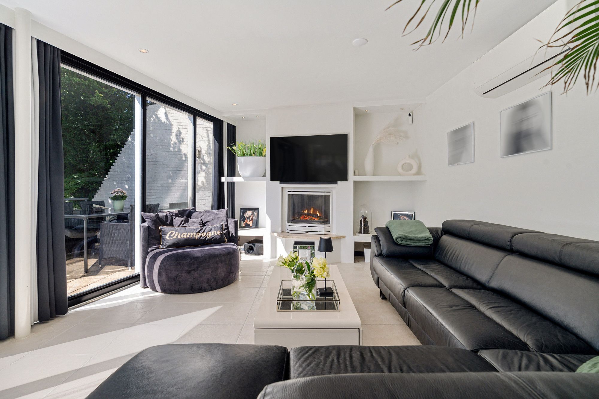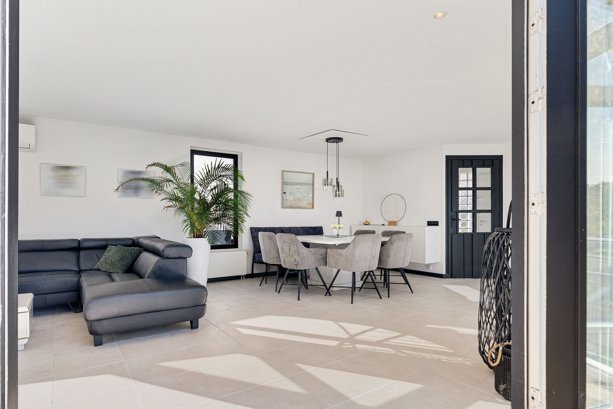 De woonkamer is een lichte en comfortabele leefruimte met een eet- en zitgedeelte, voorzien van gashaard, airconditioning en openslaande deuren naar het dakterras. De moderne keuken beschikt over alle benodigde apparatuur zoals koelkast, combimagnetron, heteluchtoven, inductiekookplaat, afzuigkap, vaatwasser en een stijlvol stenen werkblad. De gehele verdieping is voorzien van vloerverwarming.