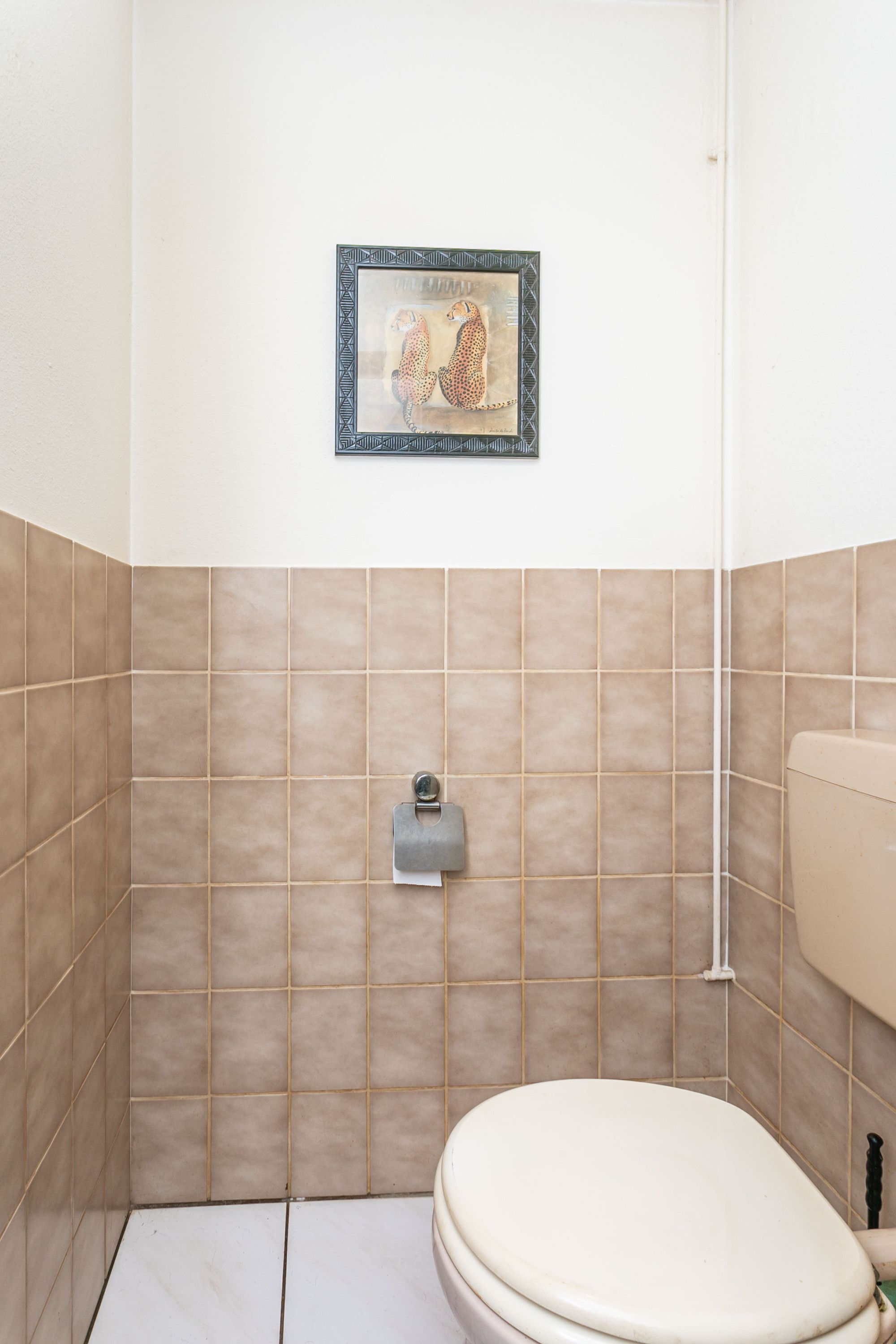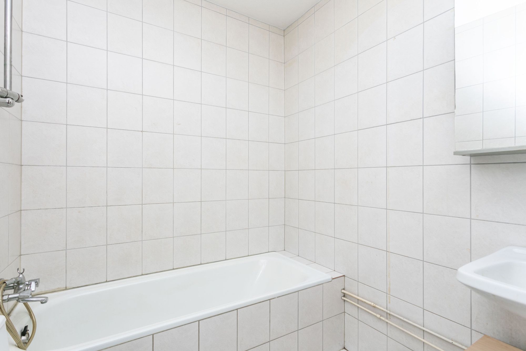 De geheel betegelde badkamer (ca. 2.28 x 1.80 m) is voorzien van een ligbad, vaste wastafel, tweede toilet en designradiator.