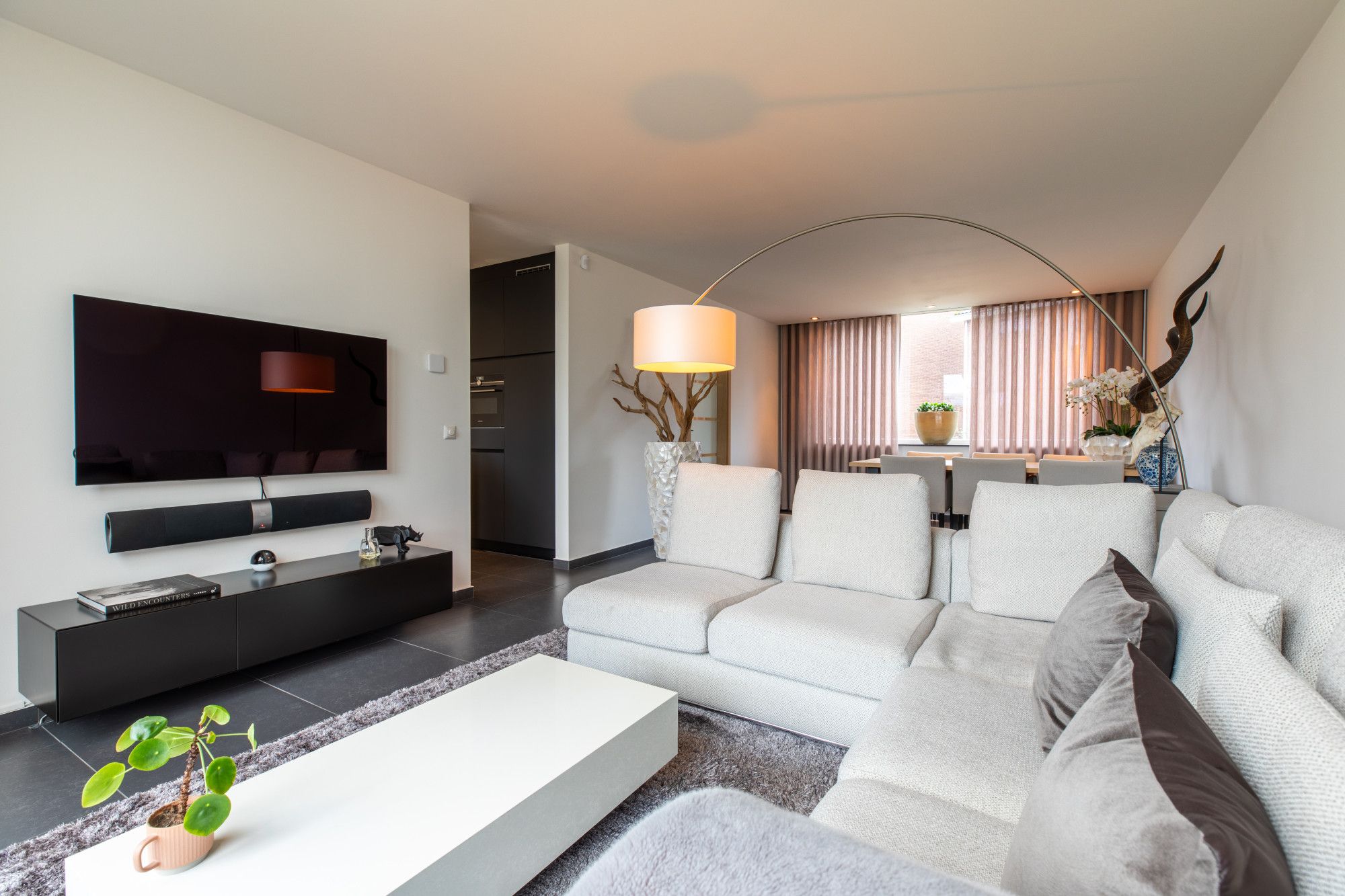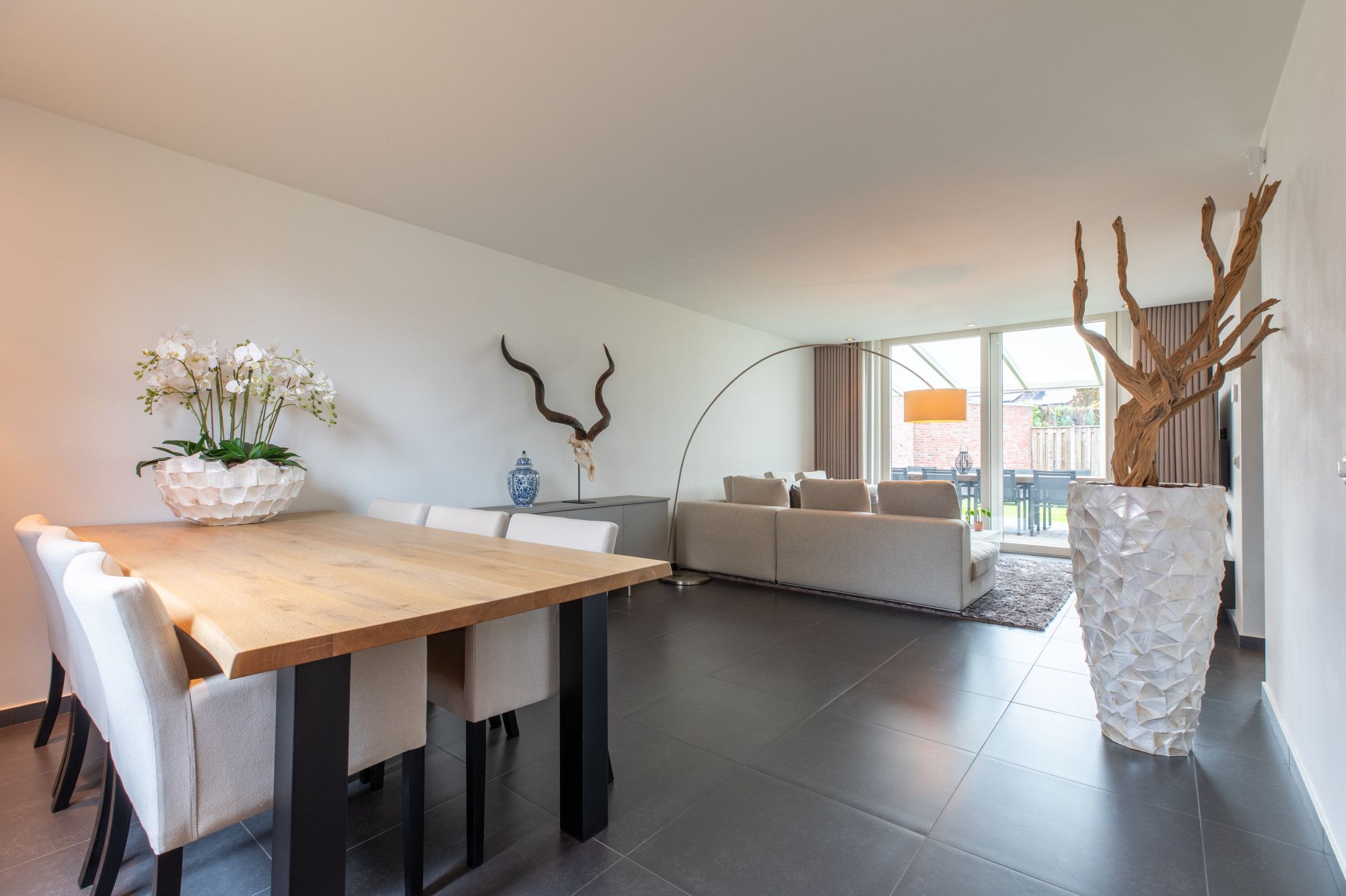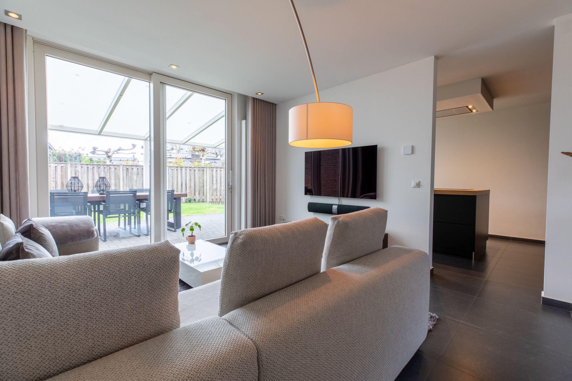 Via de ruime ontvangsthal, met aangrenzend de meterkast, het gastentoilet en de garderobe/ berging, gaat u naar de woonkamer. De woonkamer is circa 8,20m x 3,89m groot en heeft aan de achterzijde een grote schuifpui naar de tuin. De keuken is ingericht met een schitterende keuken voorzien van alle gewenste apparatuur.