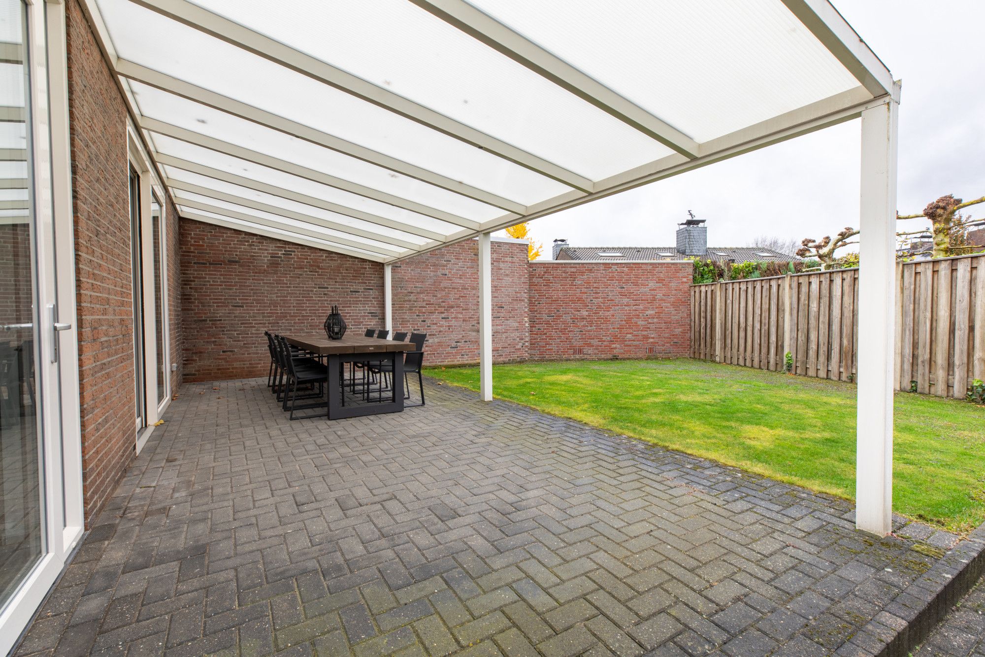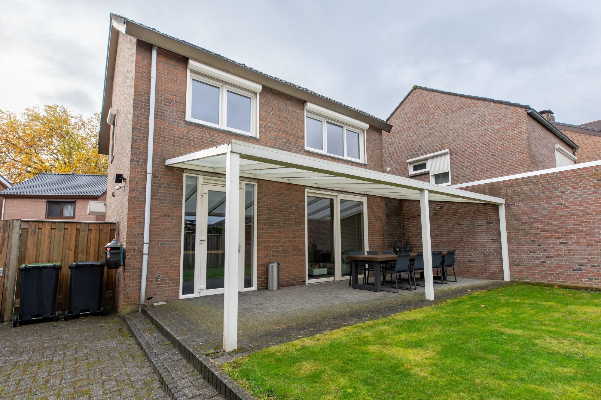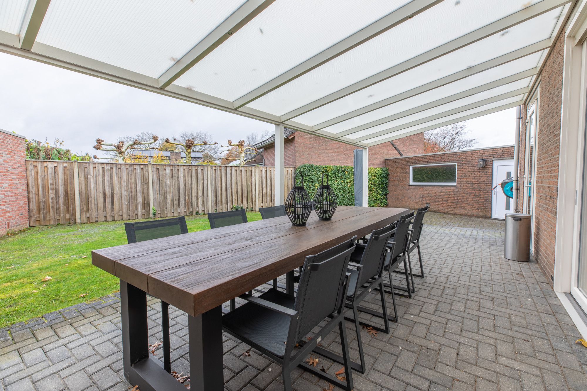 Aan de achterzijde van het woonhuis gaat u via de keuken en de woonkamer naar het overdekt terras, vanwaar u volop van uw privacy geniet. De tuin is eveneens via de oprit, die plek beidt aan drie auto's, toegankelijk. De garage is circa 7,00m x 3,06m groot en heeft ernaast een berging van circa 4,90m x 2,26m. Deze ruimtes zijn eveneens ideaal voor aan huis verbonden beroepen. U scheidt het privé en het zakelijk gedeelte volledige door de separate entree.