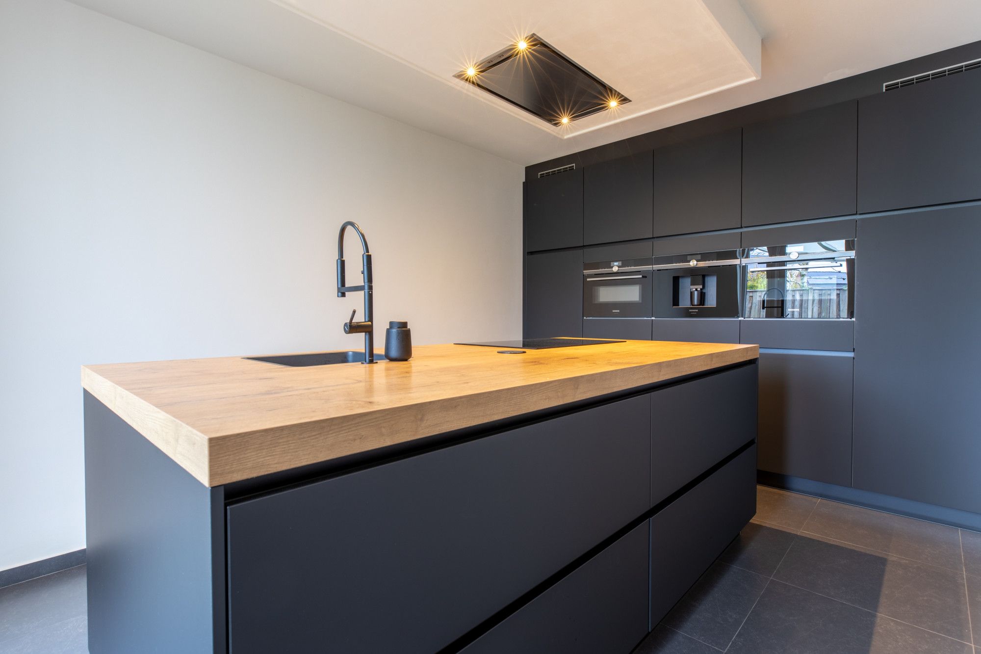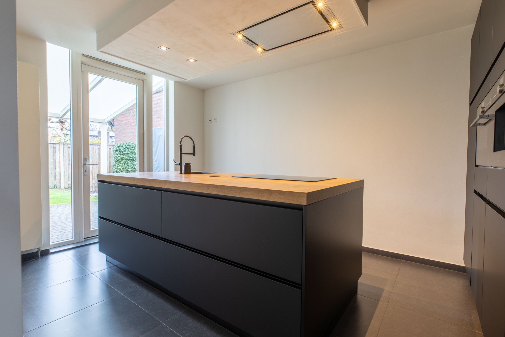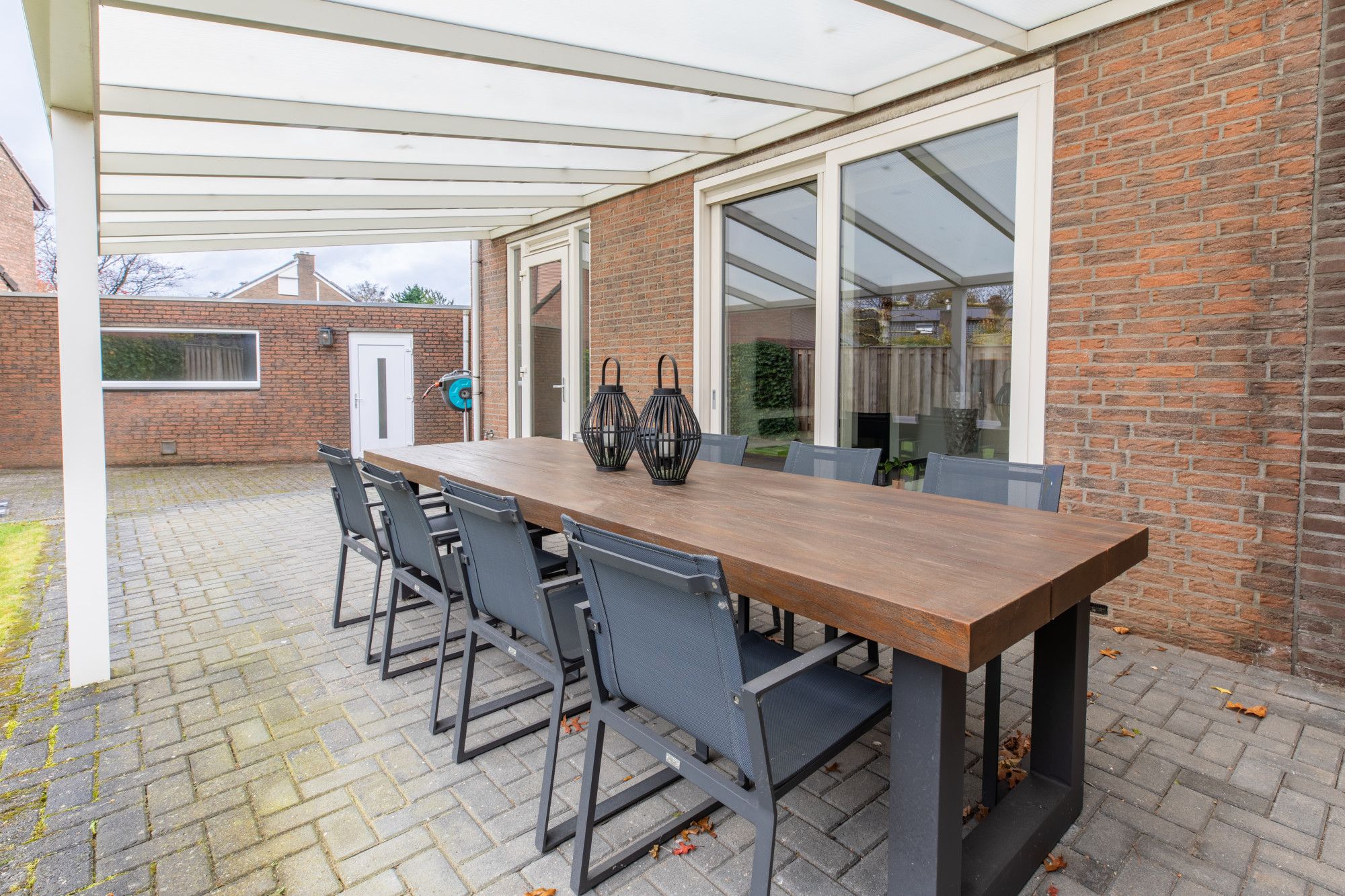 Aan de achterzijde van het woonhuis gaat u via de keuken en de woonkamer naar het overdekt terras, vanwaar u volop van uw privacy geniet. De tuin is eveneens via de oprit, die plek beidt aan drie auto's, toegankelijk. De garage is circa 7,00m x 3,06m groot en heeft ernaast een berging van circa 4,90m x 2,26m. Deze ruimtes zijn eveneens ideaal voor aan huis verbonden beroepen. U scheidt het privé en het zakelijk gedeelte volledige door de separate entree.