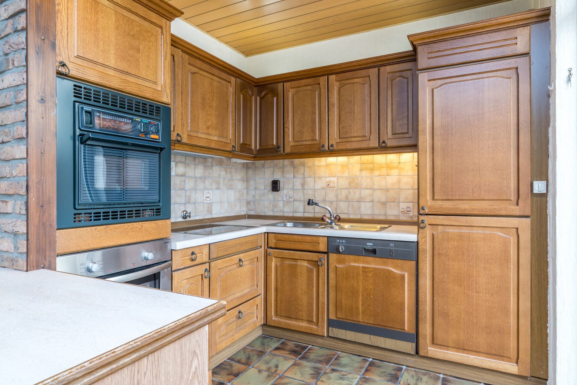Vanuit de keuken toegang tot een overdekt terras en de omsloten tuin met achterom ingang.