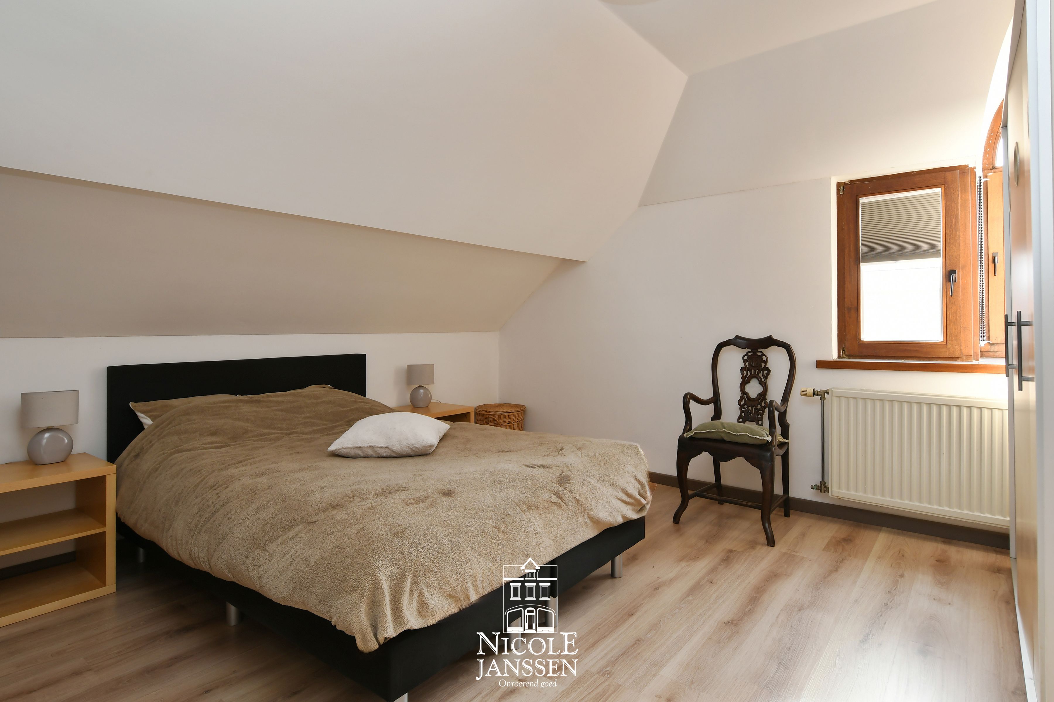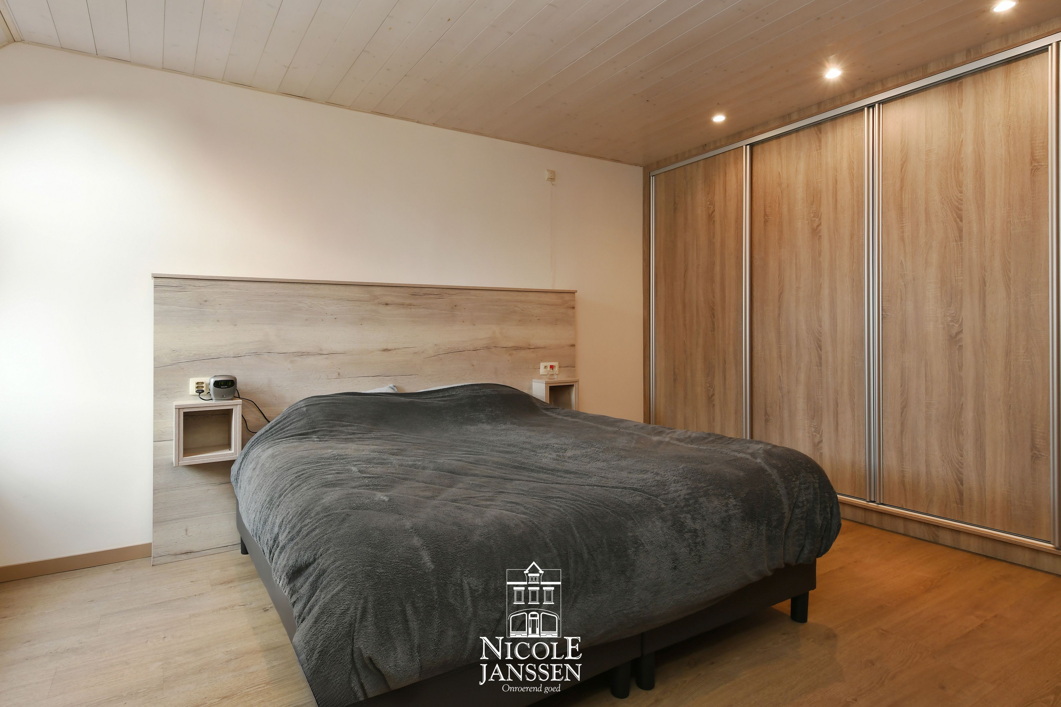 - Ouderlijke slaapkamer met laminaatvloer en praktische vaste kastenwand