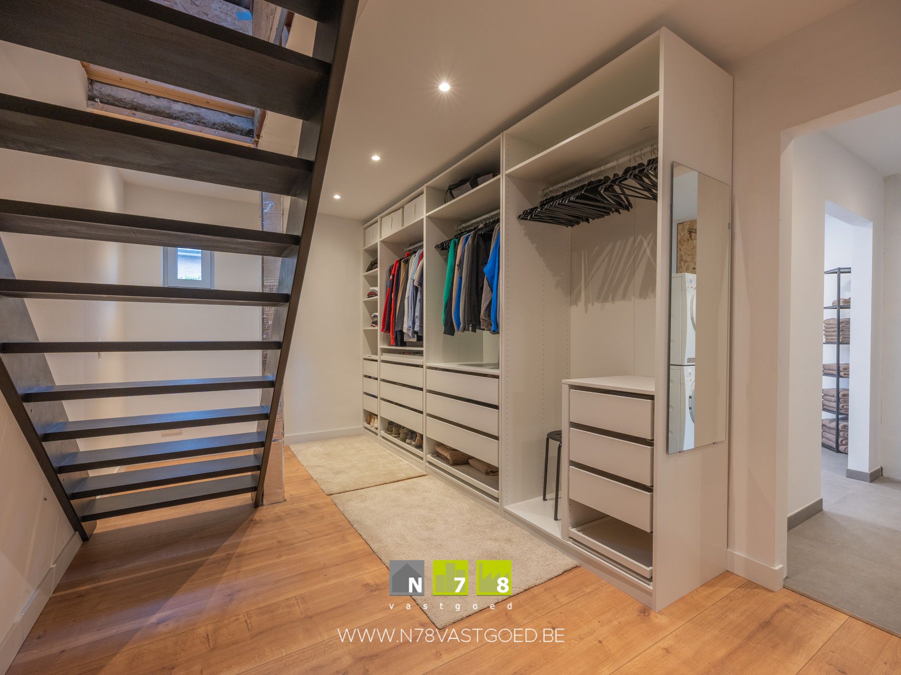- Dressing (15m²): gelakte beukentrap naar de zolder, doorgang naar wasplaats en badkamer, laminaat.