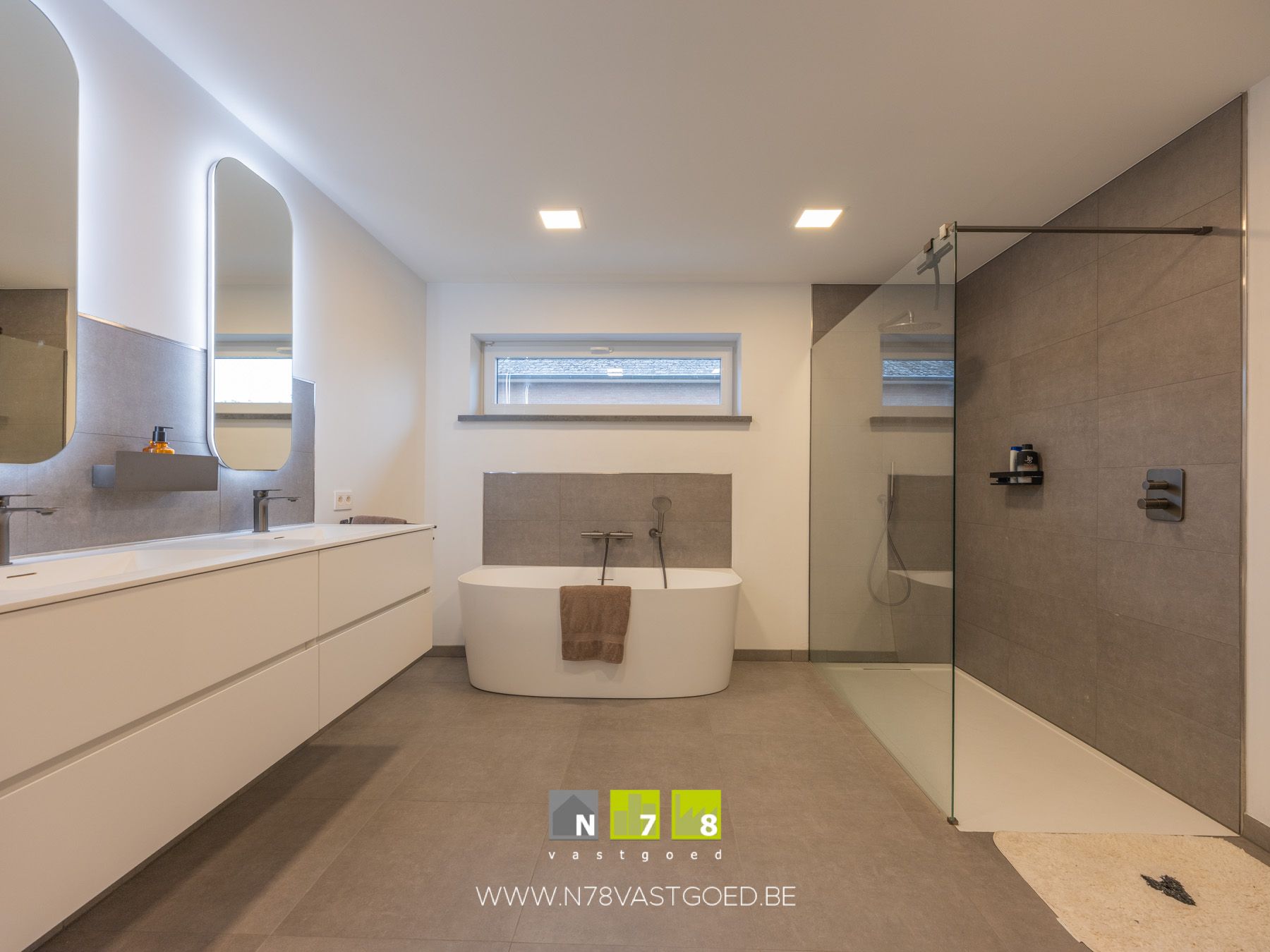 - Badkamer (3,40m x 3,61m = 12,27m²): ingericht badmeubel met dubbele lavabo en onderlades; ligbad, inloopdouche, design handdoekdroger, doorgang naar de wasplaats, tegelvloer.