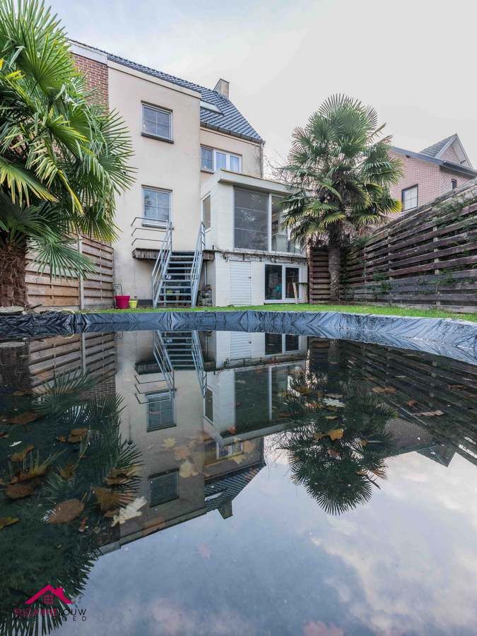 De achtertuin van de woning werd aangelegd met gazon en beplanting. Hier bevindt zich tevens een verwarmd buitenzwembad, een siervijver en een gezellig aangelegd terras.