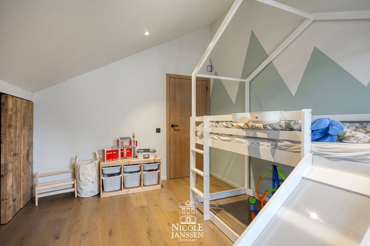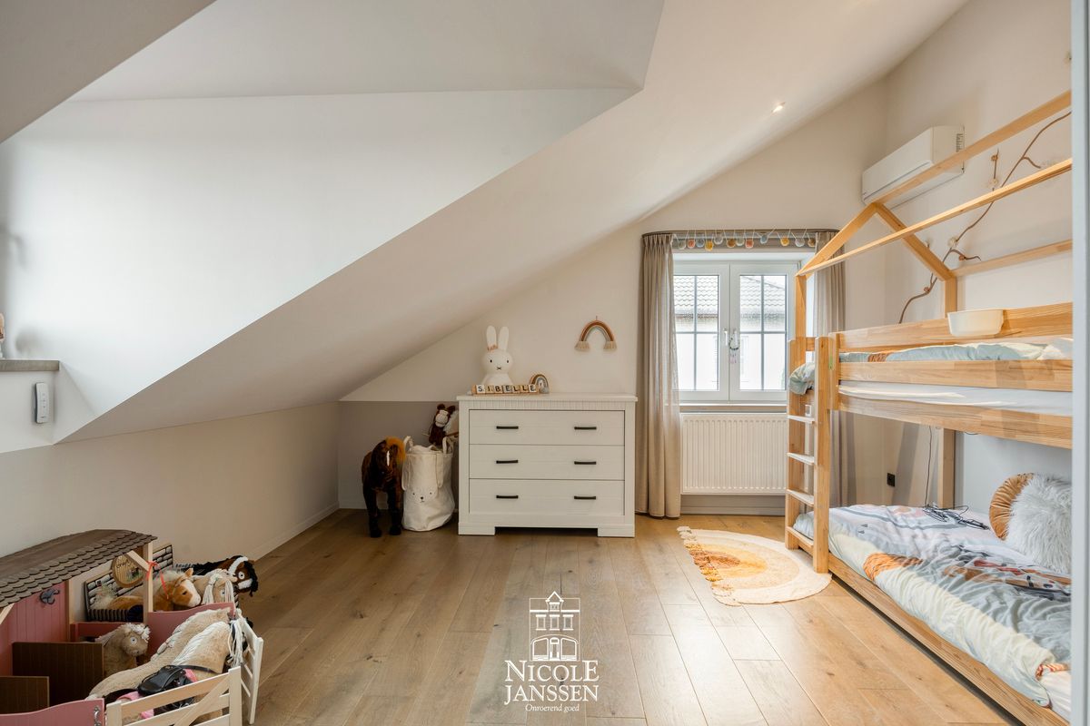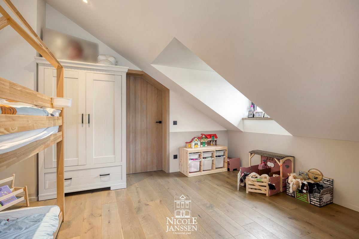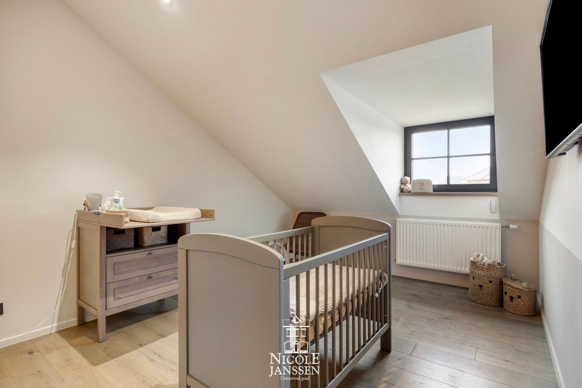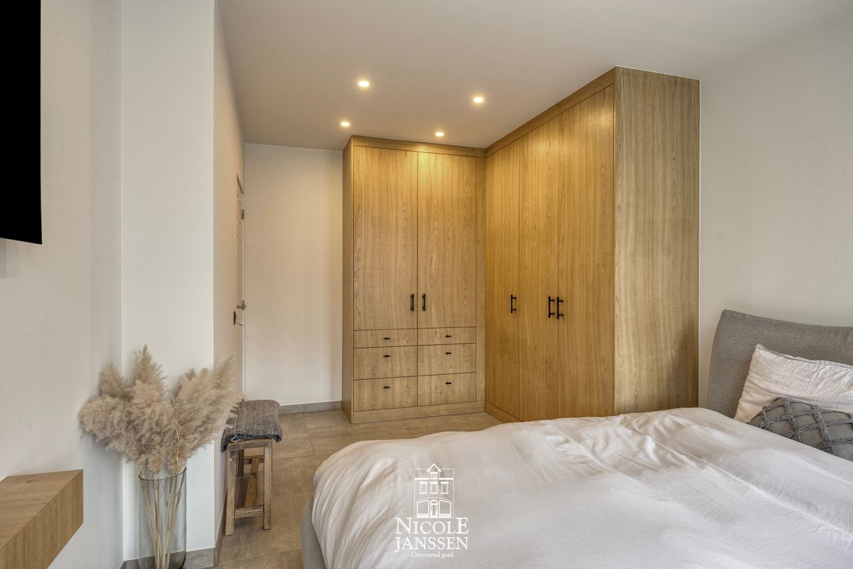 - De volledige bovenverdieping werd volledig vernieuwd met nieuwe ramen, voleiken deuren, een parketvloer en moderne domotica