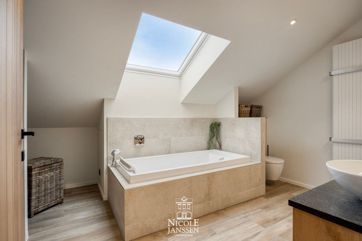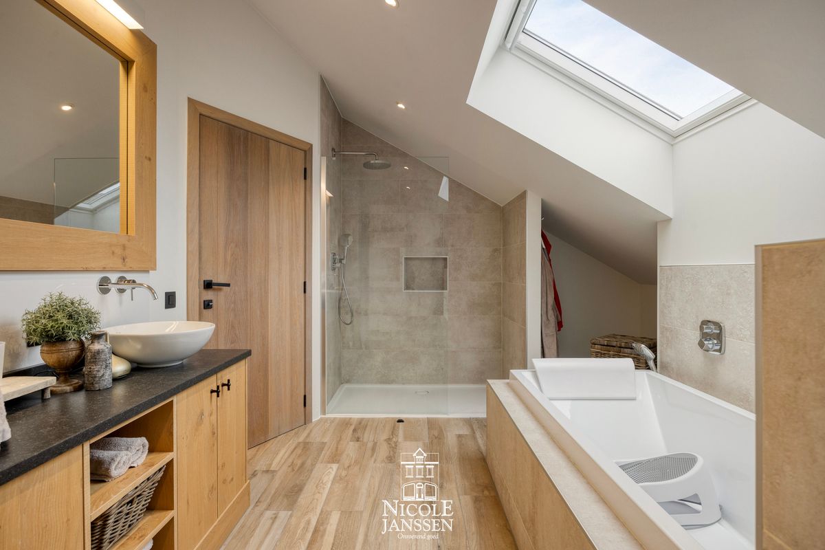 - Badkamer met inloopdouche, ligbad, toilet en dubbele lavabo op landelijk badkamermeubel