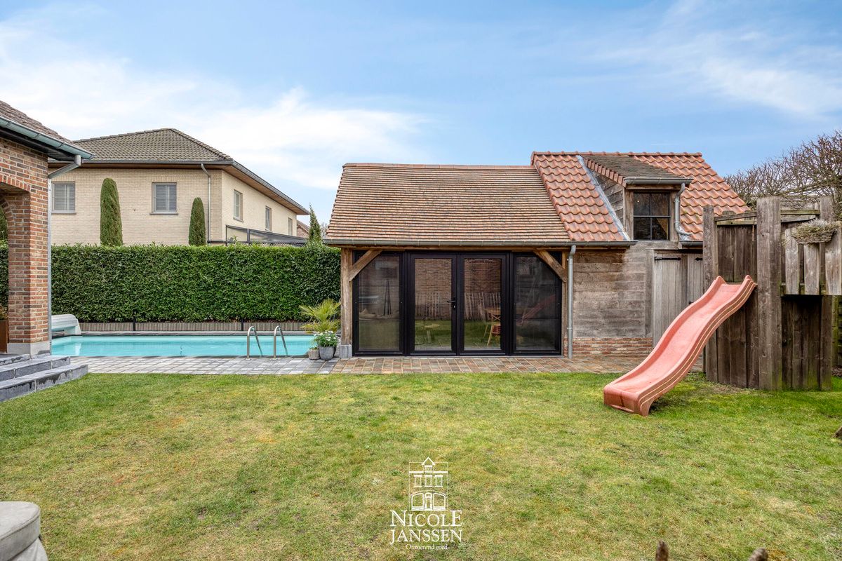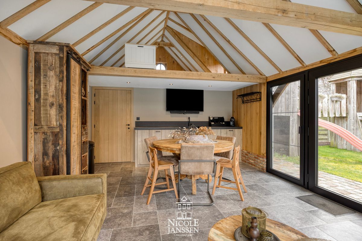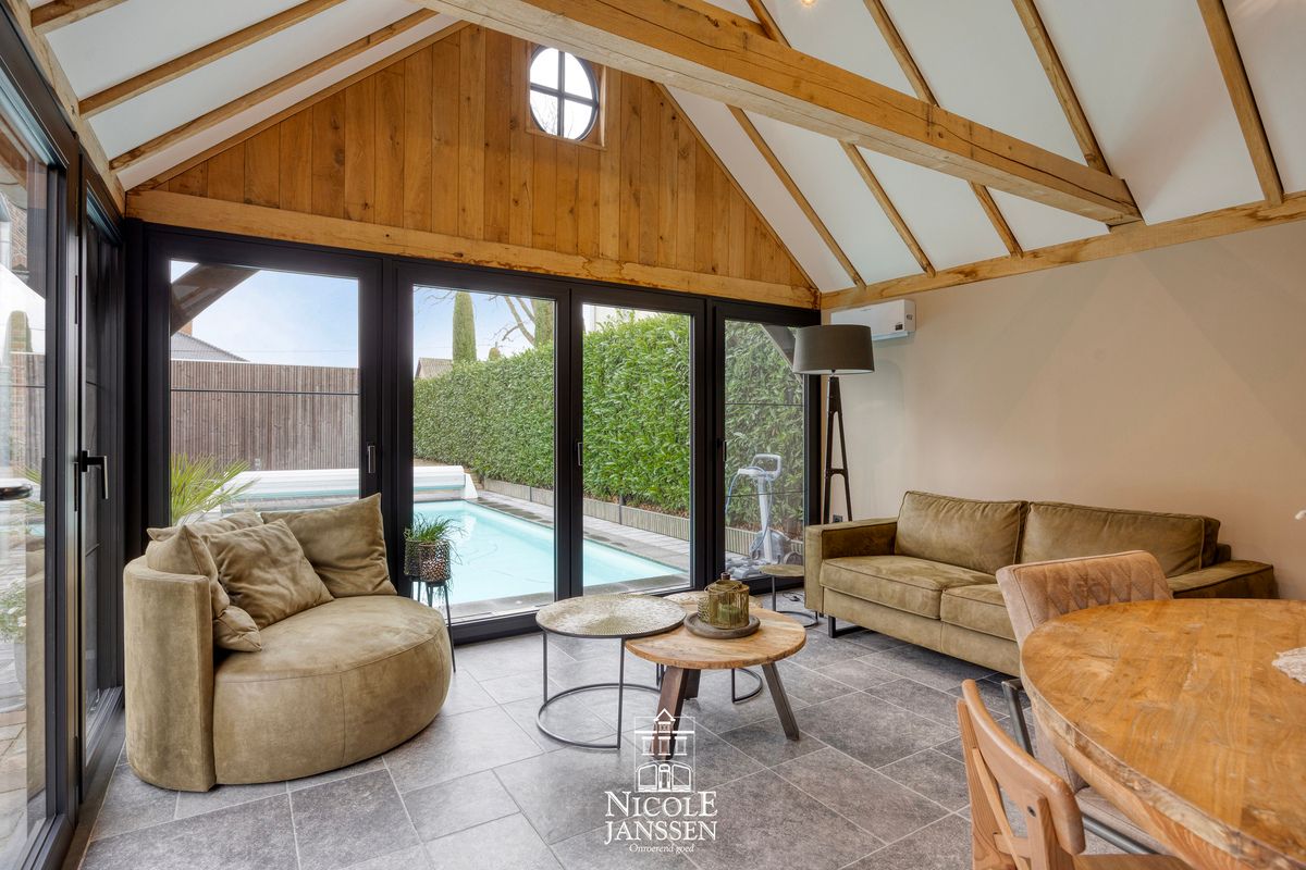 - Zeer mooi afgewerkt bijgebouw met houten balken structuur, ideaal te gebruiken als poolhouse, lounge of hobbyruimte