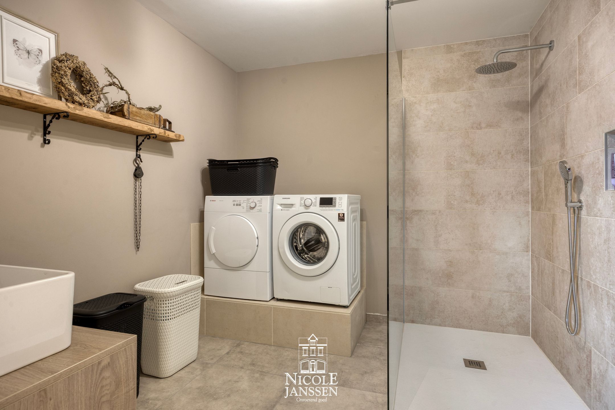 - Wasplaats/berging met grote inloopdouche en wastafel op modern badkamermeubel