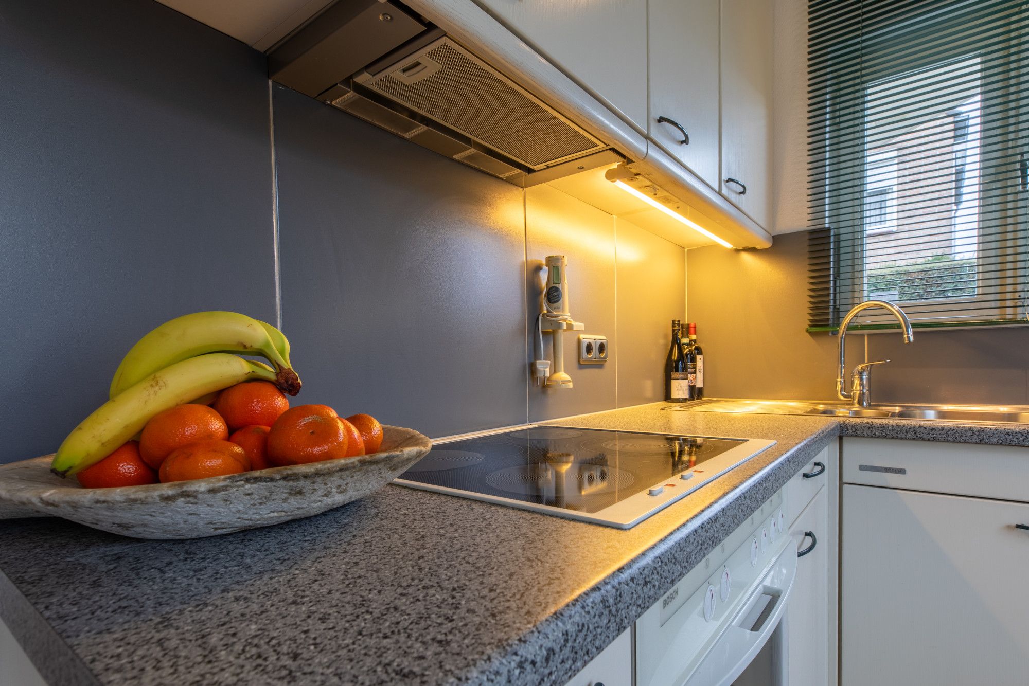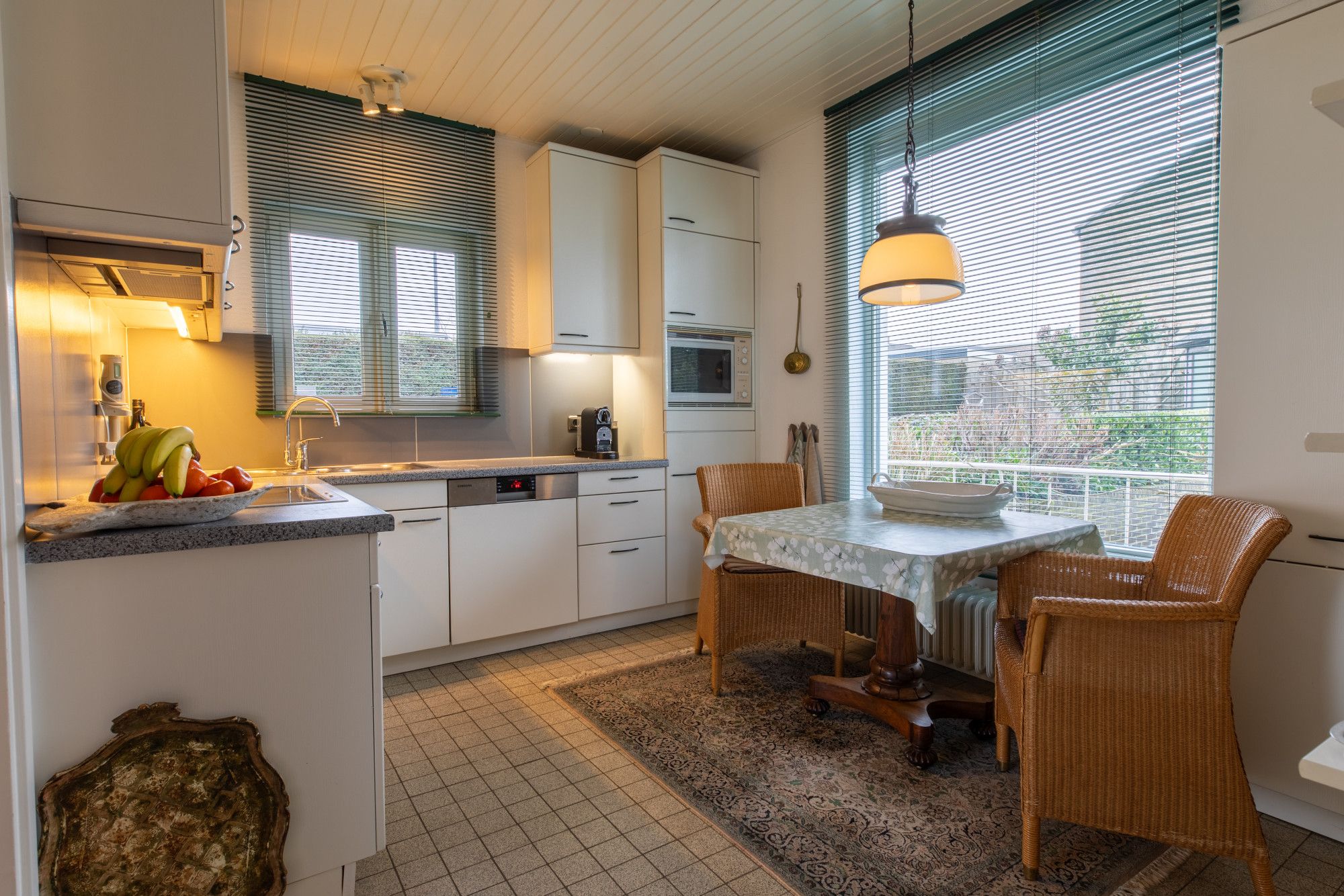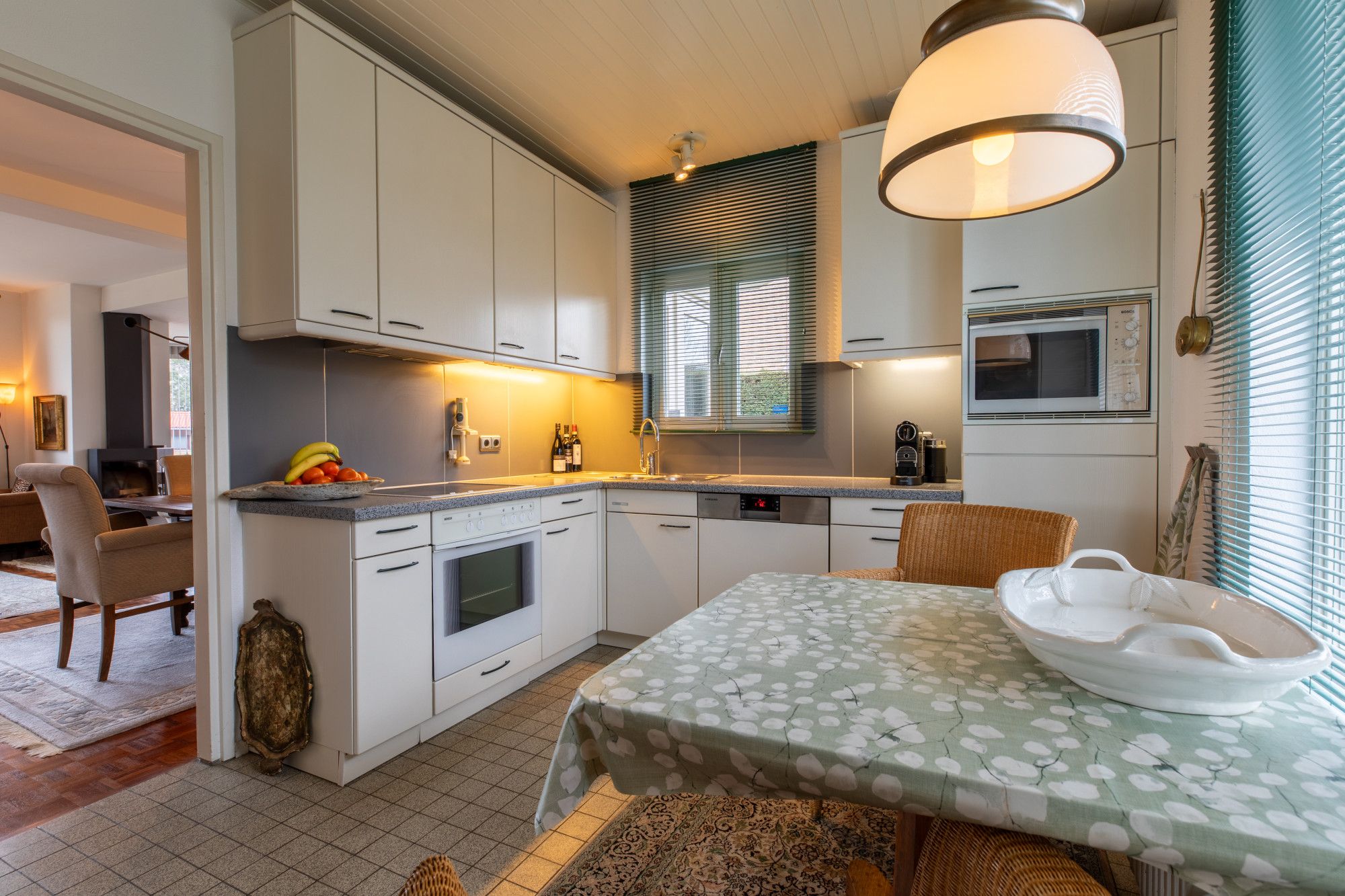 Keuken (3.68 x 2.83 m) met degelijke keukeninrichting en voorzien van diverse apparatuur waaronder een ceramische kookplaat, vaatwasser, oven, koelkast en afzuiging.