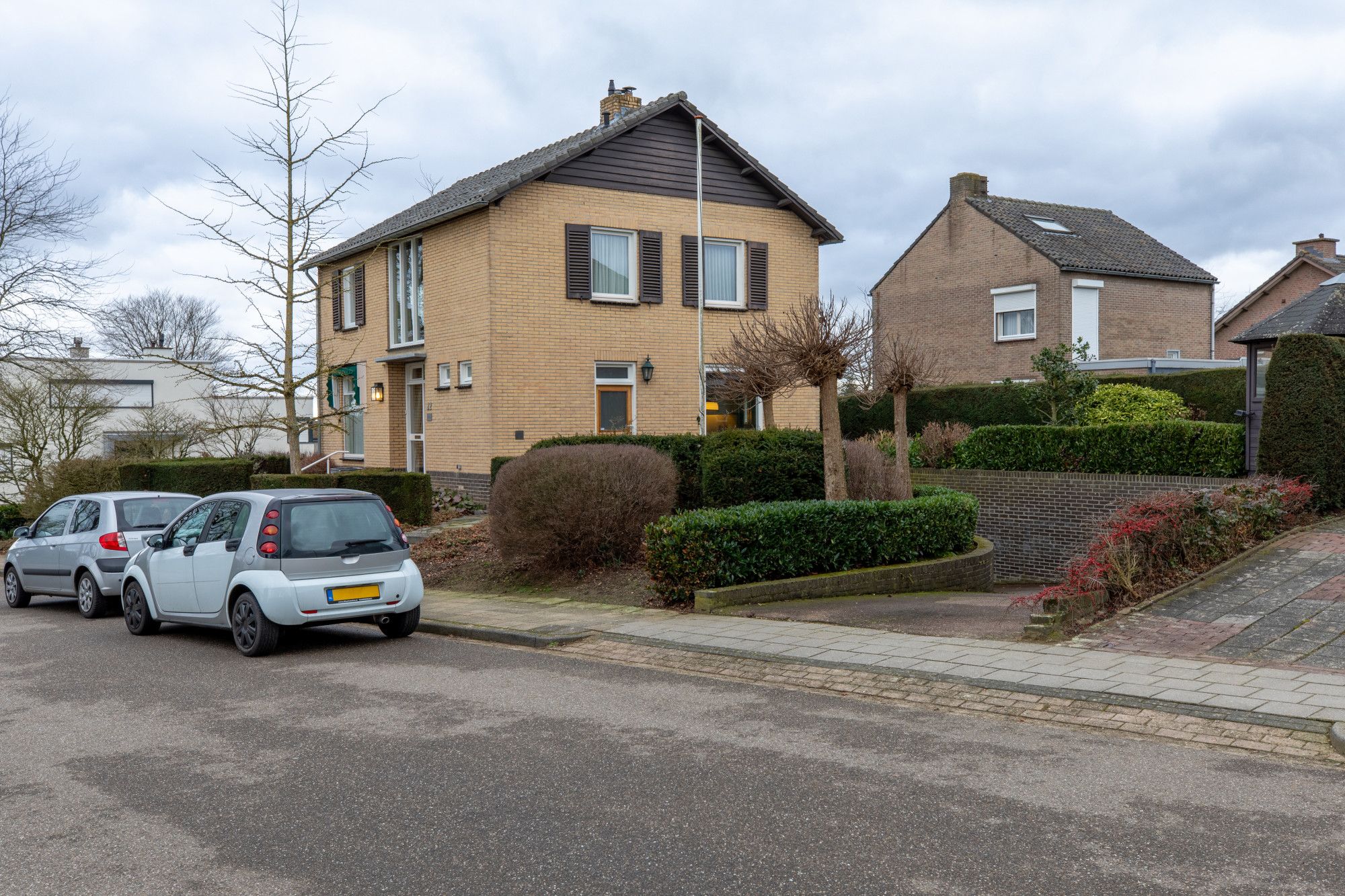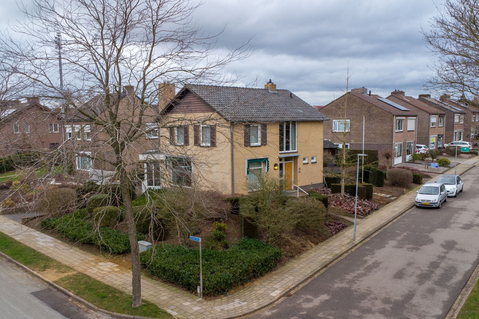 Voortuin en zij tuin met o.a. de inrit naar de ruime garage en trappenpartij naar entree.