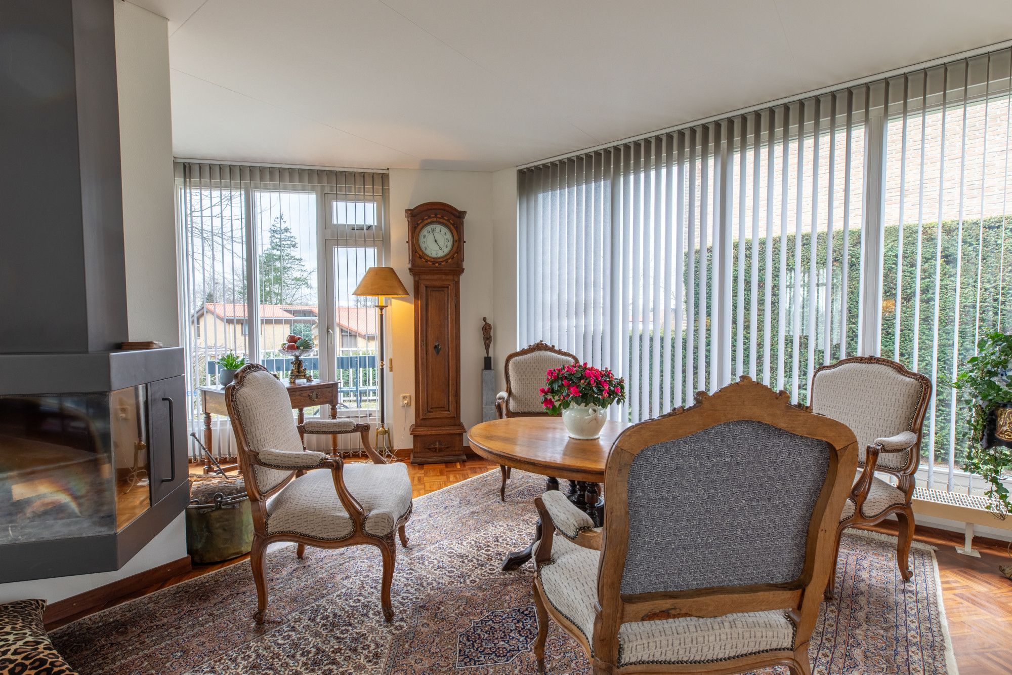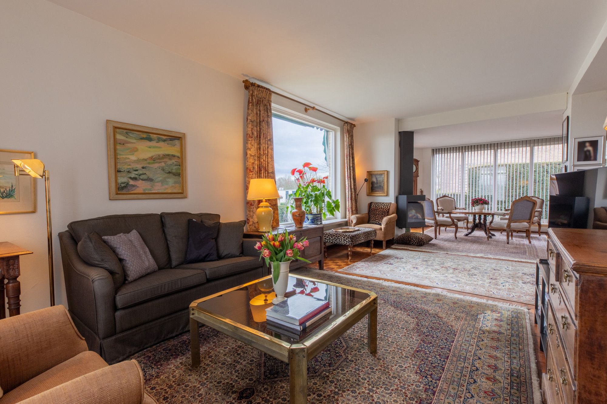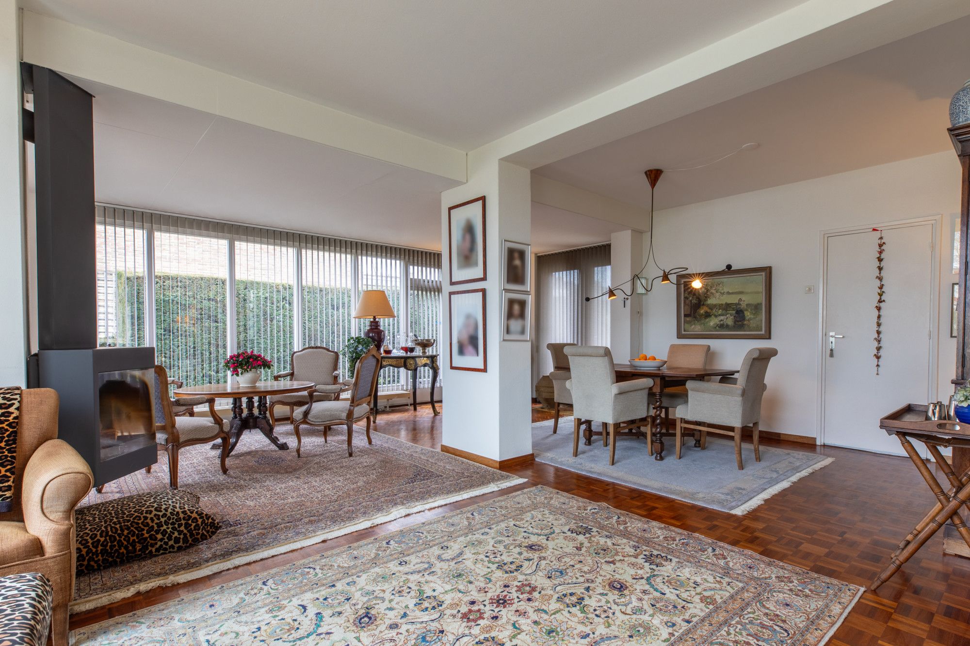 De woonkamer (10.25/6.61 x 6.47/3.60 m) voorzien van parketvloer met erker, gashaard en dubbele tuindeuren naar het terras.