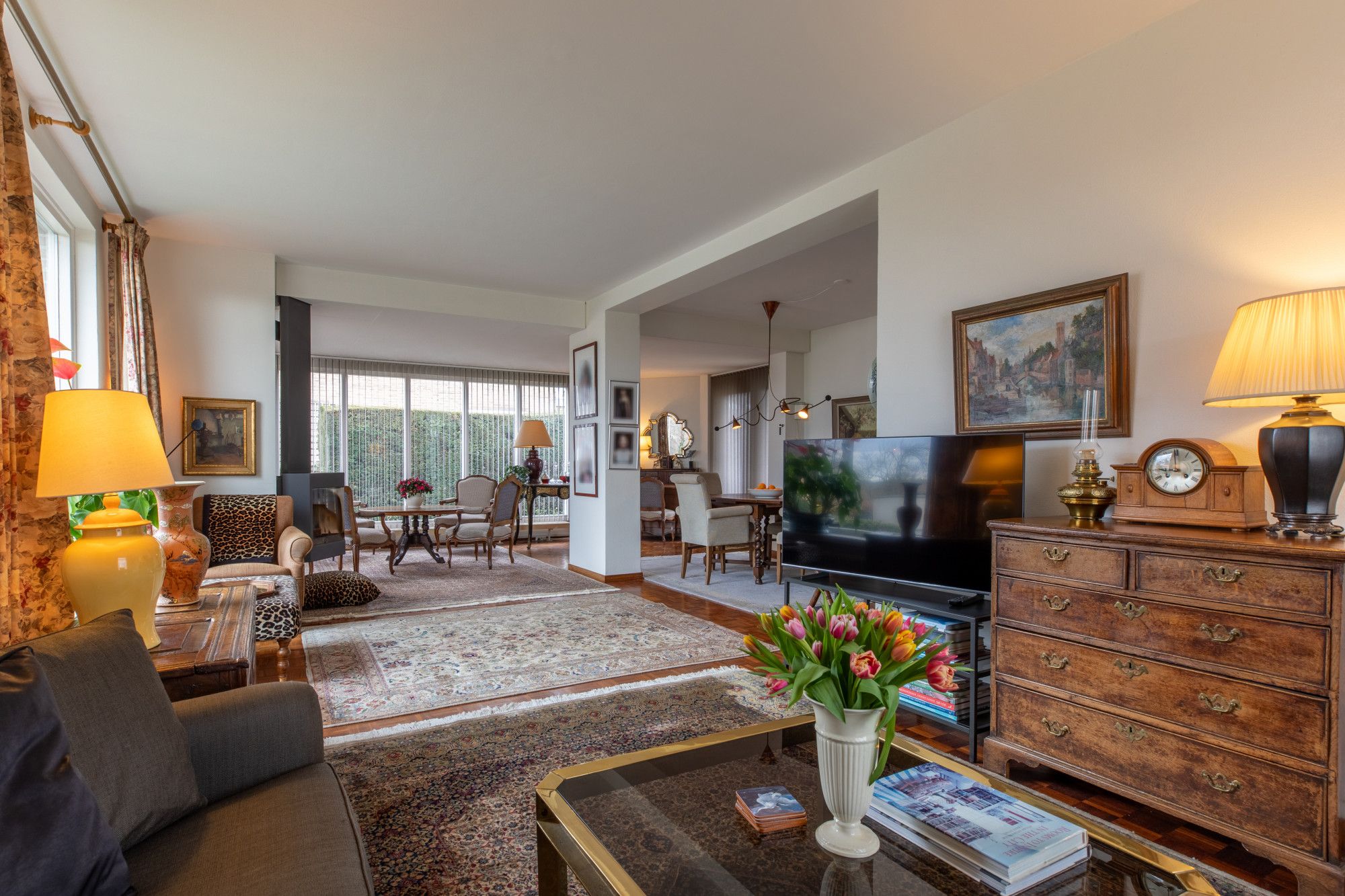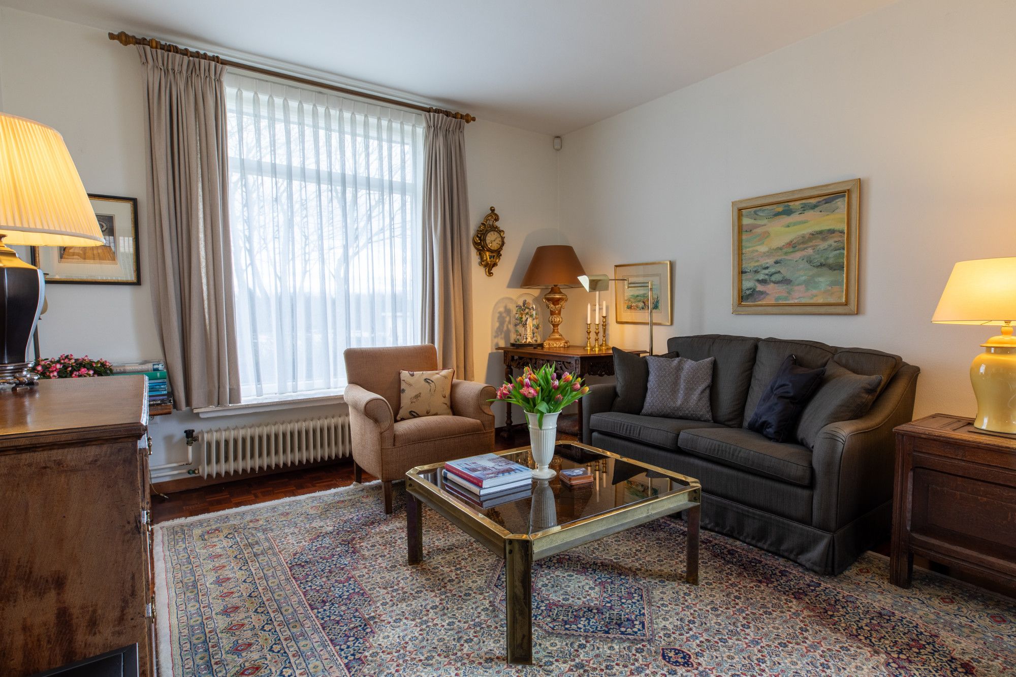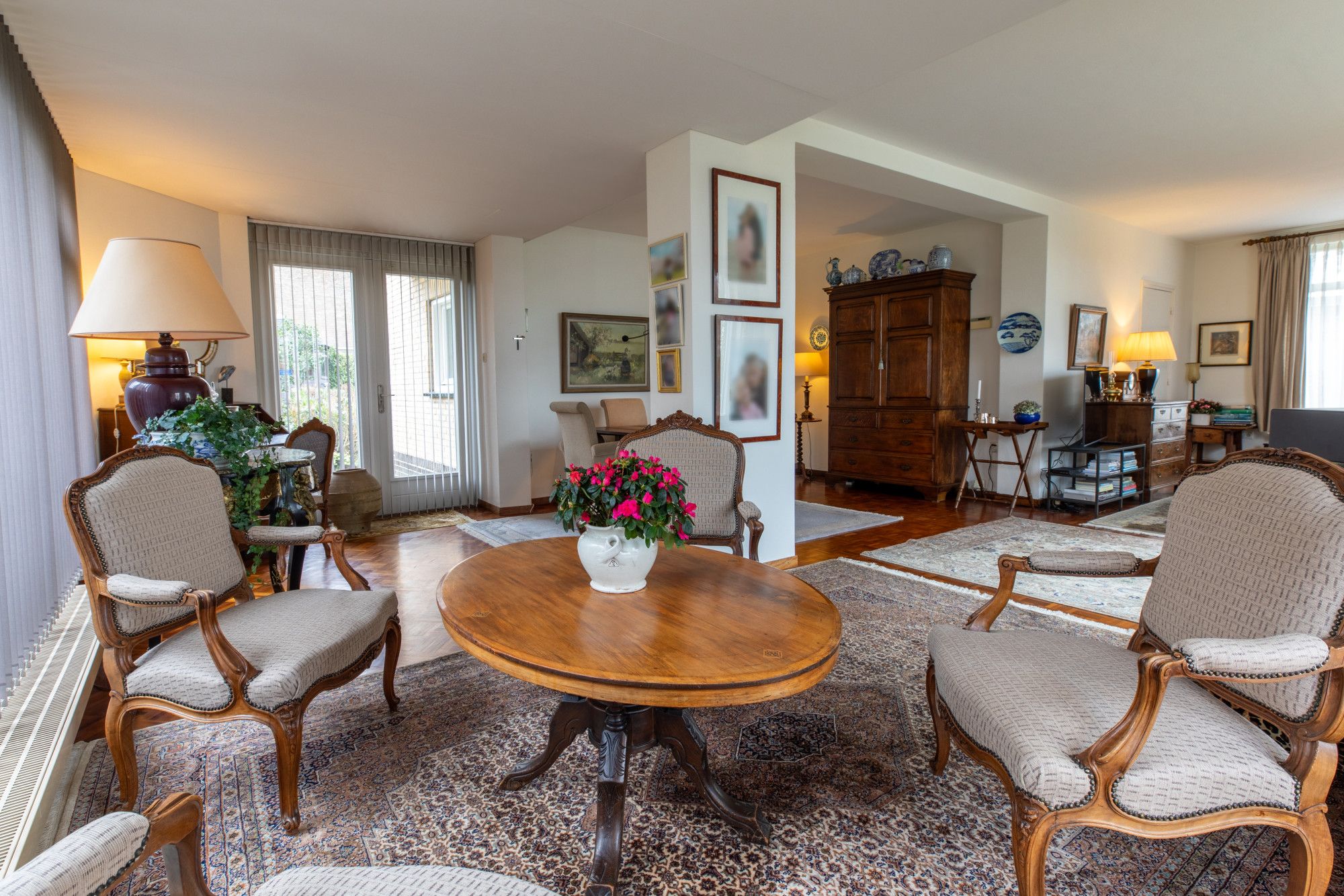 De woonkamer (10.25/6.61 x 6.47/3.60 m) voorzien van parketvloer met erker, gashaard en dubbele tuindeuren naar het terras.