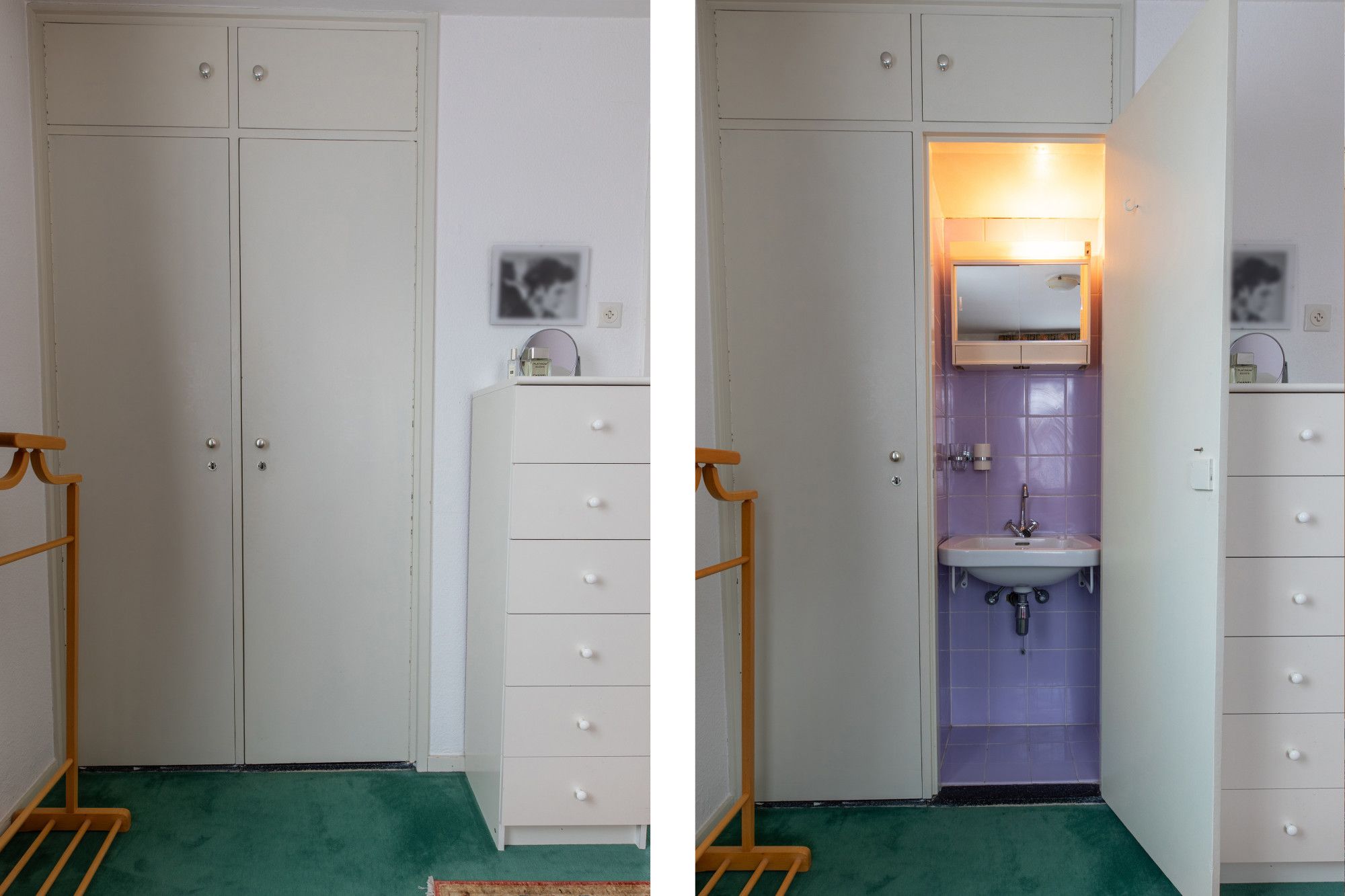 Slaapkamer 1( 3.70 x 2.82 m) met dubbele inbouwkasten en vaste wastafel.