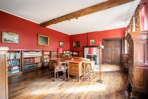 On the first floor there is a spacious entrance hall with guest toilet, a separate dining room with wood burning fireplace, a library with also a wood burning fireplace, a sitting room with wood burning fireplace, an installed kitchen with dining area, a pantry, a study, a second toilet and a laundry room.