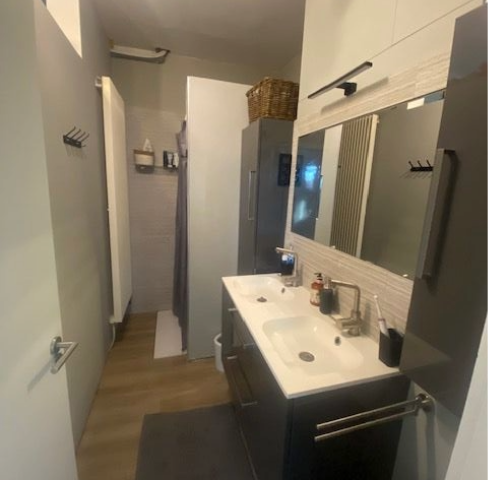- Badkamer (3,00m x 1,70m = 5,10m²): ingericht badmeubel met dubbele lavabo, lades, kolomkasten; douche, deels wandbetegeling, tegelvloer.