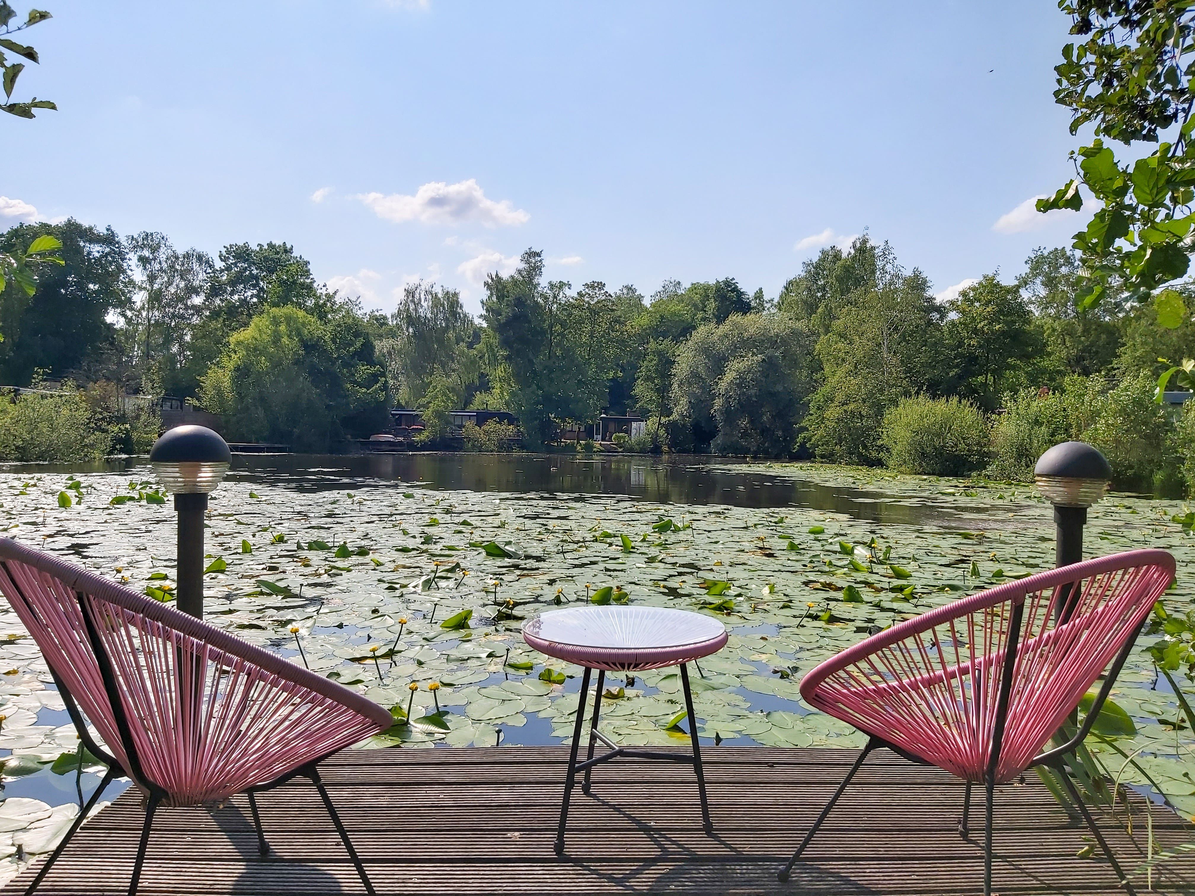 ·Ruim terras met zicht op de vijver, omgeven door groen