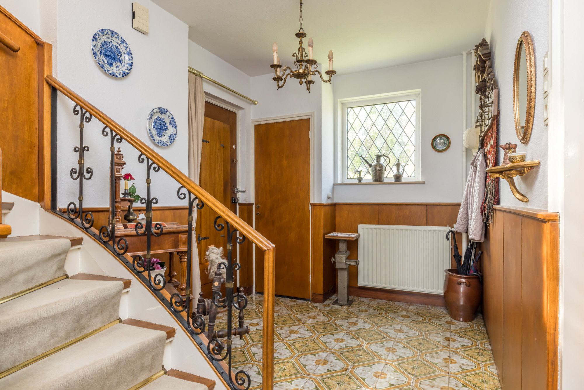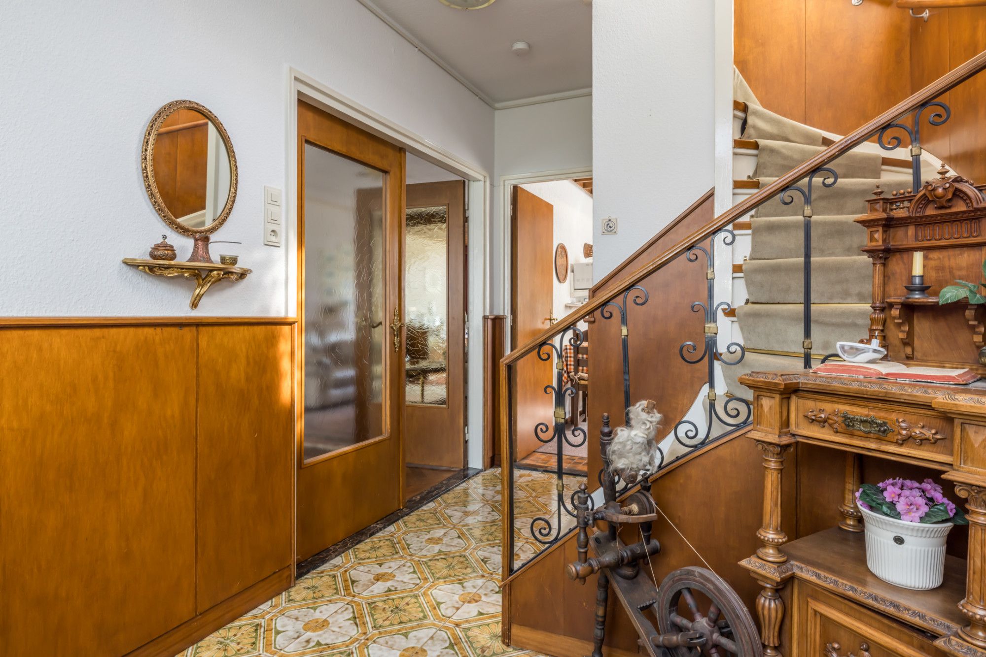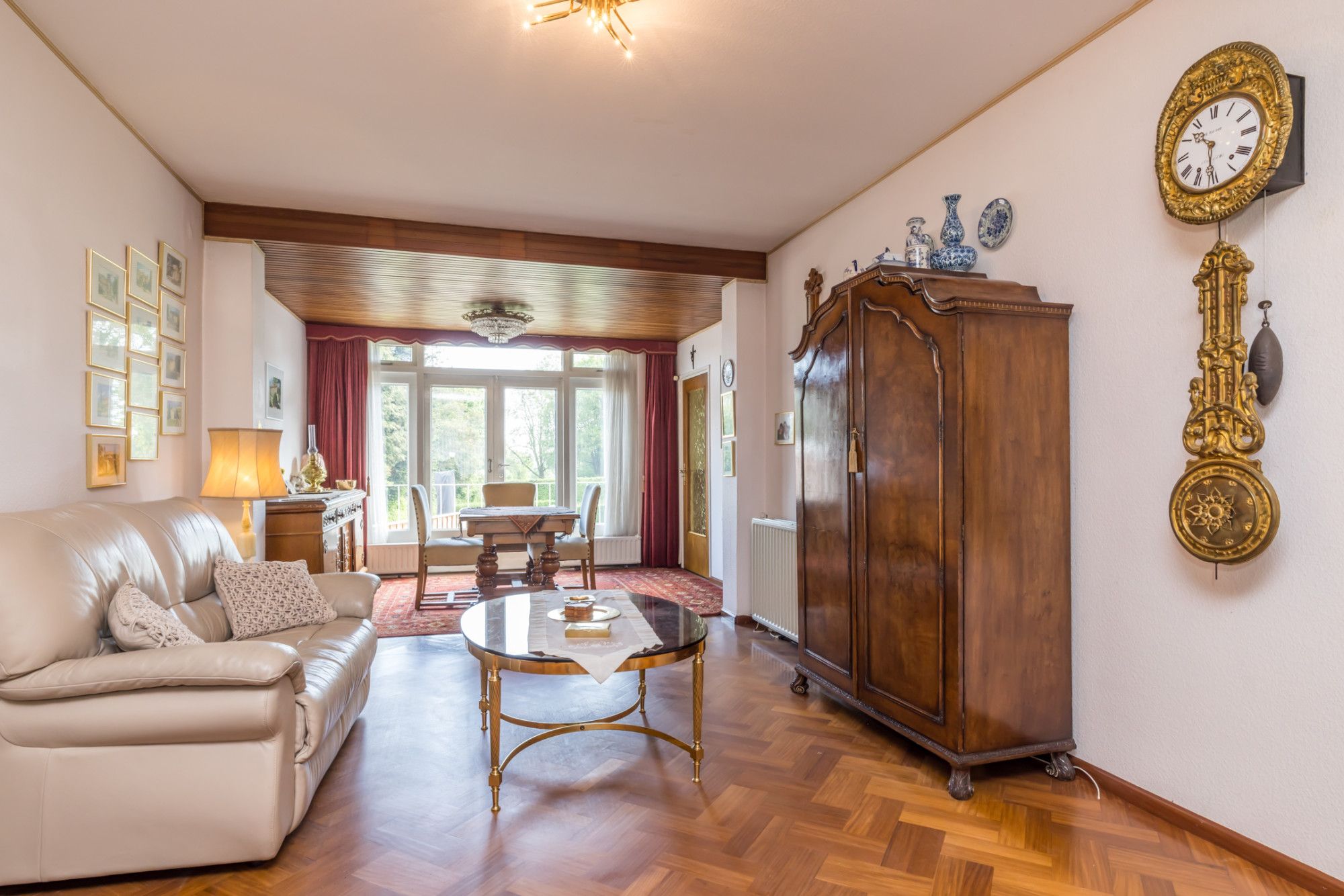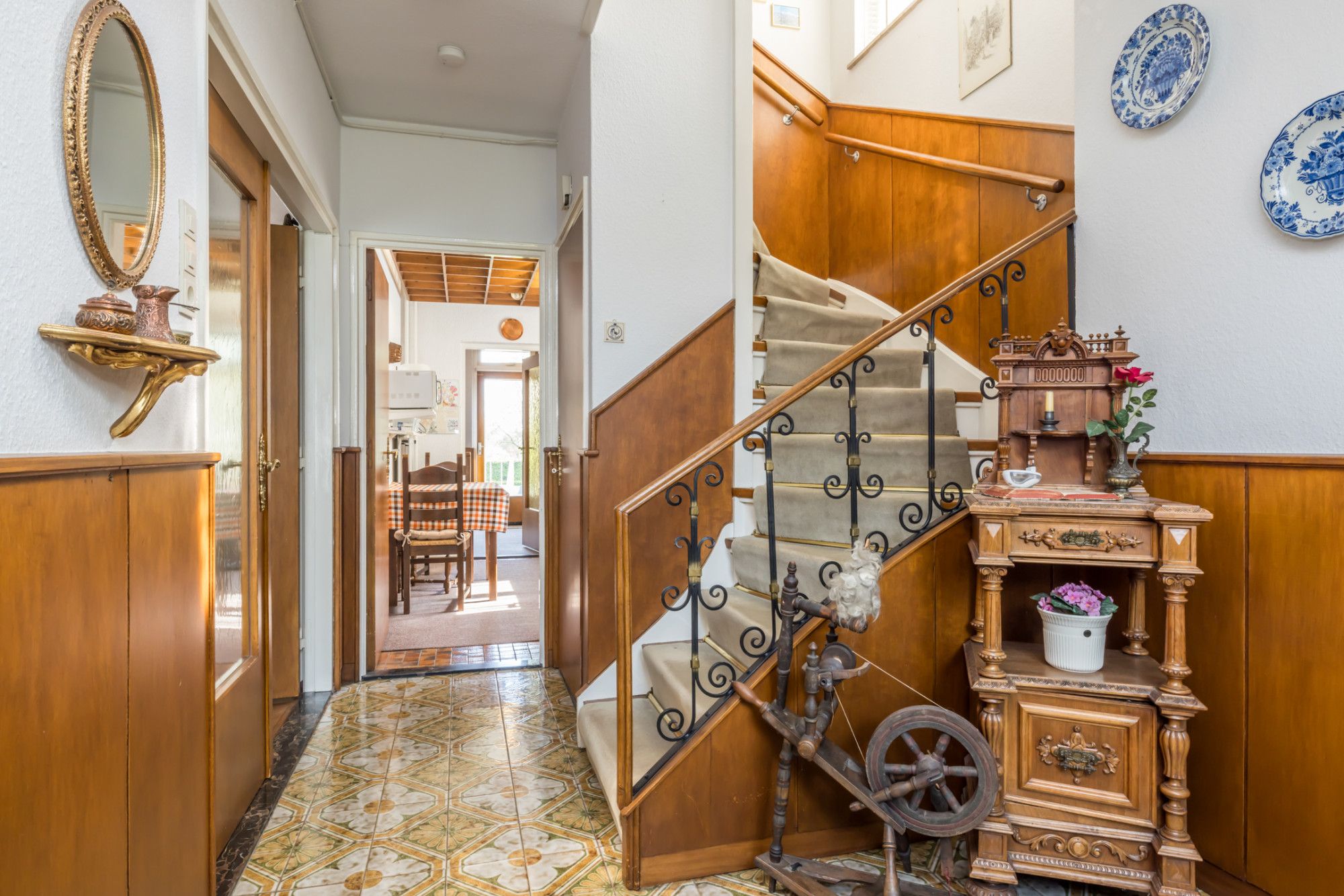 Entree. Ruime hal met tegelvloer, meterkast, fraaie trappartij en toegang naar de keuken en woonkamer. De woonkamer (39 m²) is voorzien van een hoogwaardige visgraatparketvloer, haardpartij en uitbouw aan de achterzijde. Gesloten keuken (9 m²) met rechte opstelling voorzien van de volgende apparatuur: keramische kookplaat, afzuigkap, oven, inbouwvaatwasser en koelkast. Zowel via de keuken als via de woonkamer te bereiken halletje met toiletruimte en toegang naar het balkon. Op het balkon heeft men een mooi uitzicht over de diepe achtertuin met vrijstaande garage. Verder is de tuin aangelegd met een terras en graszone.