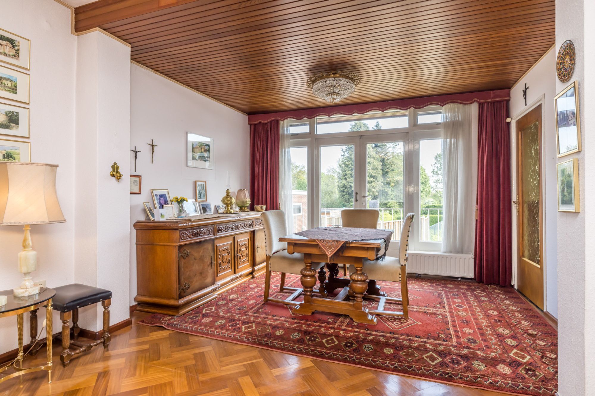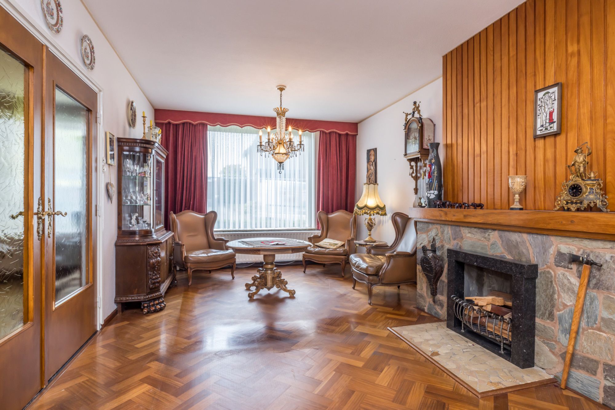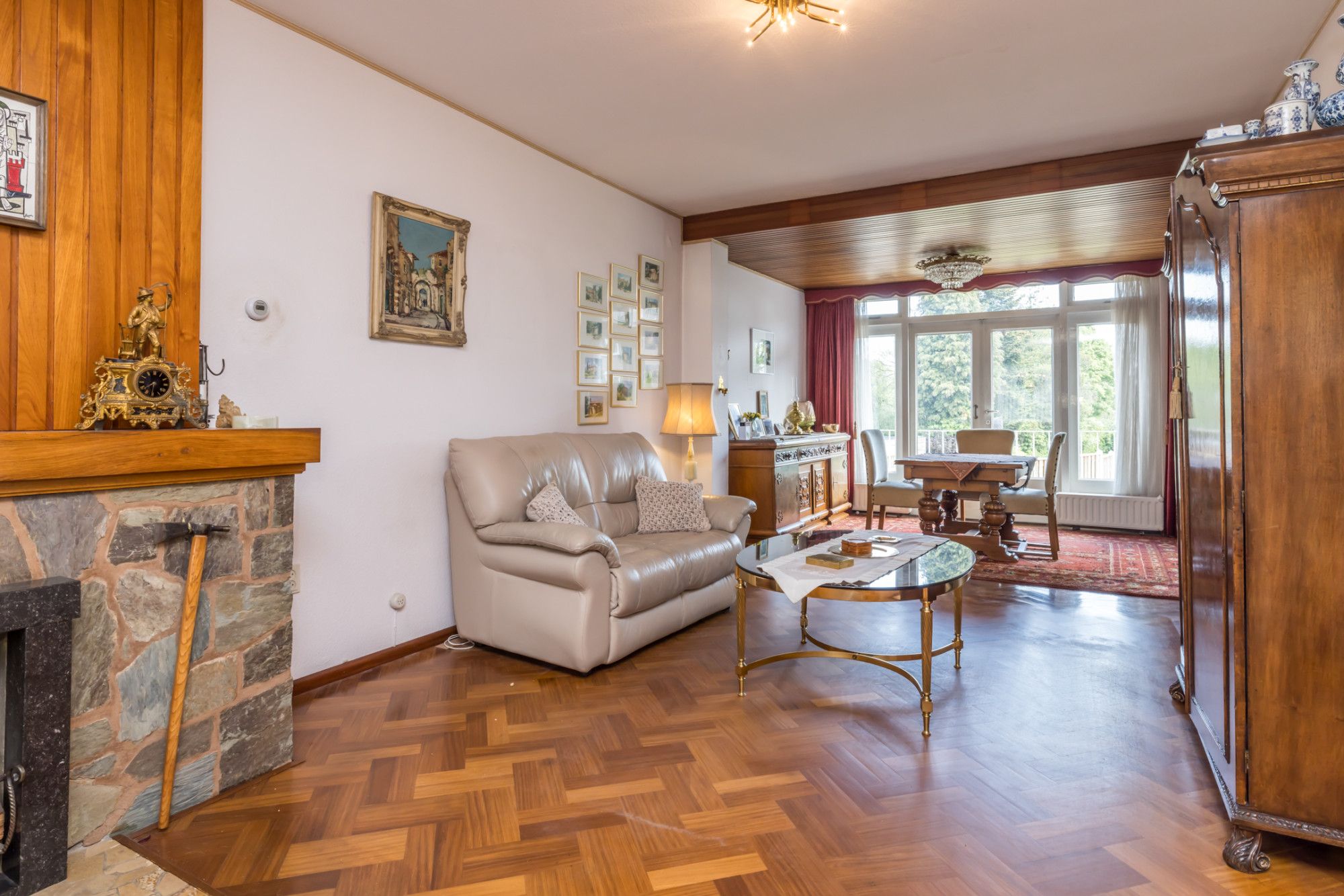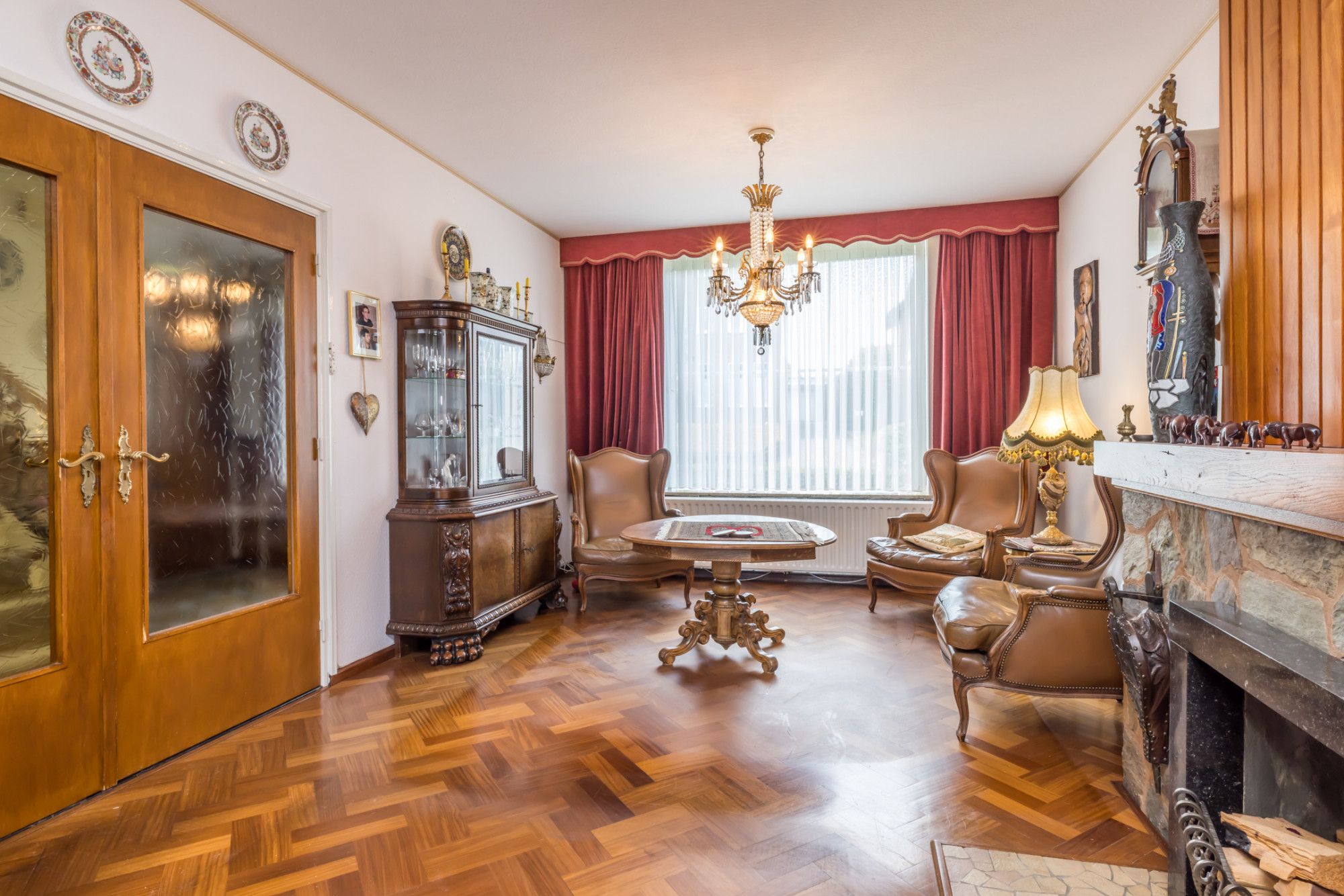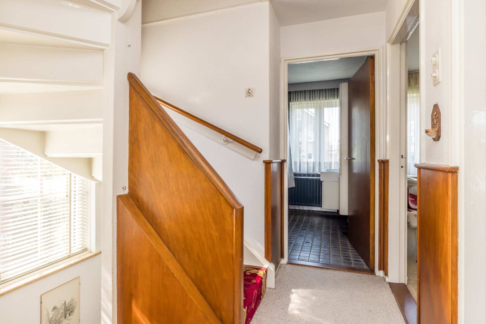 Entree. Ruime hal met tegelvloer, meterkast, fraaie trappartij en toegang naar de keuken en woonkamer. De woonkamer (39 m²) is voorzien van een hoogwaardige visgraatparketvloer, haardpartij en uitbouw aan de achterzijde. Gesloten keuken (9 m²) met rechte opstelling voorzien van de volgende apparatuur: keramische kookplaat, afzuigkap, oven, inbouwvaatwasser en koelkast. Zowel via de keuken als via de woonkamer te bereiken halletje met toiletruimte en toegang naar het balkon. Op het balkon heeft men een mooi uitzicht over de diepe achtertuin met vrijstaande garage. Verder is de tuin aangelegd met een terras en graszone.
