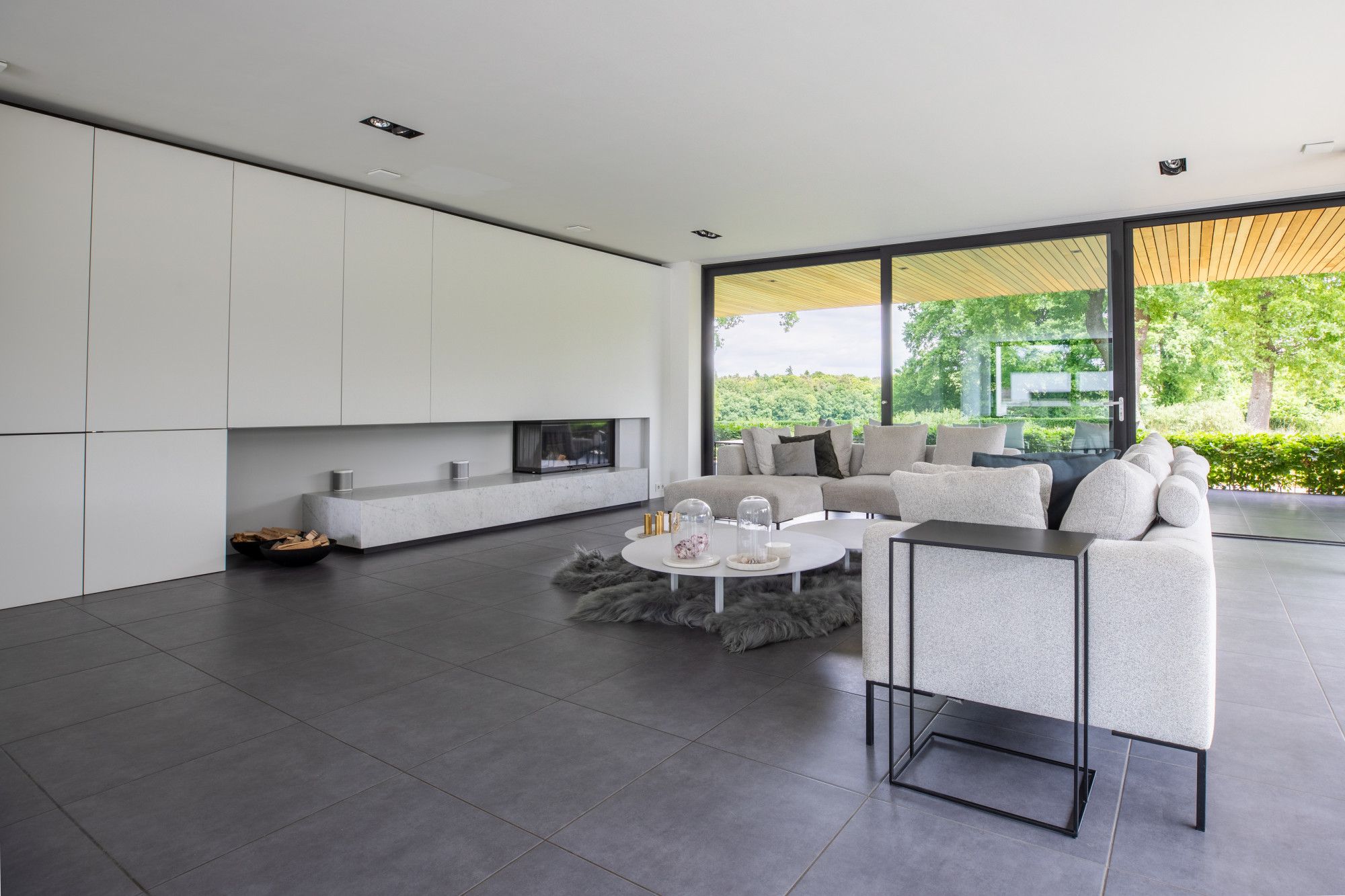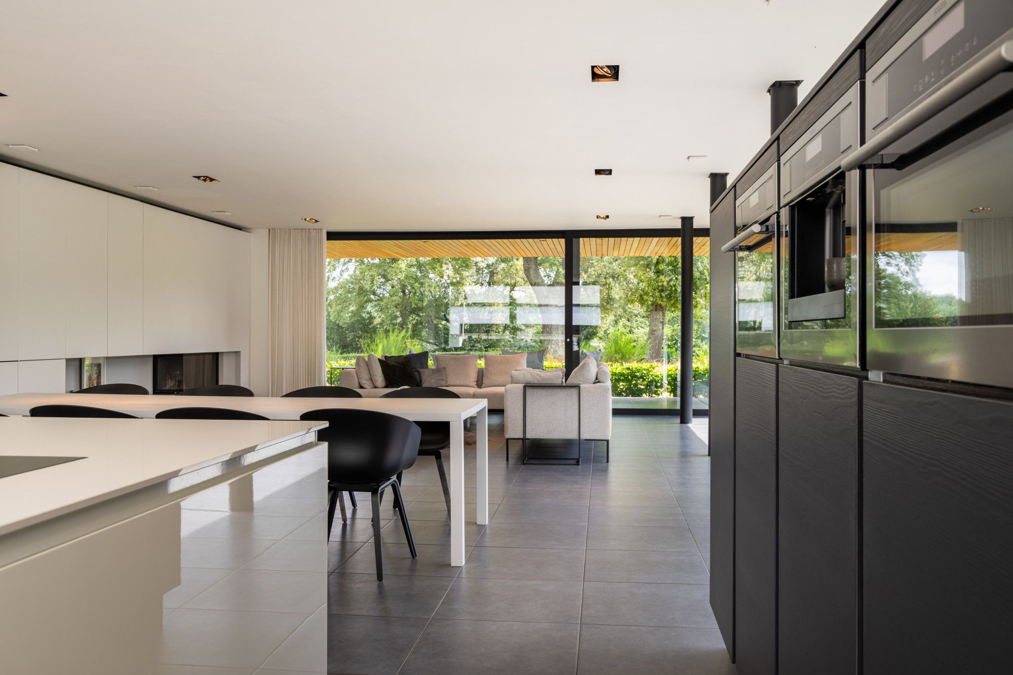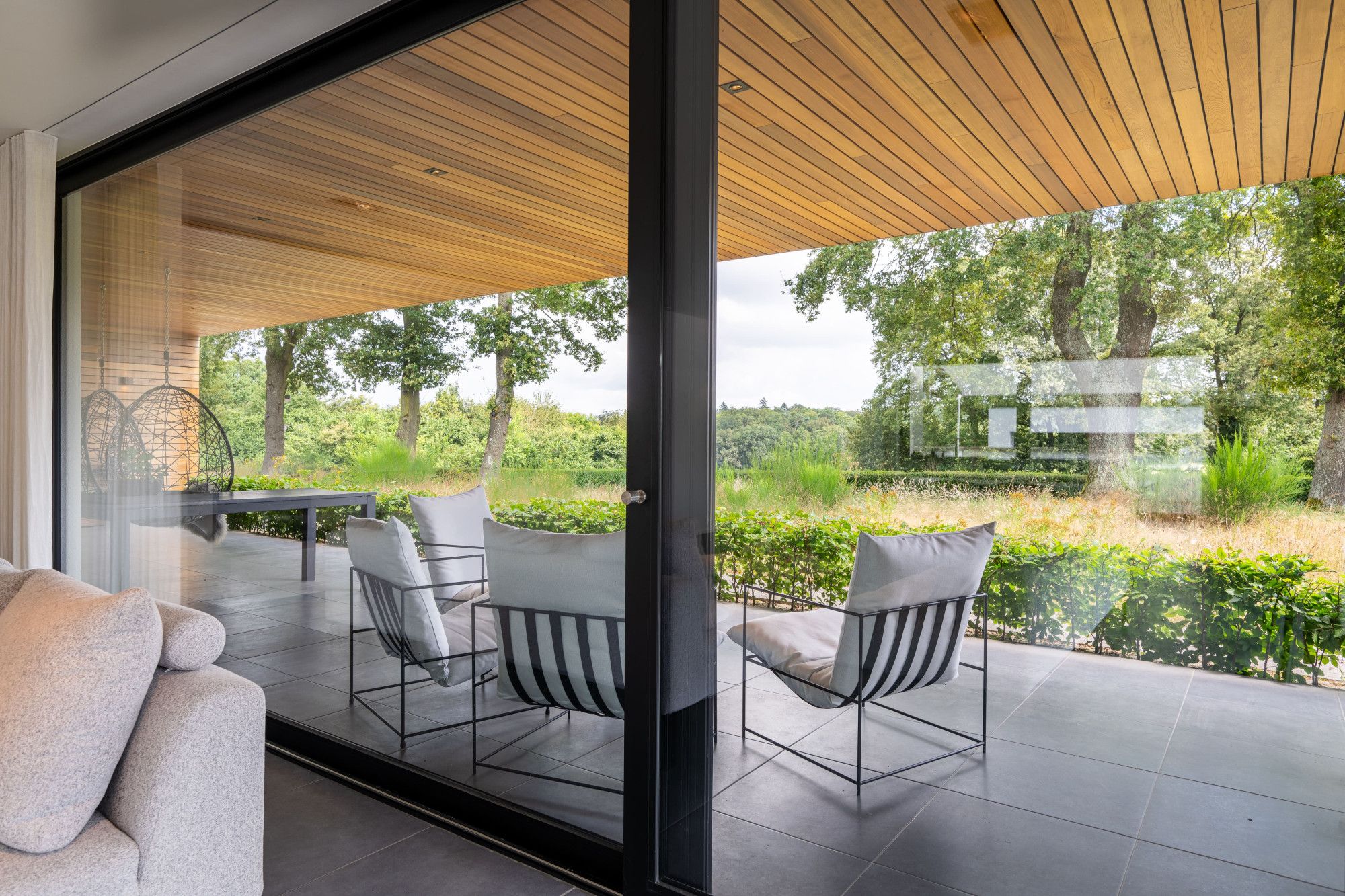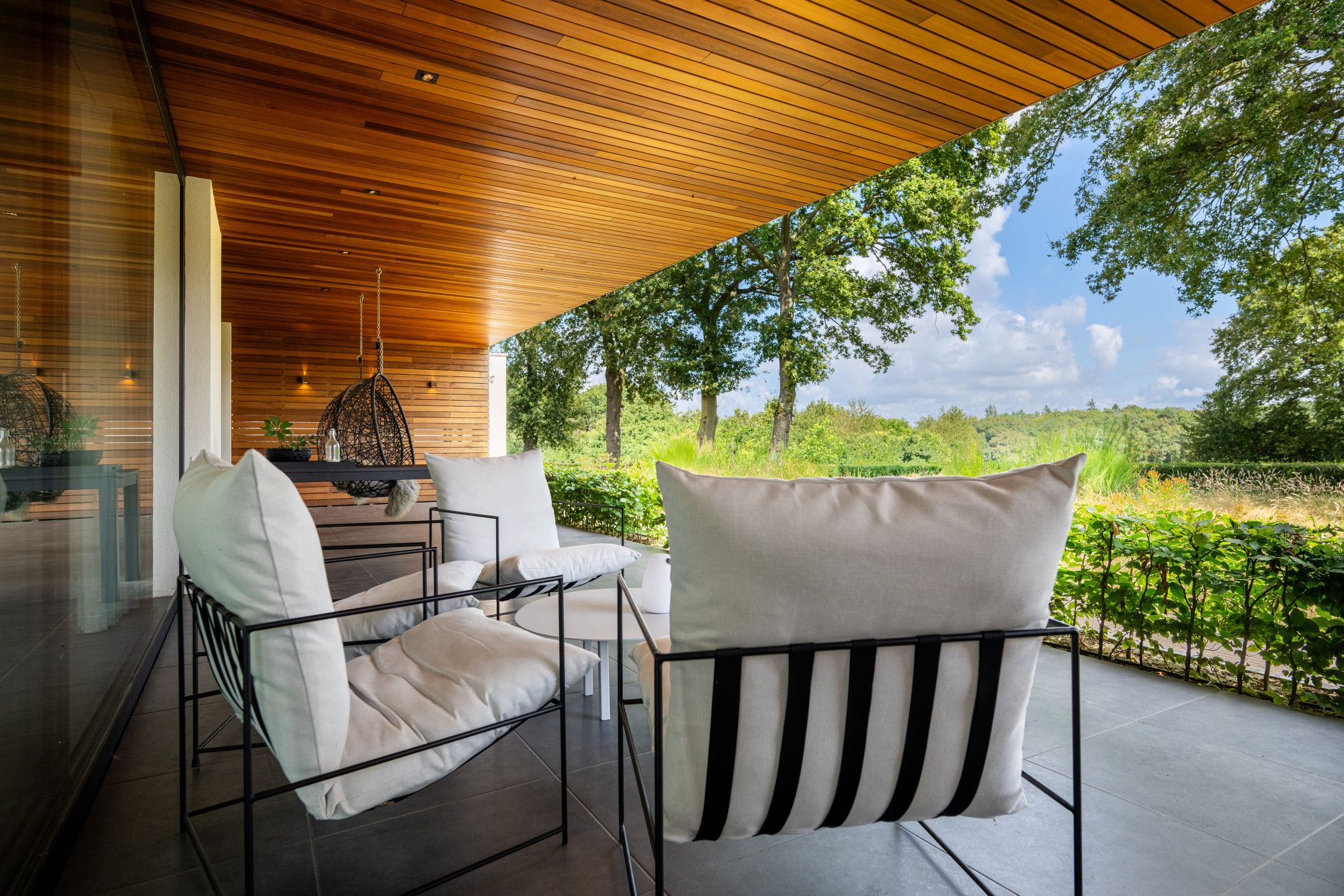 De voordeur is bereikbaar via een hellingbaan. Vanuit de hal komt meteen de ruimtelijkheid van de villa tot uitdrukking. Aan de rechterzijde zijn een ruime garderobe, het gastentoilet en de studeerkamer (circa 3,67m x 3,08m). Aan de linkerzijde zijn de ouderslaapkamer, de walk-in closet en de eerste badkamer. Vanuit de ouderslaapkamer (circa 4,85m x 3,33m) geniet u van een prachtig uitzicht over de groene omgeving. Via een schuifpui is het overdekt terras bereikbaar. De luxe badkamer (circa 4,55m x 2,80m) is ingericht met ligbad, inloopdouche en dubbel wastafelmeubel met Vola kranen. De lichte woonkamer en keuken zijn samen grofweg 90m² groot en aan drie zijden voorzien van kamerhoge glaspartijen. De keuken is aan de voorzijde gesitueerd en ingericht met een kookeiland en een apparatenwand. De keuken beschikt over hoogwaardige inbouwapparatuur. Vanuit de keuken is het riante balkon via een schuifpui aan de voorzijde toegankelijk. Hier kunt u genieten van de ondergaande zon. Via de woonkamer kijkt u uit op het natuurgebied. In de winter is het heerlijk vertoeven rondom de open haard. Vanuit de woonkamer gaat u via de schuifpui naar het riante en meest mooie overdekte terras dat u zich voor kunt stellen. U geniet hier elk seizoen en in alle privacy van het fantastische vrije uitzicht en de rust.