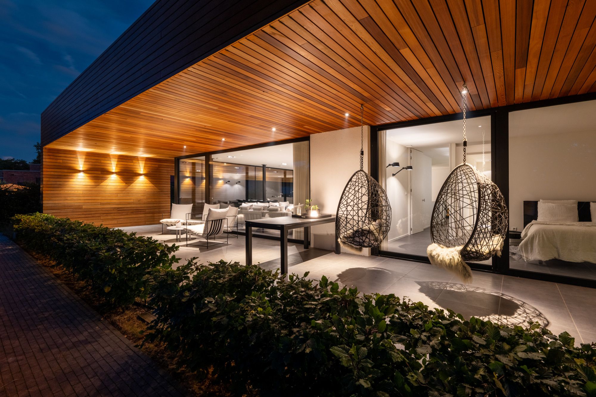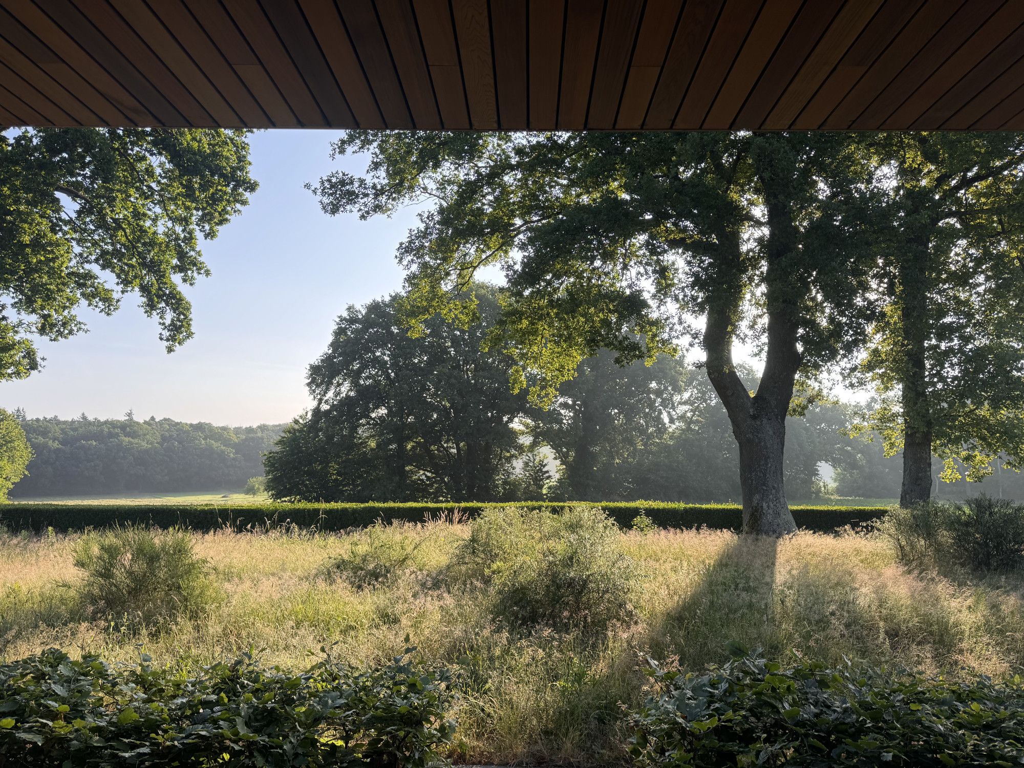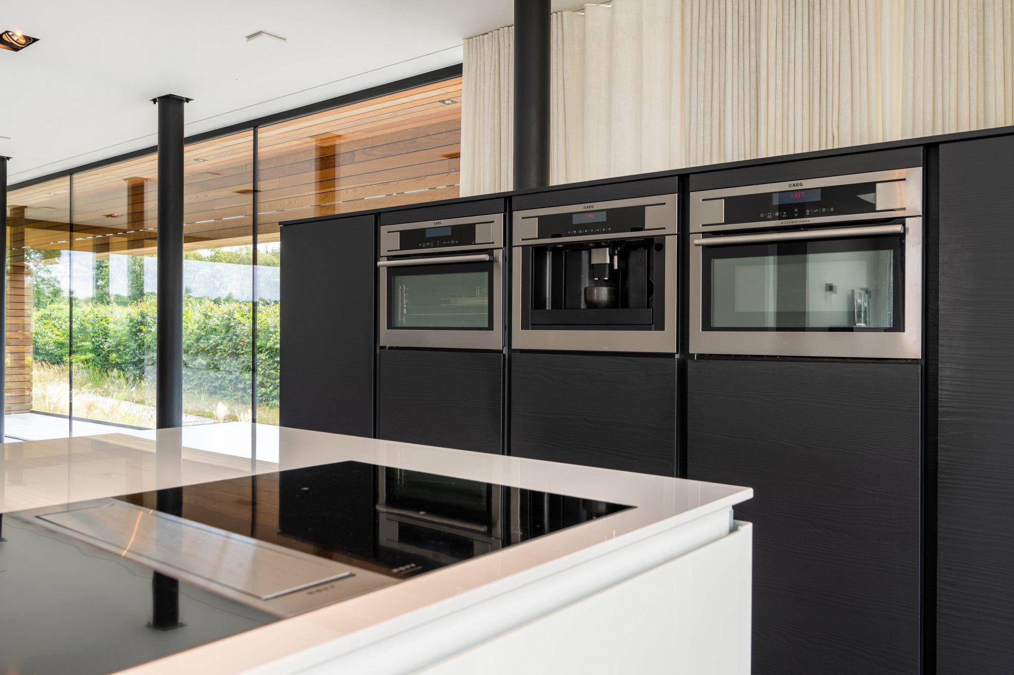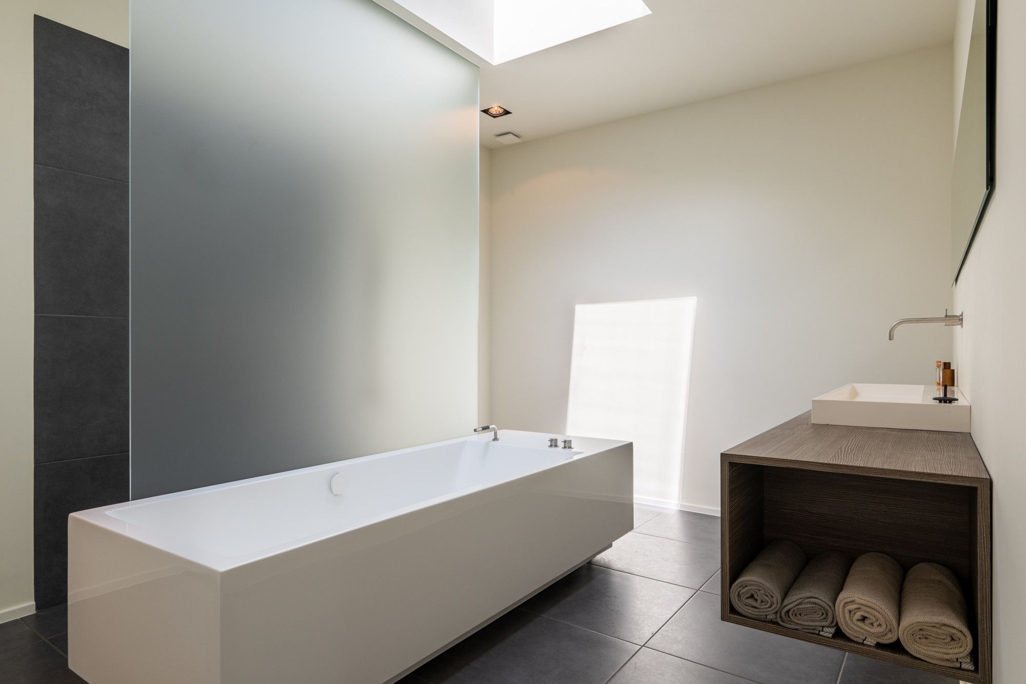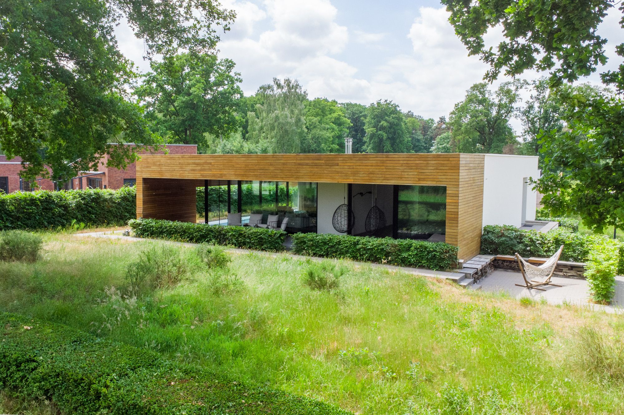 De voordeur is bereikbaar via een hellingbaan. Vanuit de hal komt meteen de ruimtelijkheid van de villa tot uitdrukking. Aan de rechterzijde zijn een ruime garderobe, het gastentoilet en de studeerkamer (circa 3,67m x 3,08m). Aan de linkerzijde zijn de ouderslaapkamer, de walk-in closet en de eerste badkamer. Vanuit de ouderslaapkamer (circa 4,85m x 3,33m) geniet u van een prachtig uitzicht over de groene omgeving. Via een schuifpui is het overdekt terras bereikbaar. De luxe badkamer (circa 4,55m x 2,80m) is ingericht met ligbad, inloopdouche en dubbel wastafelmeubel met Vola kranen. De lichte woonkamer en keuken zijn samen grofweg 90m² groot en aan drie zijden voorzien van kamerhoge glaspartijen. De keuken is aan de voorzijde gesitueerd en ingericht met een kookeiland en een apparatenwand. De keuken beschikt over hoogwaardige inbouwapparatuur. Vanuit de keuken is het riante balkon via een schuifpui aan de voorzijde toegankelijk. Hier kunt u genieten van de ondergaande zon. Via de woonkamer kijkt u uit op het natuurgebied. In de winter is het heerlijk vertoeven rondom de open haard. Vanuit de woonkamer gaat u via de schuifpui naar het riante en meest mooie overdekte terras dat u zich voor kunt stellen. U geniet hier elk seizoen en in alle privacy van het fantastische vrije uitzicht en de rust.