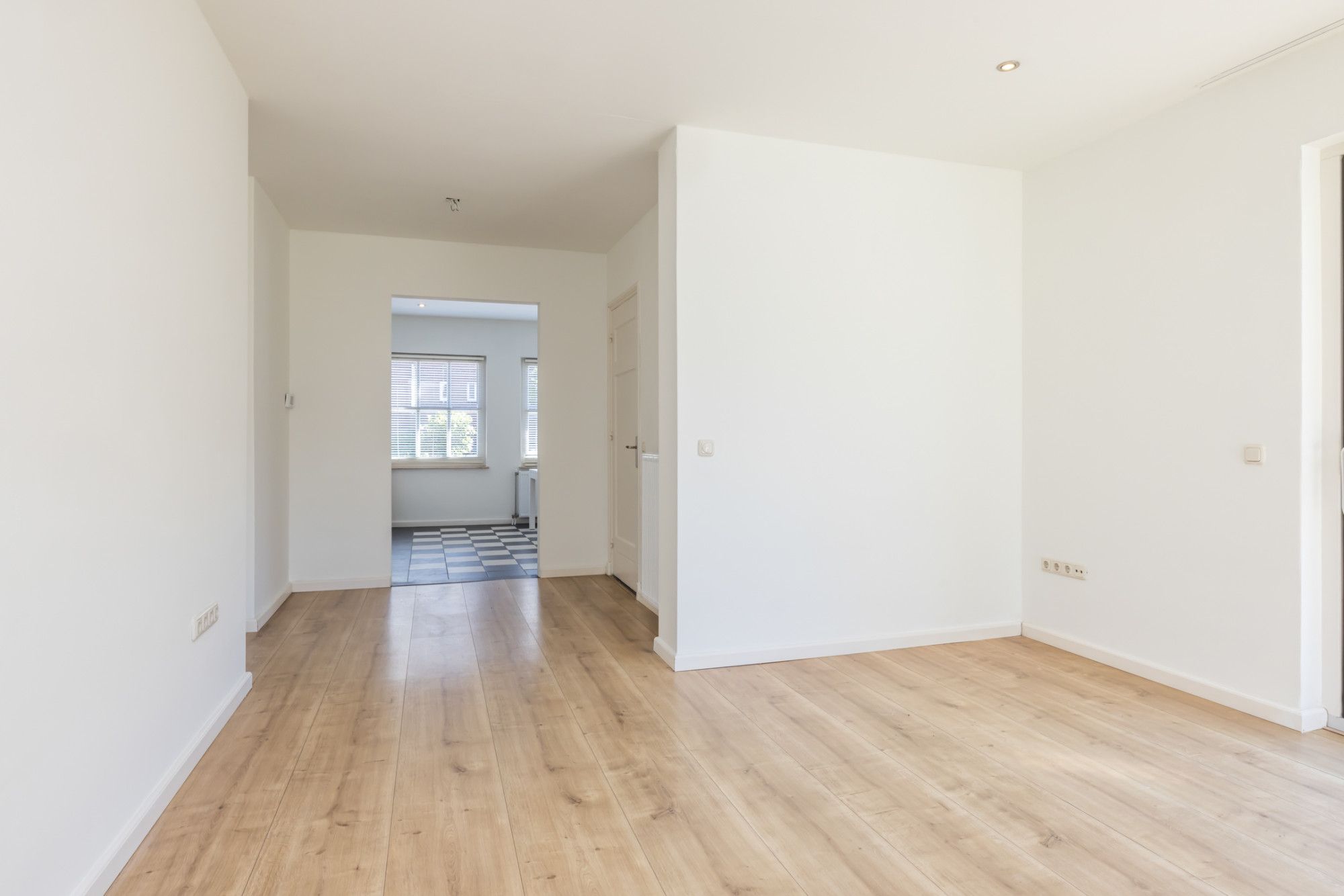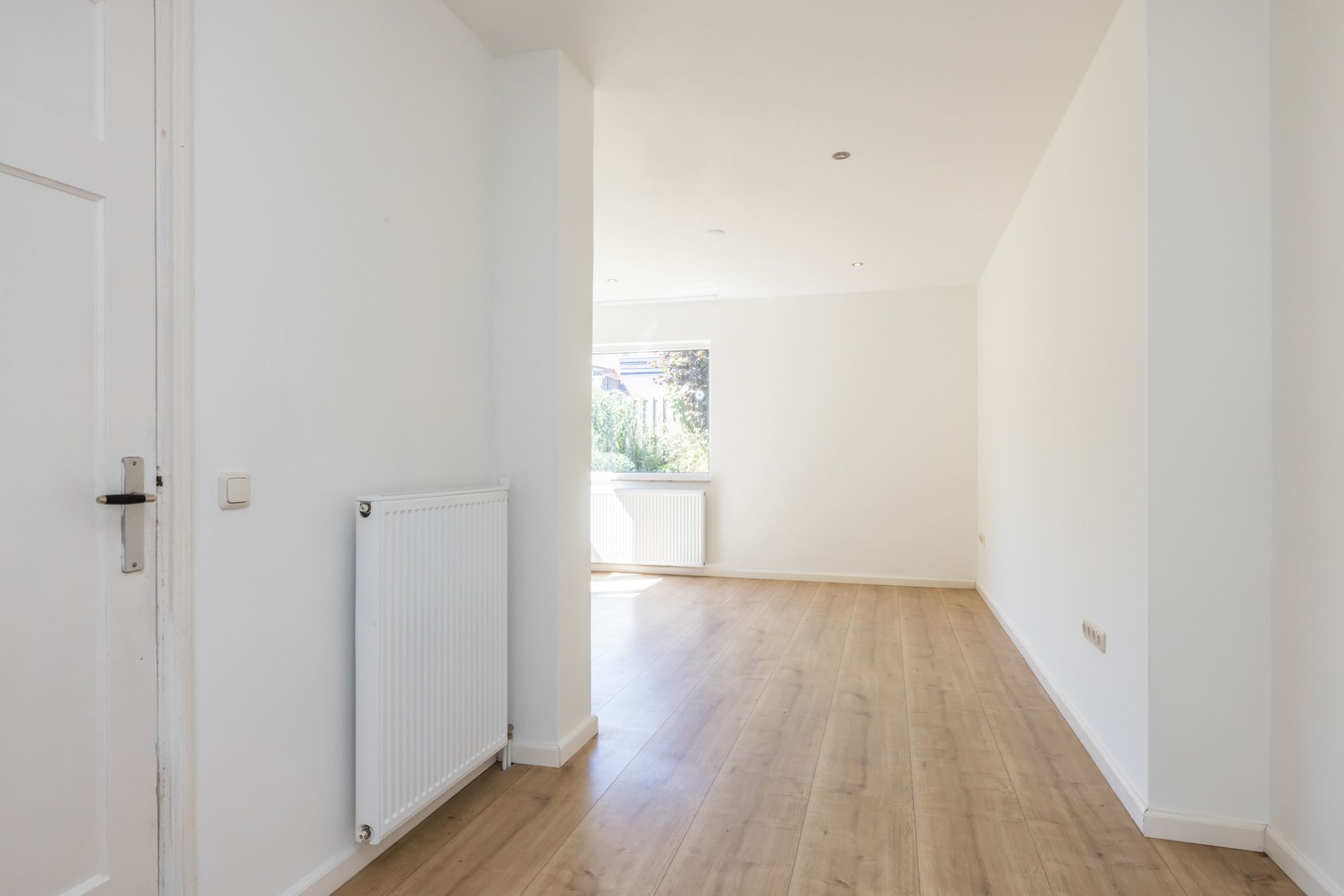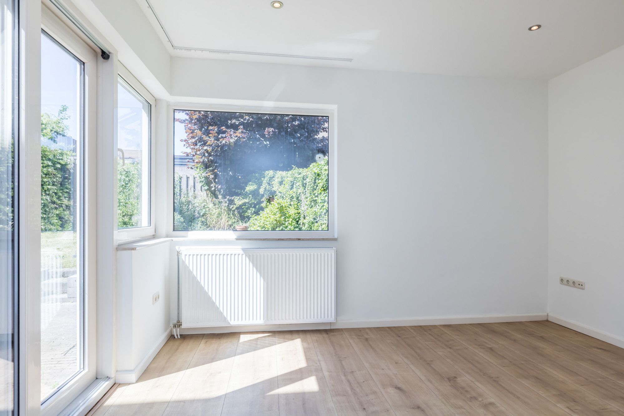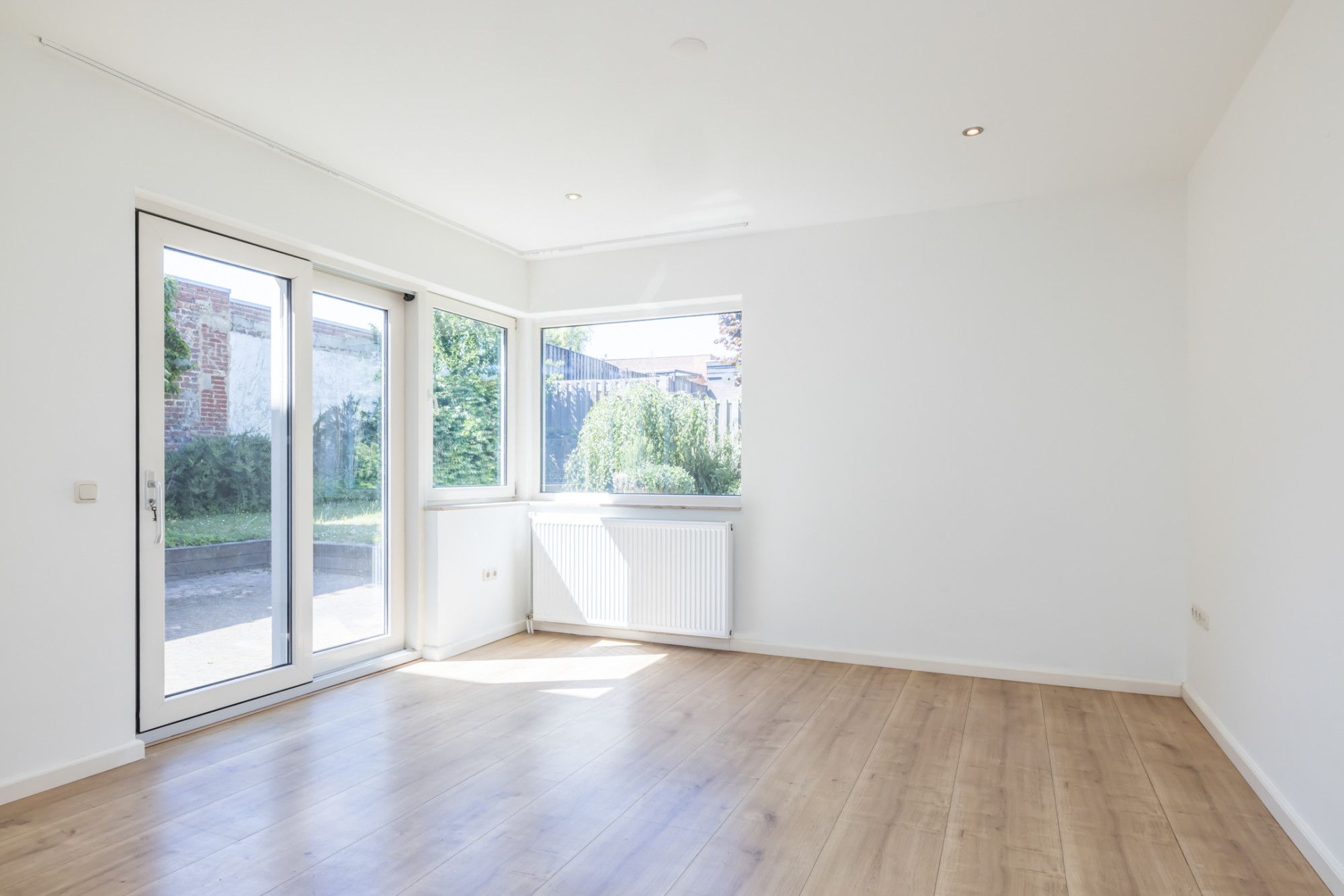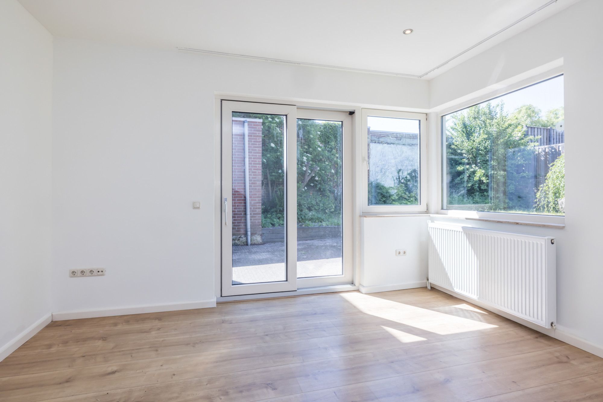 Lichte, netjes afgewerkte woonkamer met optimaal tuincontact.