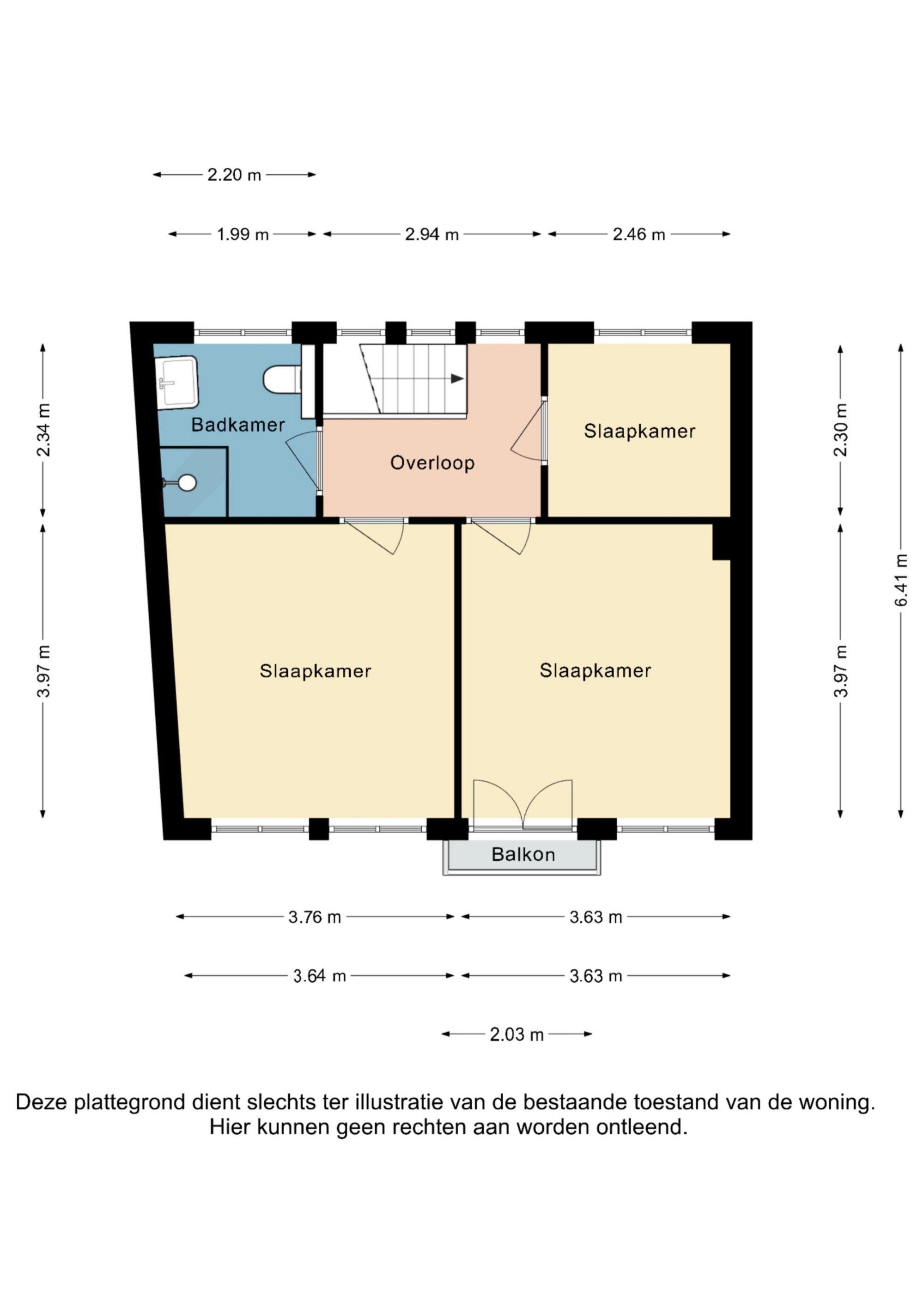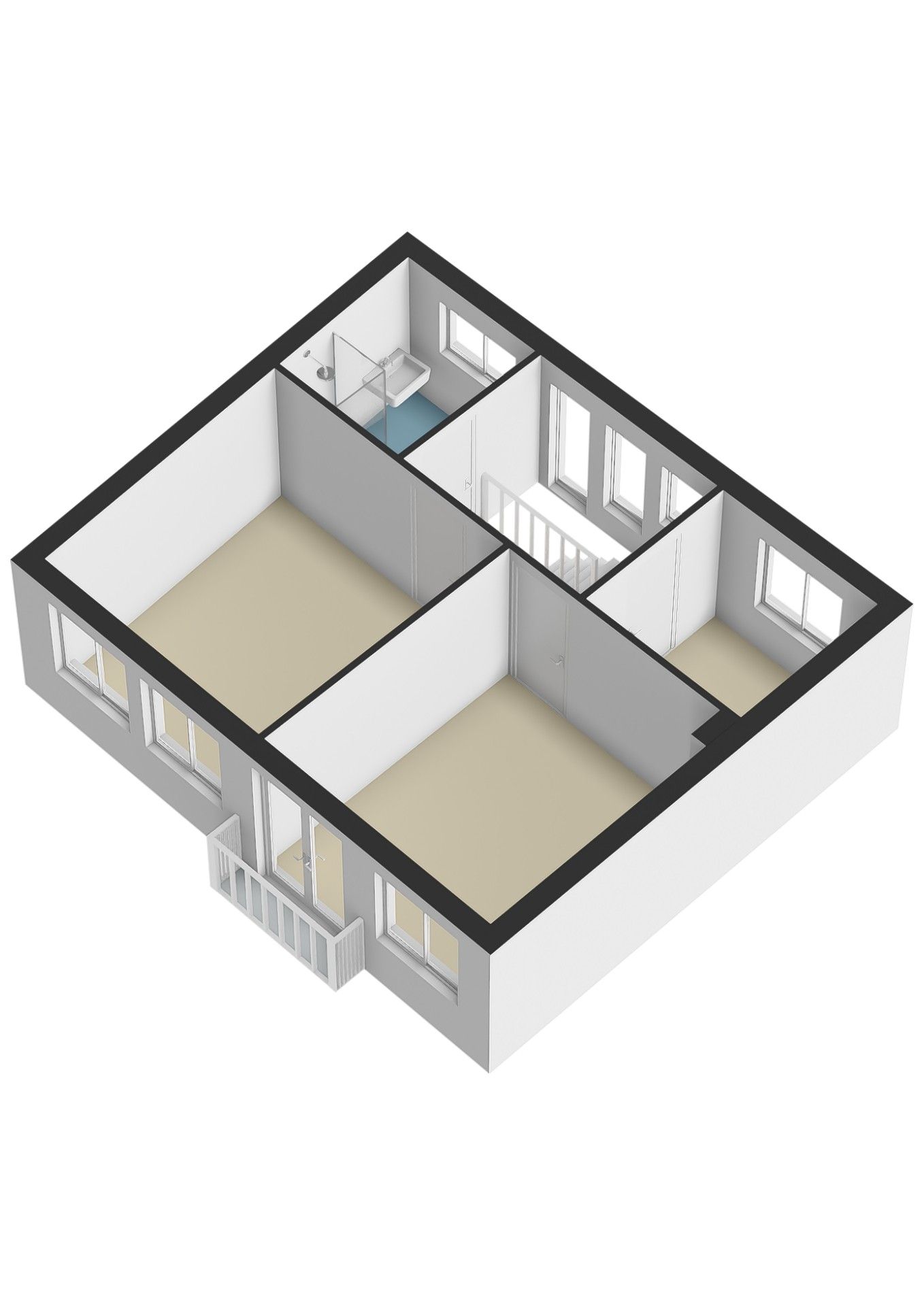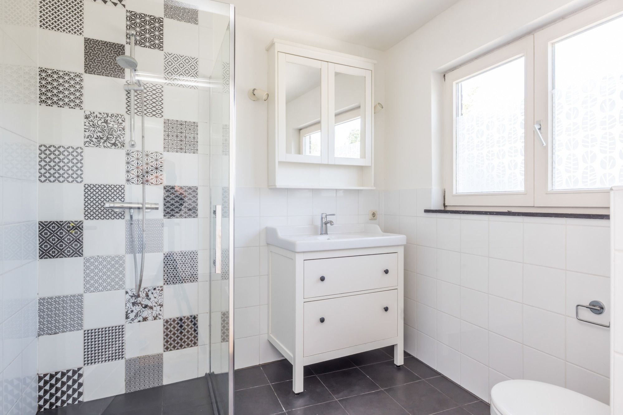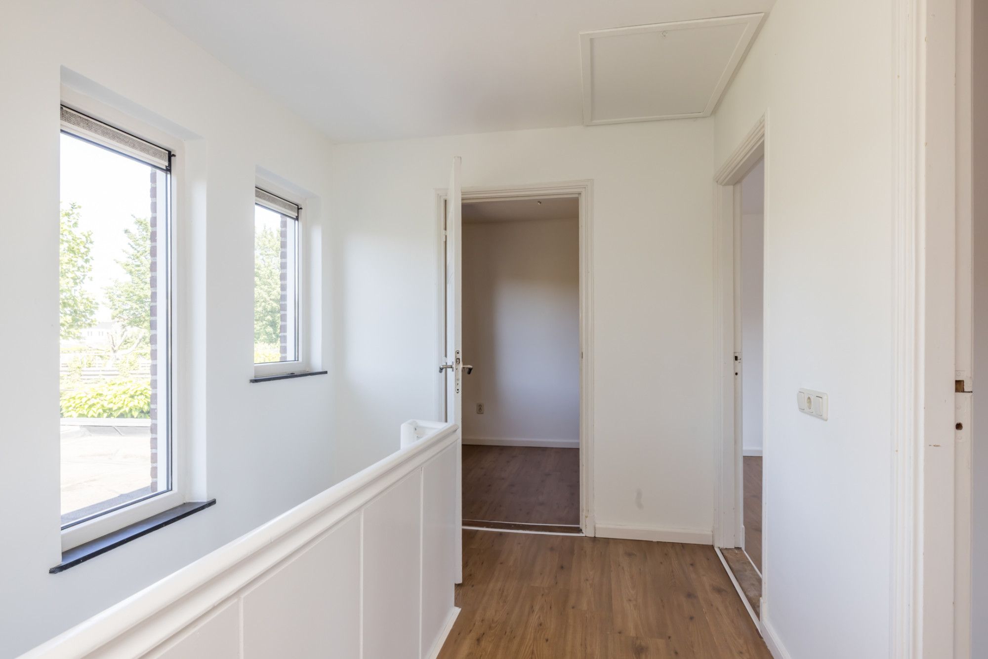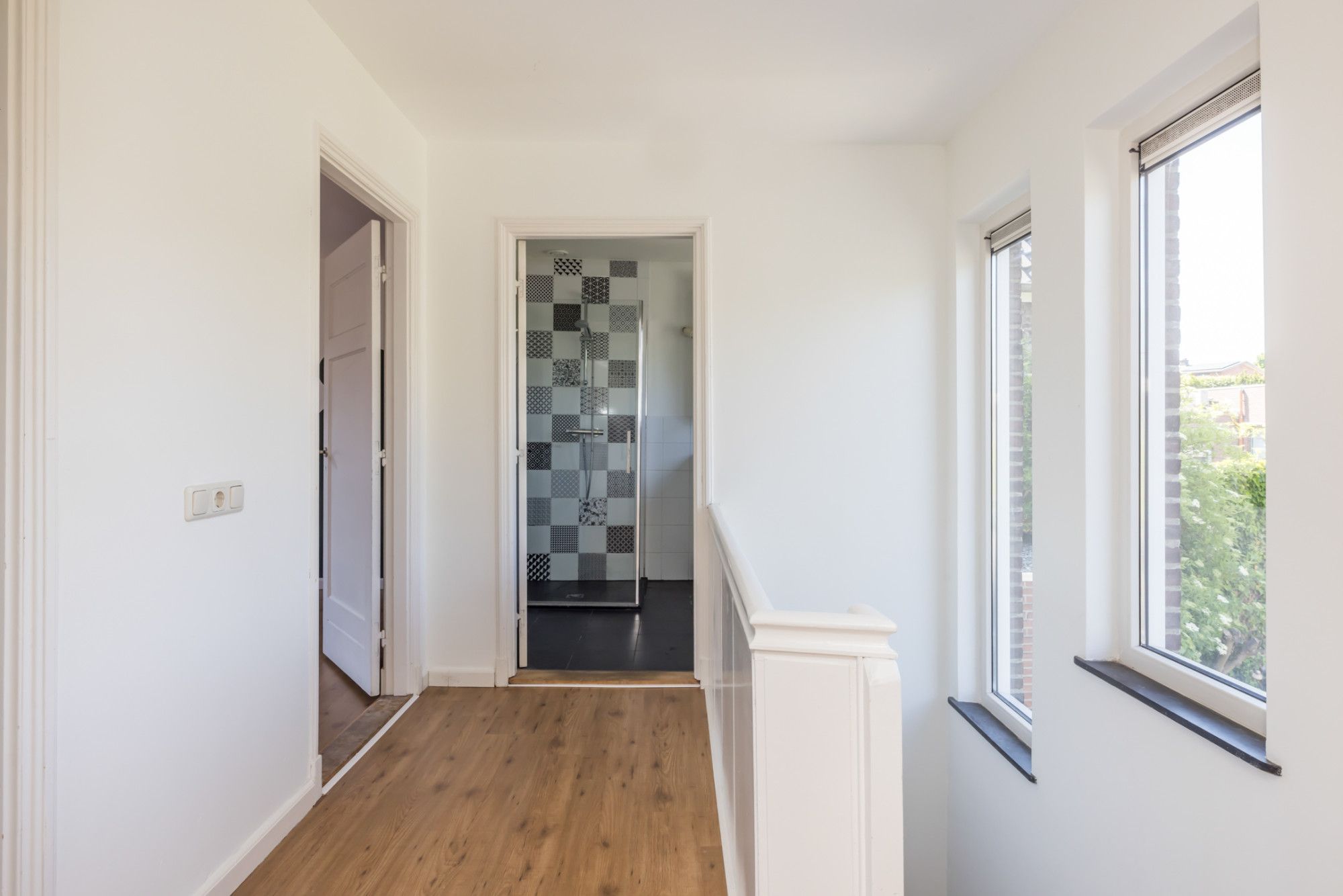 Overloop, 3 slaapkamers en nette badkamer voorzien van douche, wastafel, toilet.