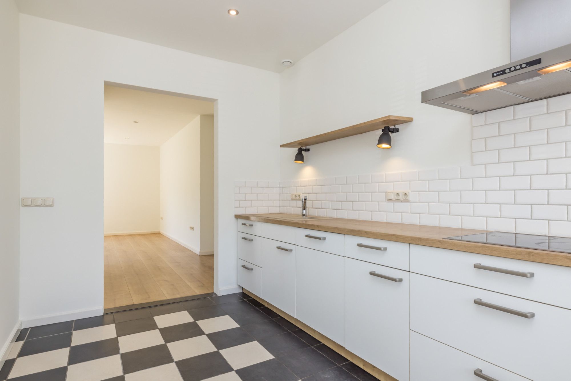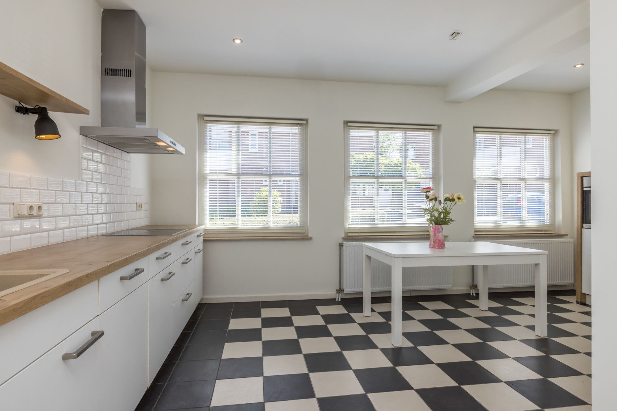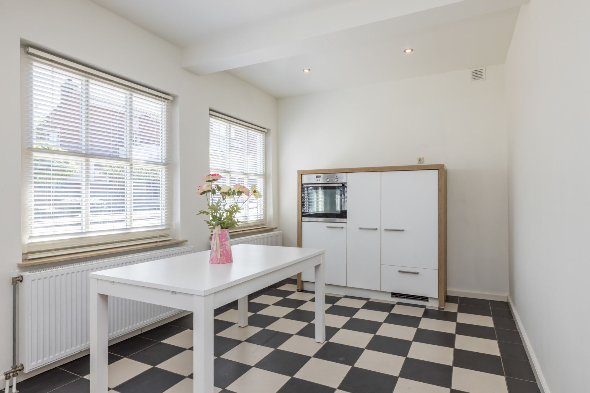 Speelse indeling met duidelijke scheiding tussen keuken (aan straatzijde) en woonkamer aan de tuinzijde.