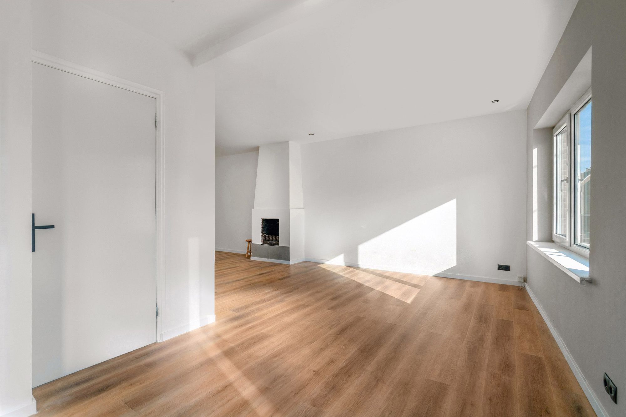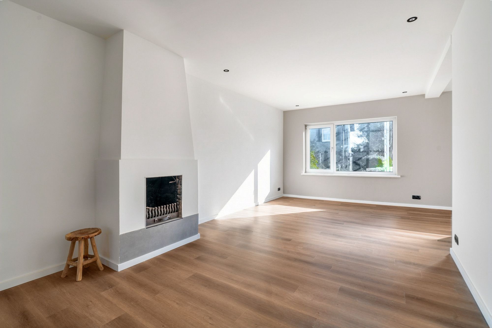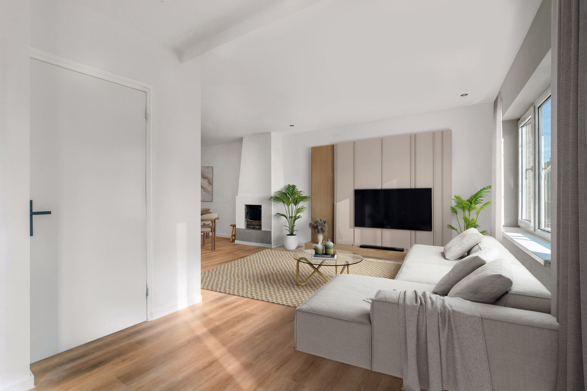 De ruime L-vormige woonkamer biedt een prettige leefruimte en is voorzien van een sfeervolle open haard, wat zorgt voor een warme en gezellige uitstraling.