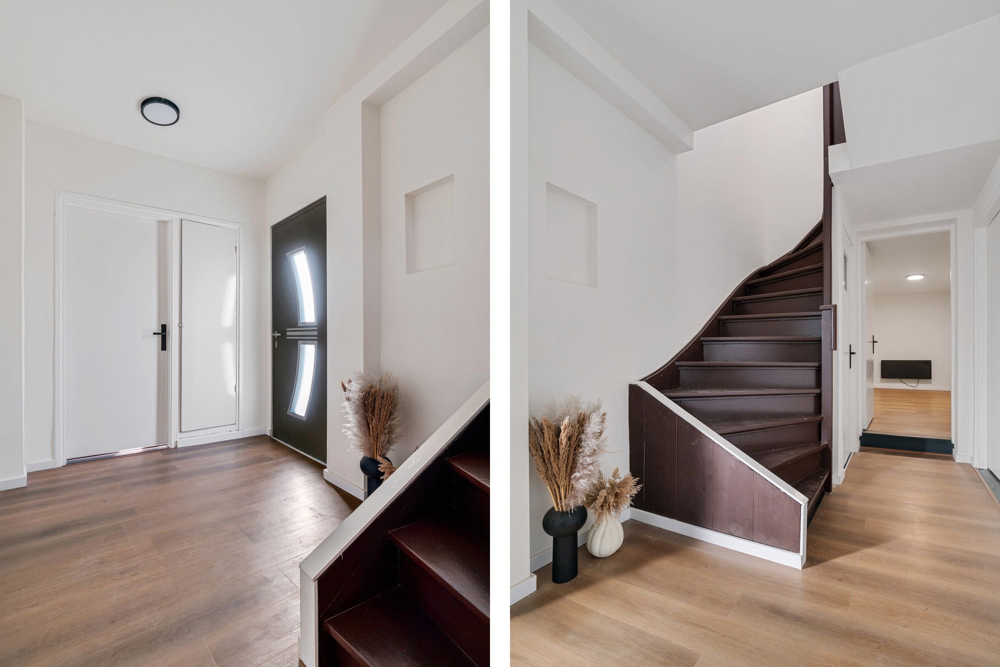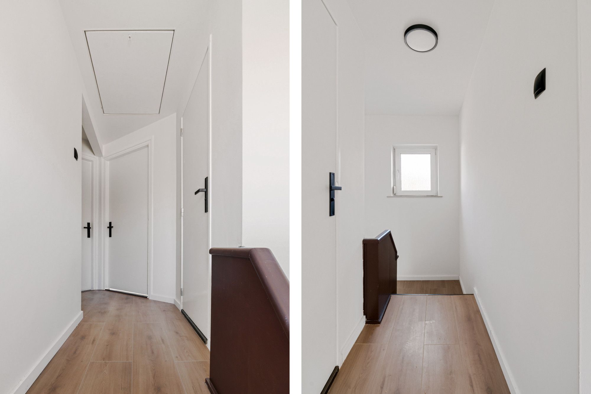 De overloop met bordes geeft toegang tot drie ruime slaapkamers. Ook deze verdieping is voorzien van een laminaatvloer, wat zorgt voor een rustige en uniforme uitstraling.